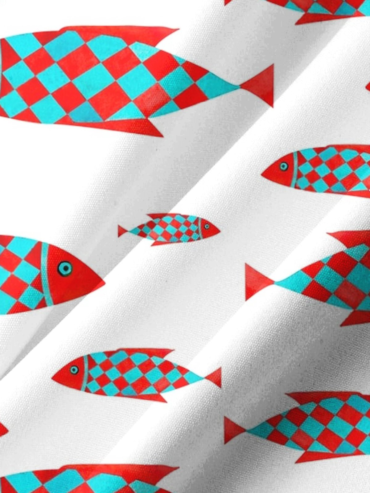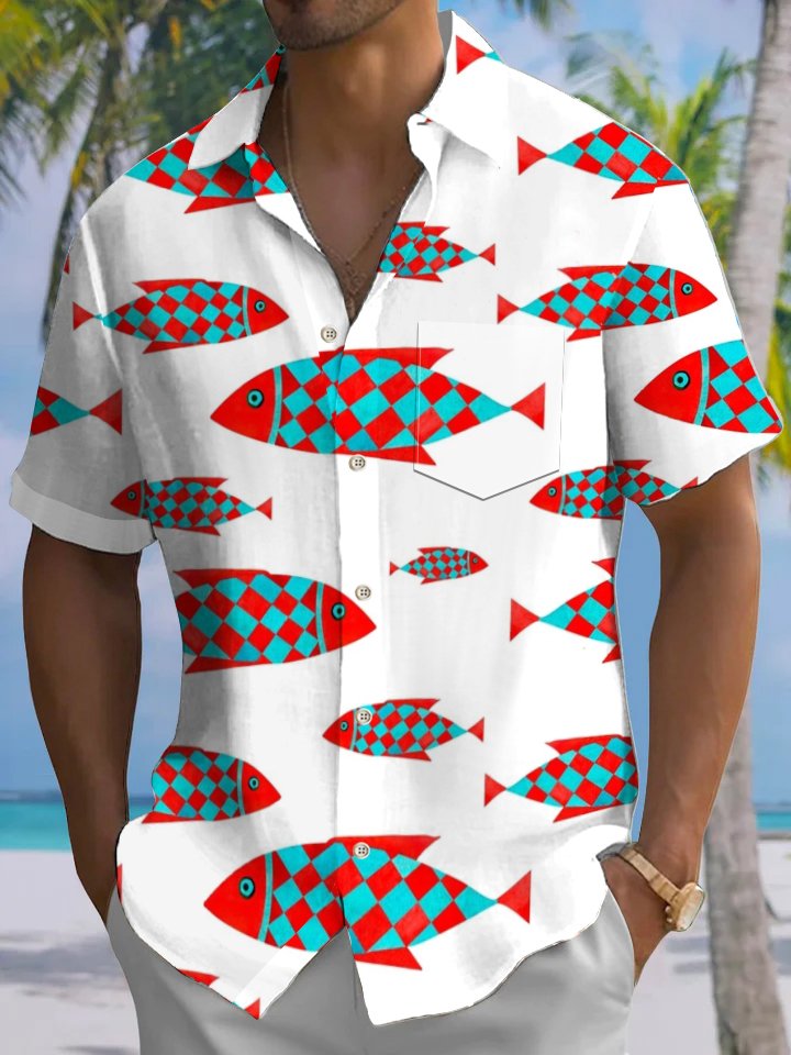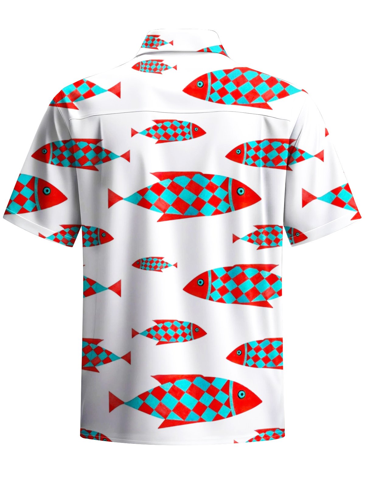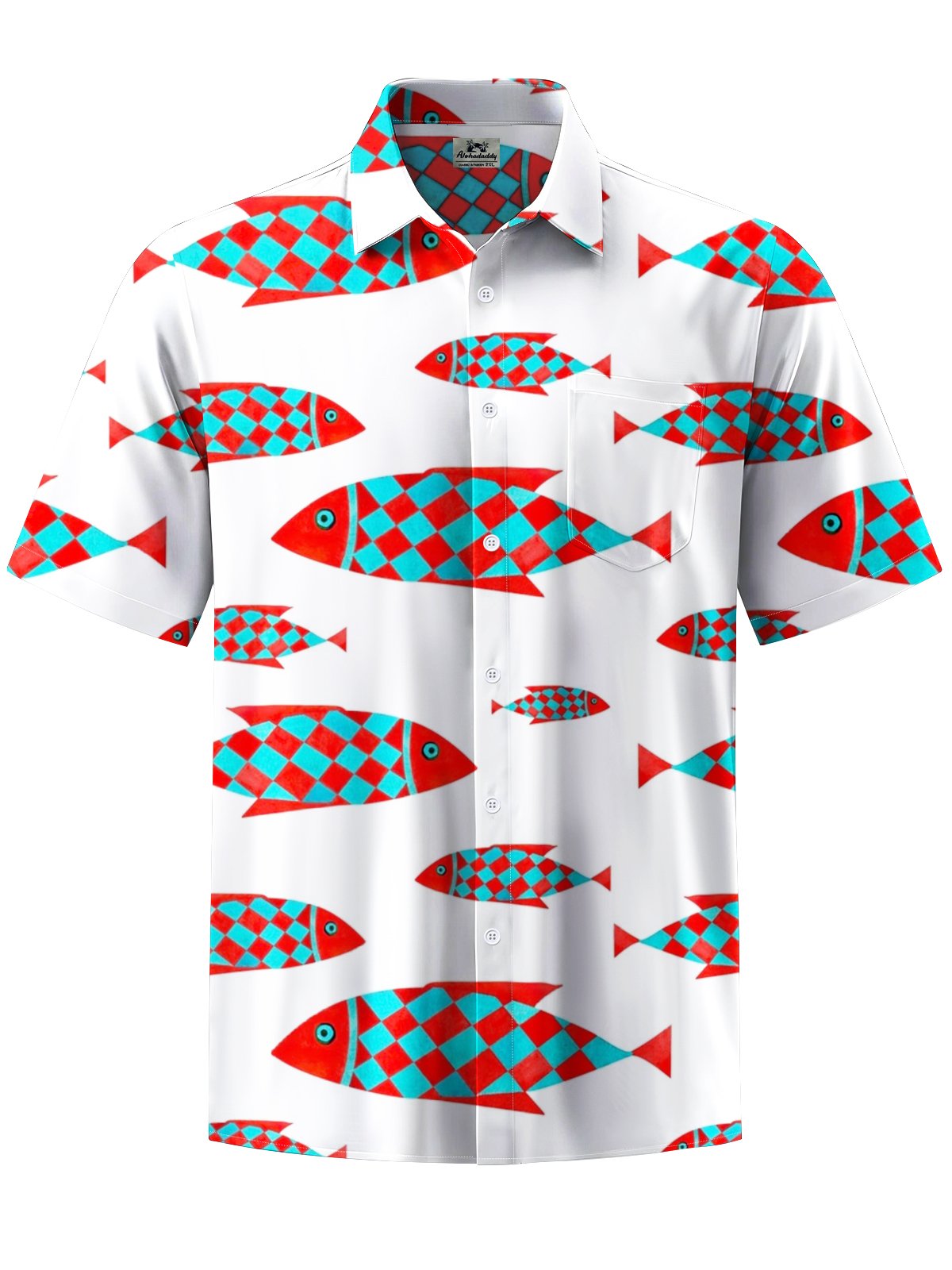 Alohadaddy® Men's Casual Cartoon Fish Printed Chest Pocket Short Sleeve Shirt Big & Tall