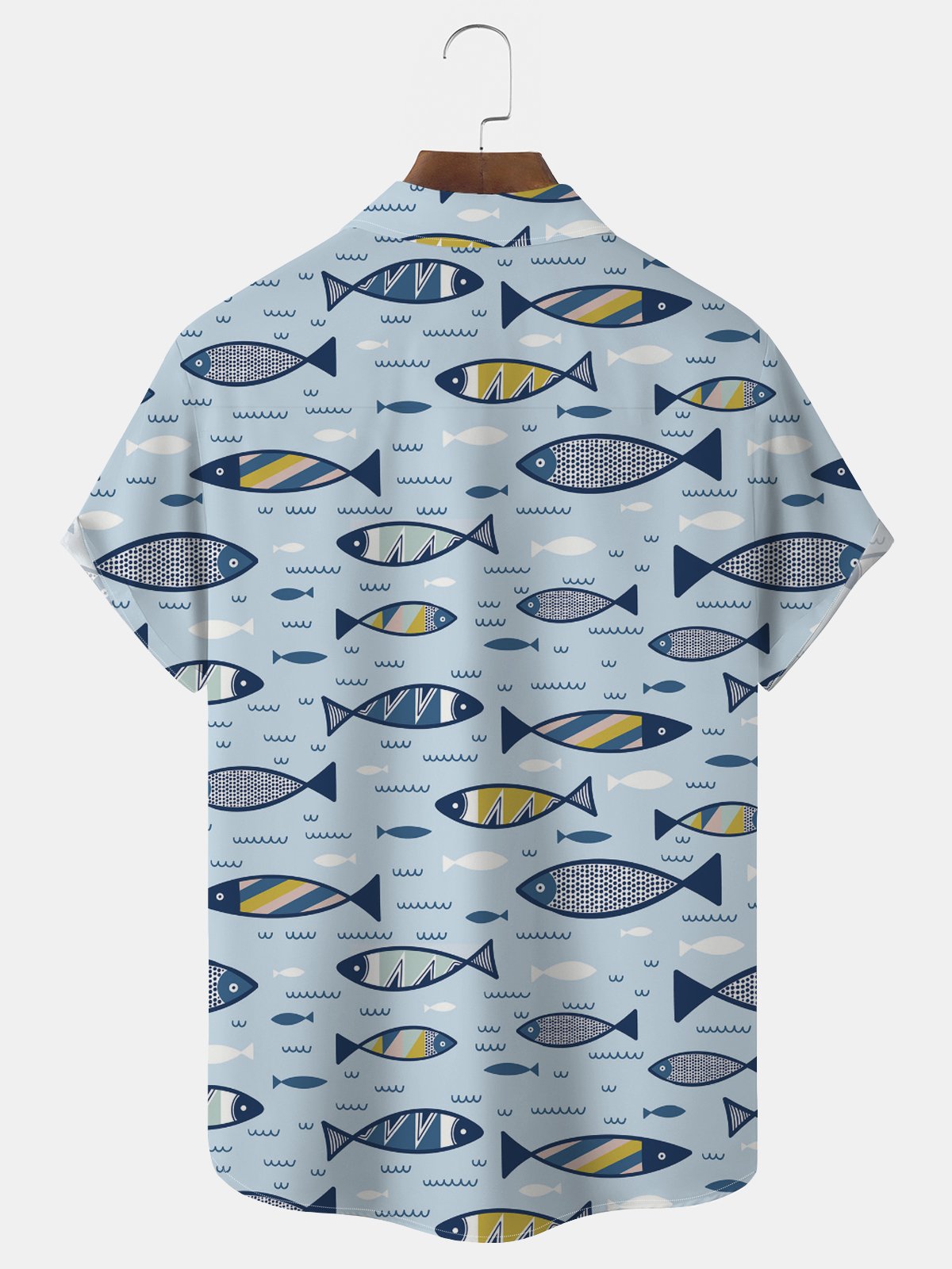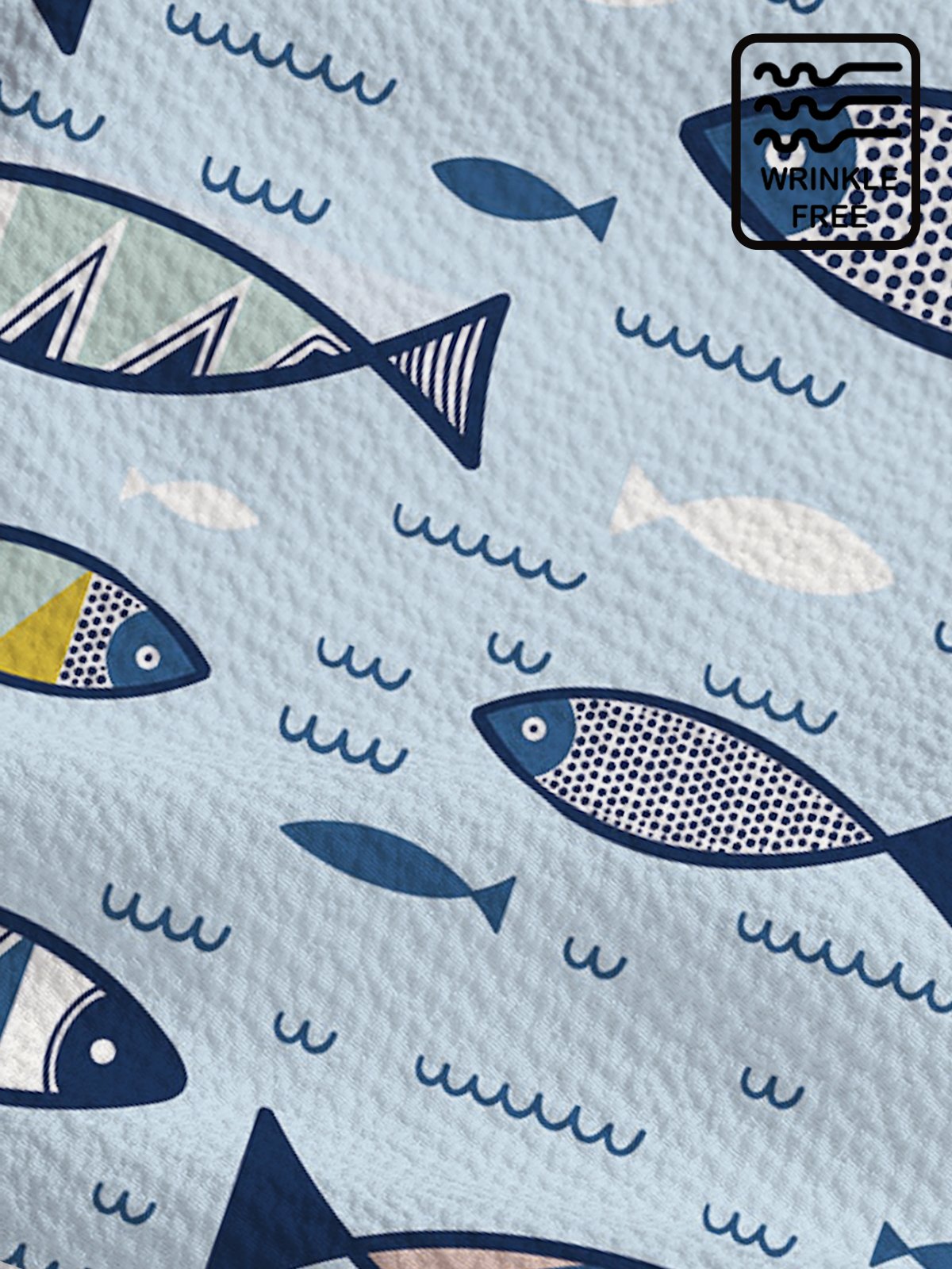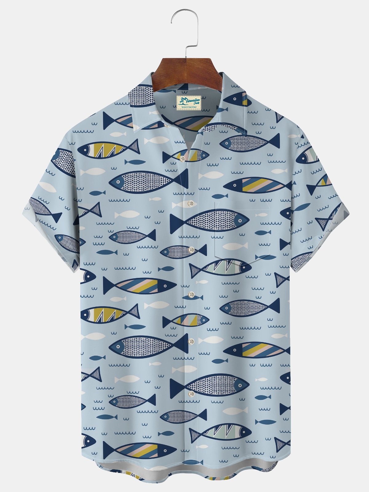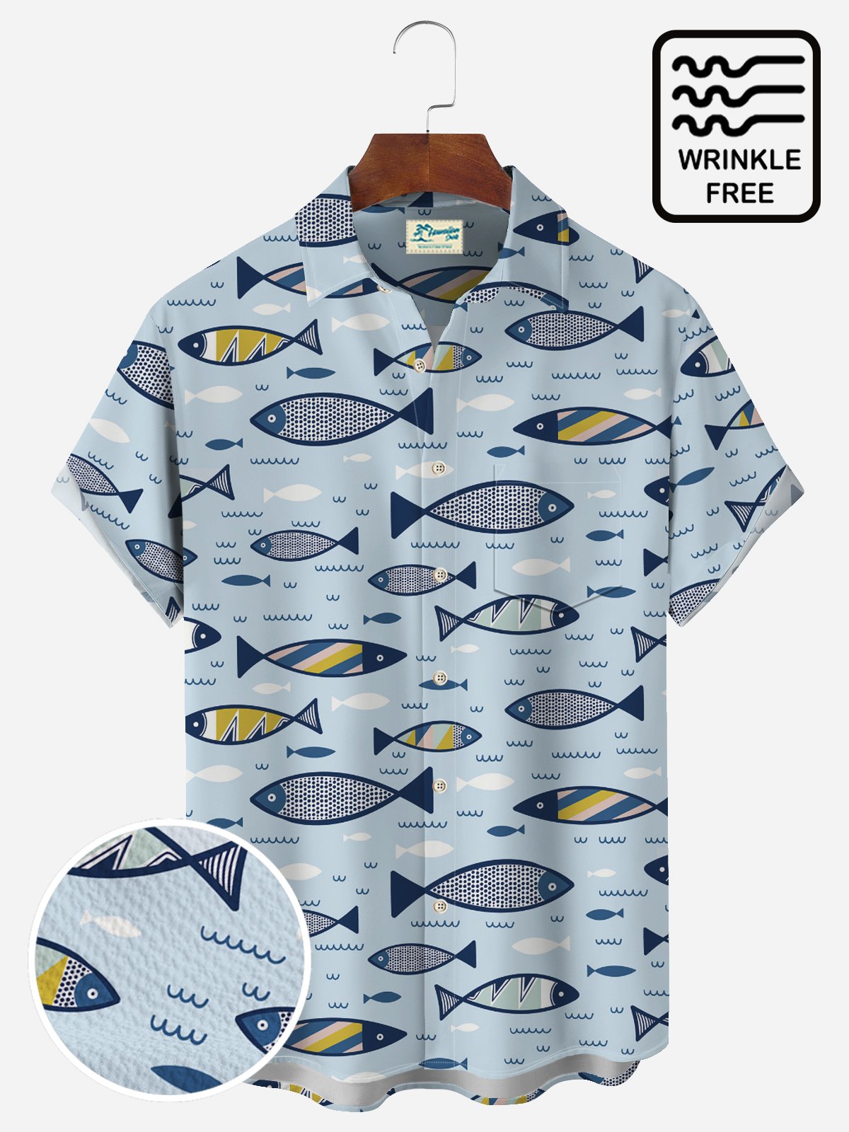 Alohadaddy Holiday Beach Blue Men's Hawaiian Shirts Ocean Fish Animal Art Stretch Wrinkle Free Seersucker Pocket Shirt Big Tall