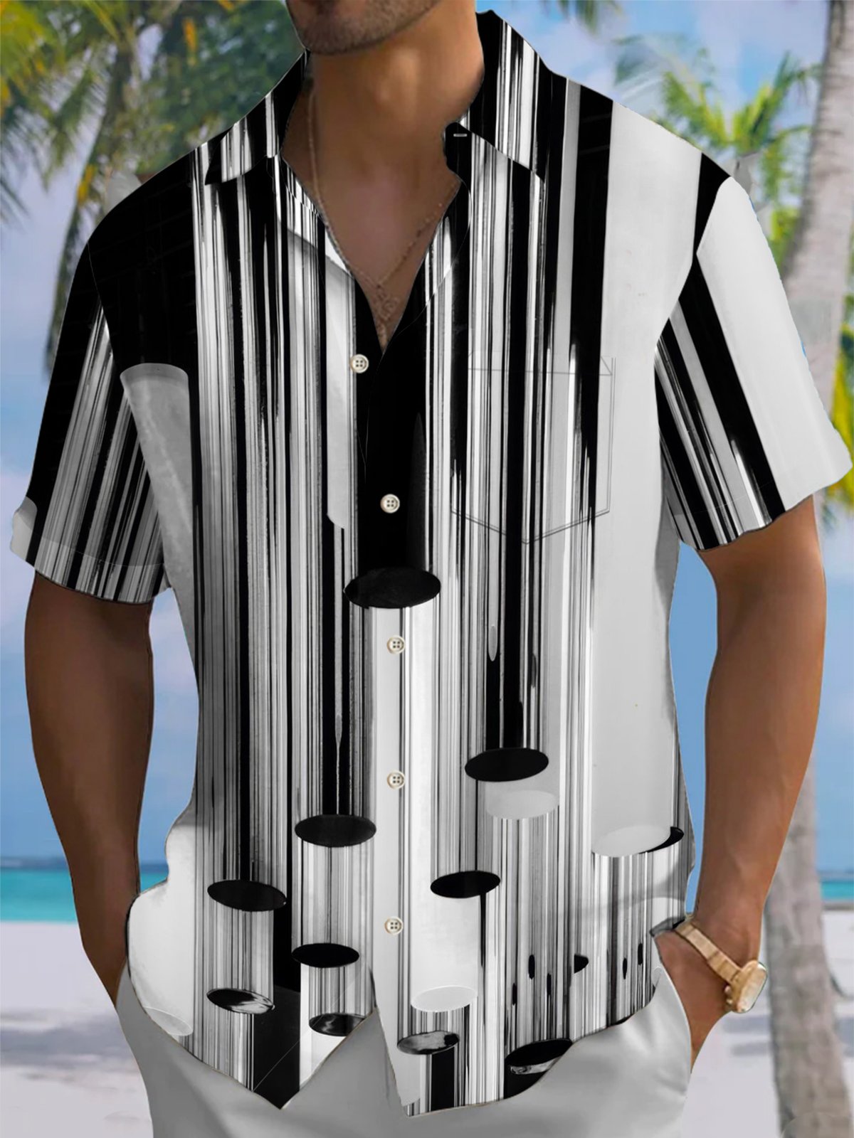 Alohadaddy® Casual Geometric Stripe Print Art Pocket Stretch Men's Short Sleeve Shirt Big & Tall