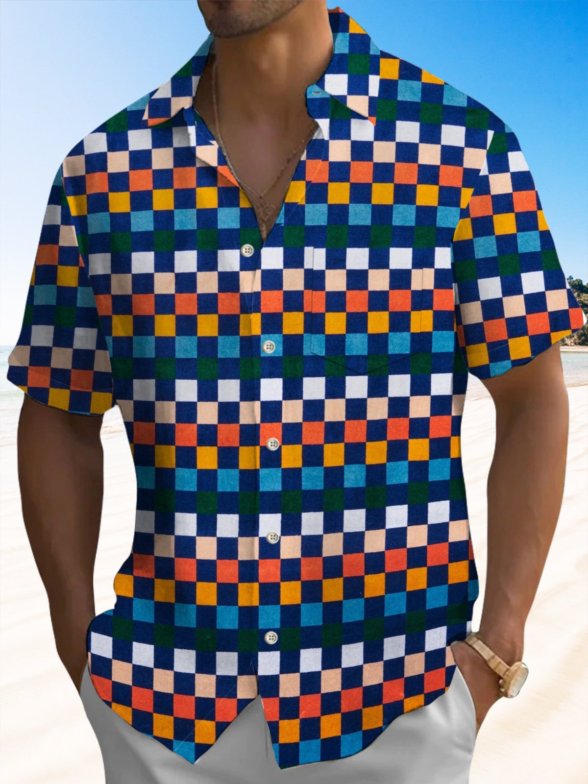 Alohadaddy® Retro Geometric Print Stretch Pocket Button Men's Short Sleeve Shirt Big & Tall