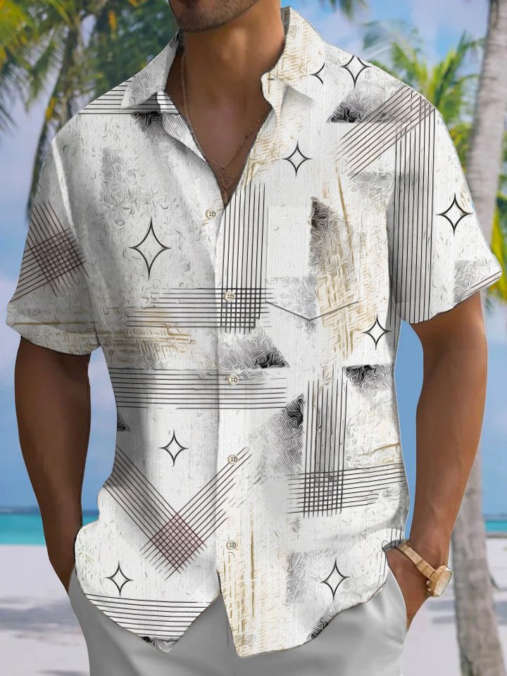 Alohadaddy Casual Stripes Geometric Art Print Polyester Stretch Button Cardigan Pockets Oversized Long Short Sleeve Shirt