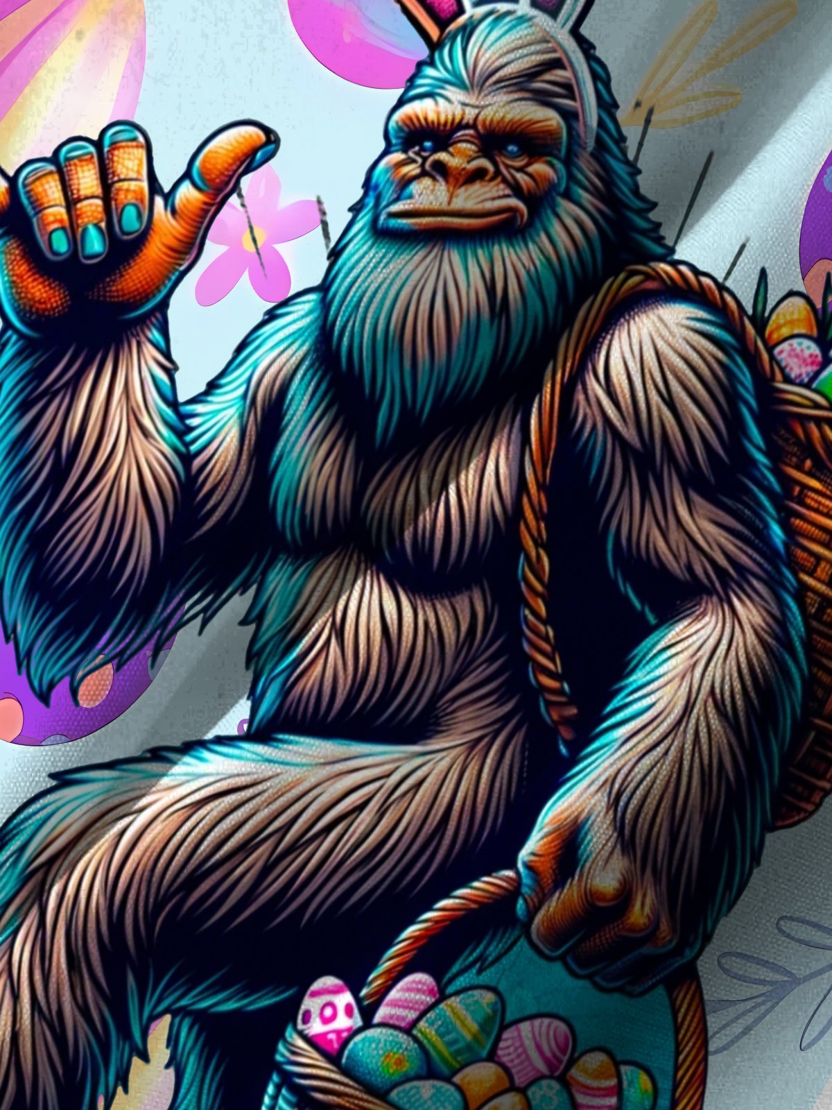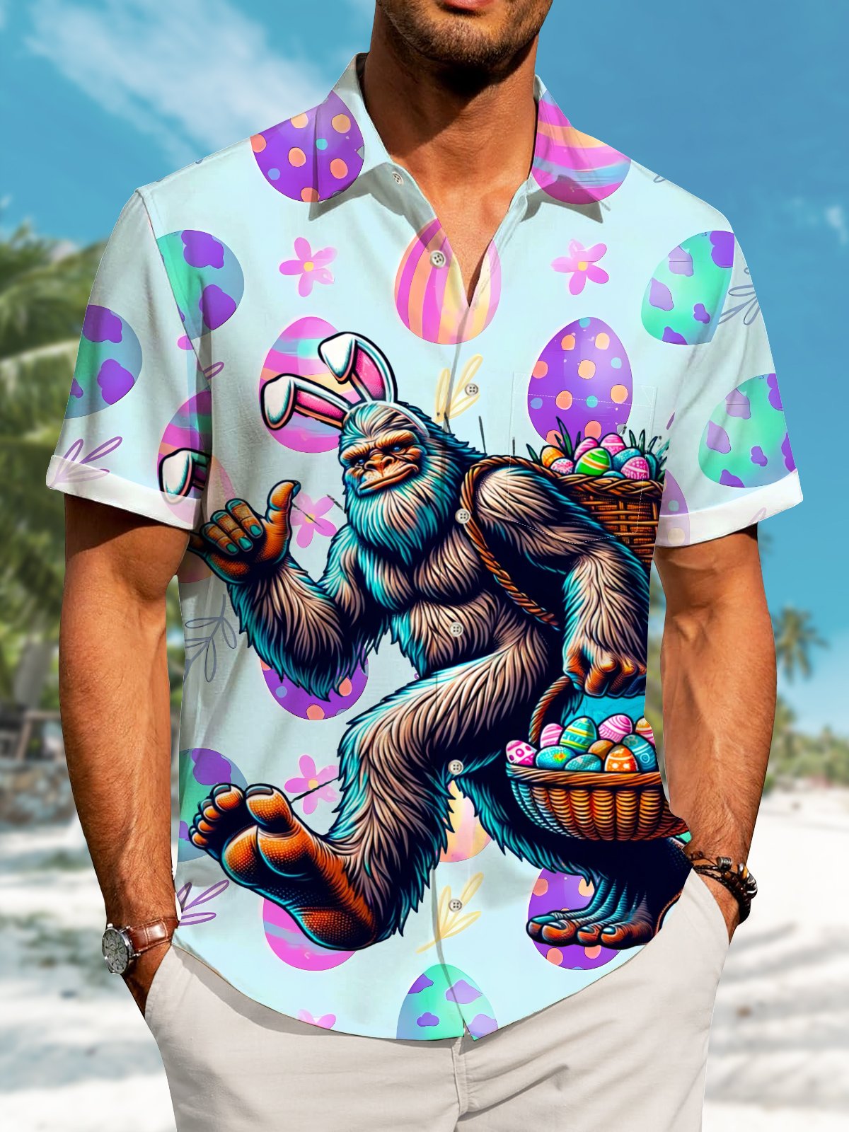 Alohadaddy Hawaii Easter Bigfoot Fun Print Art Buttons Stretch Large Size Men's Shirt