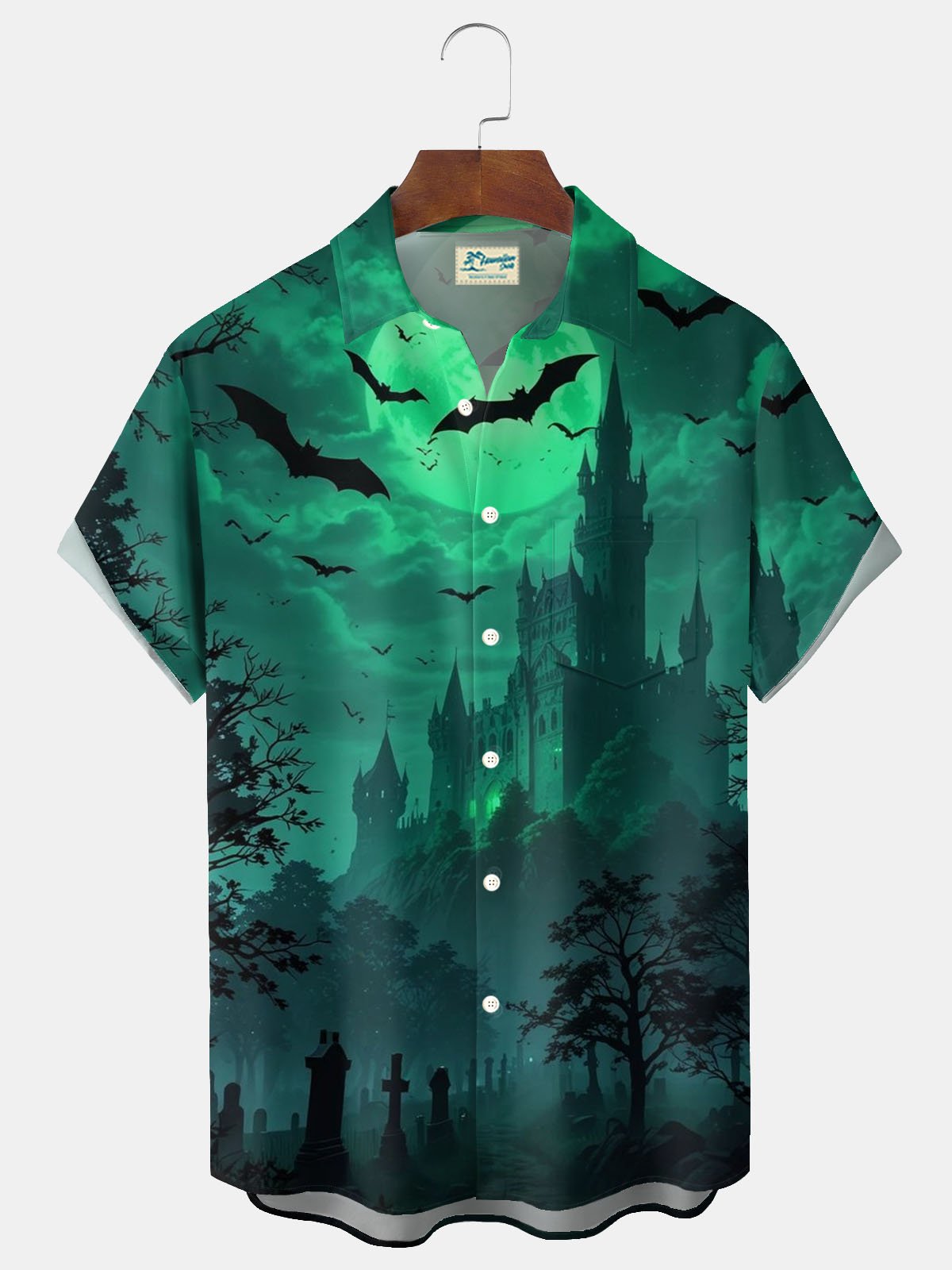 Alohadaddy® Halloween Castle Bat Print Men's Button Pocket Short Sleeve Shirt Big & Tall