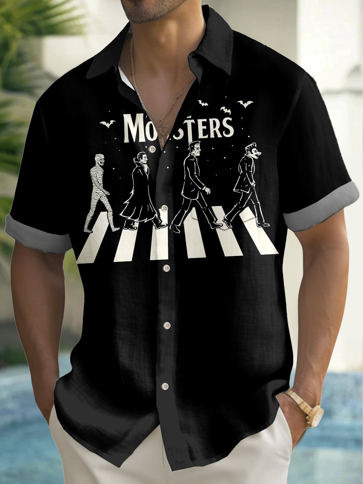 Alohadaddy® Halloween Monster Cartoon Print Casual Stylish Hawaiian Shirt Summer Shirts Pocket Short Sleeve Shirt Big Tall