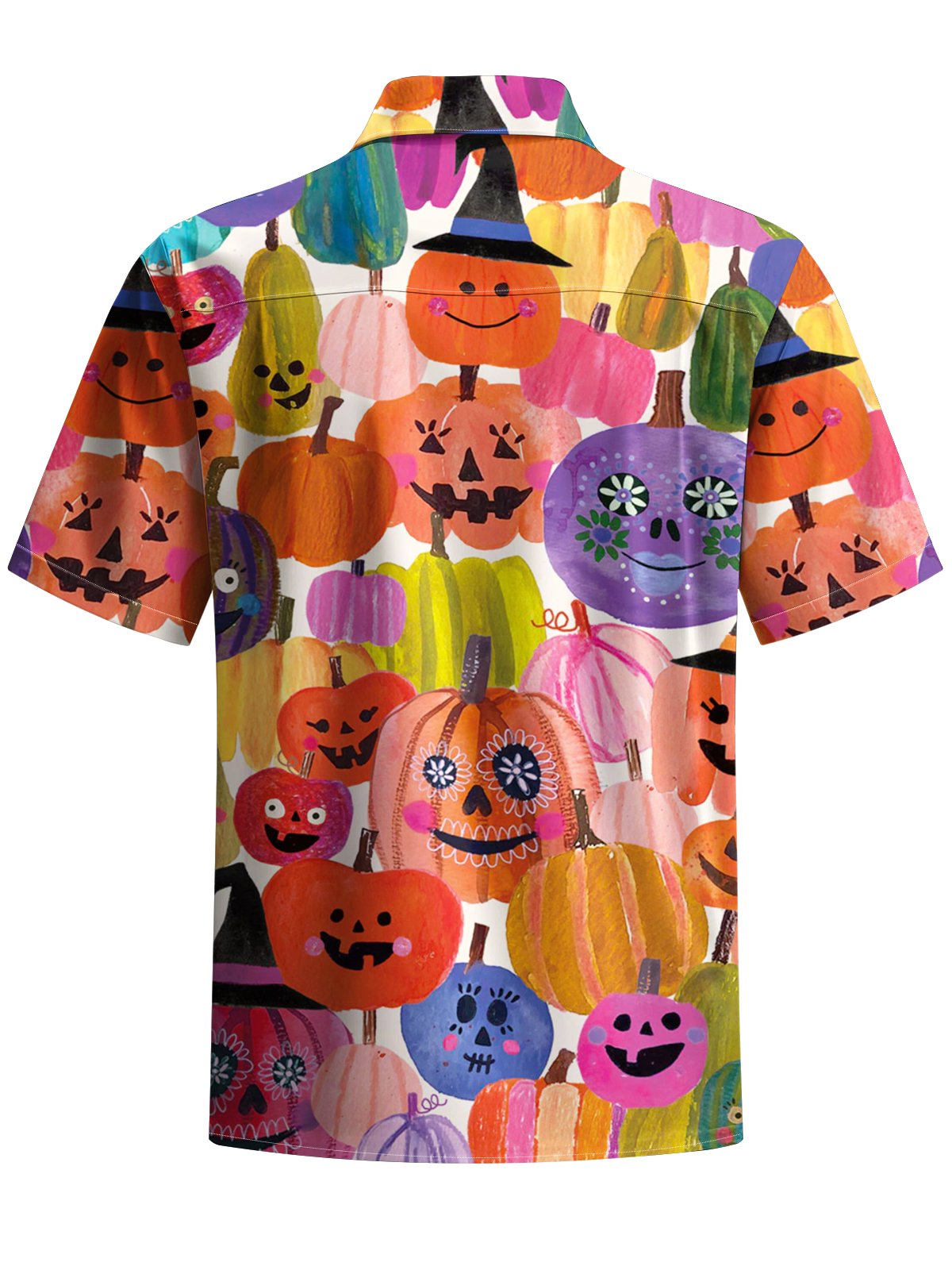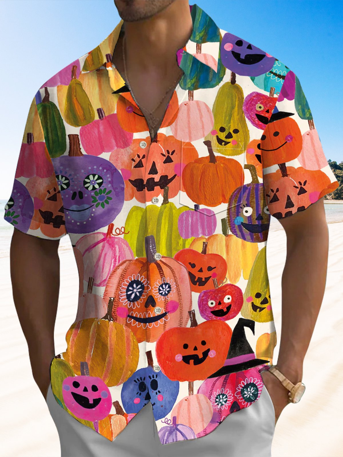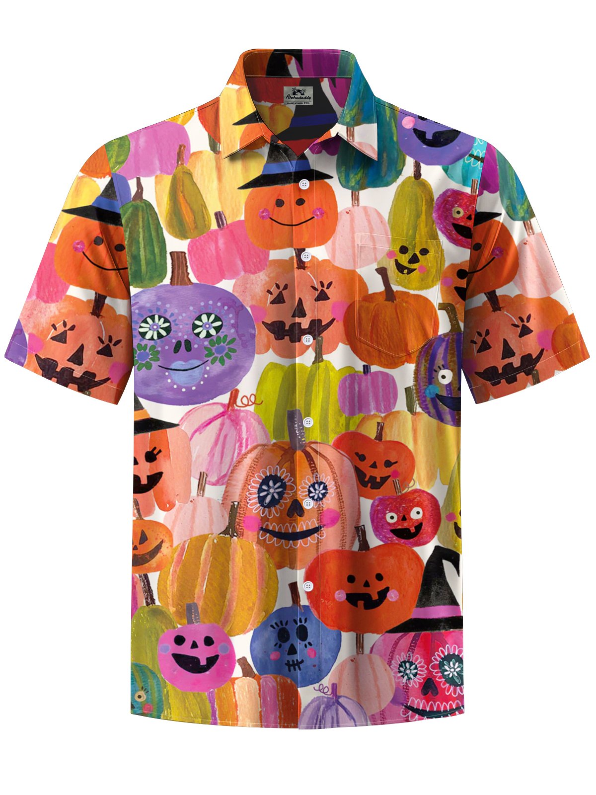 Alohadaddy® Halloween Pumpkin Art Print Chest Pocket Stretch Men's Short Sleeve Shirt Big & Tall