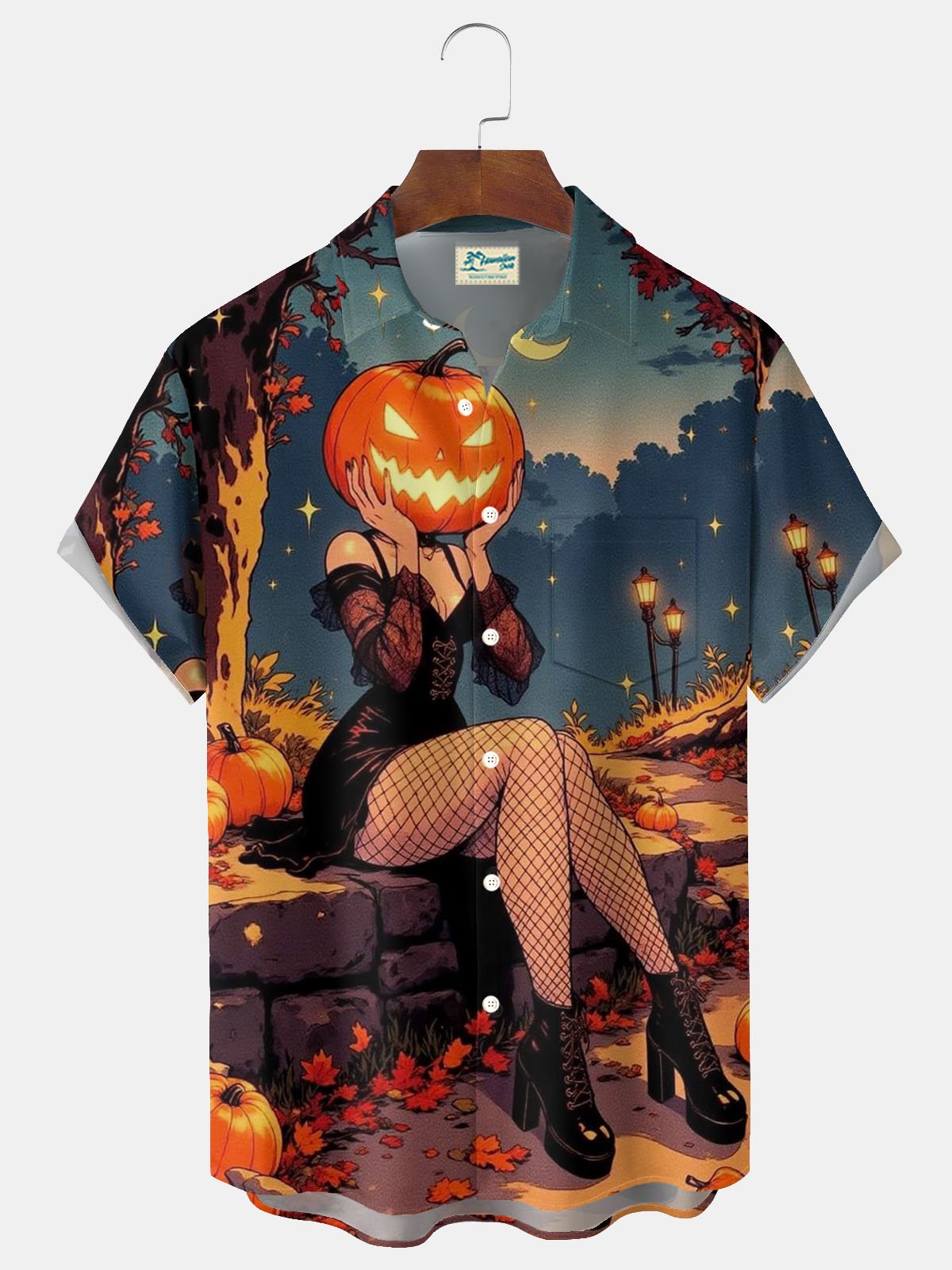 Alohadaddy® Halloween Pumpkin Girl Print Men's Button Pocket Short Sleeve Shirt Big & Tall
