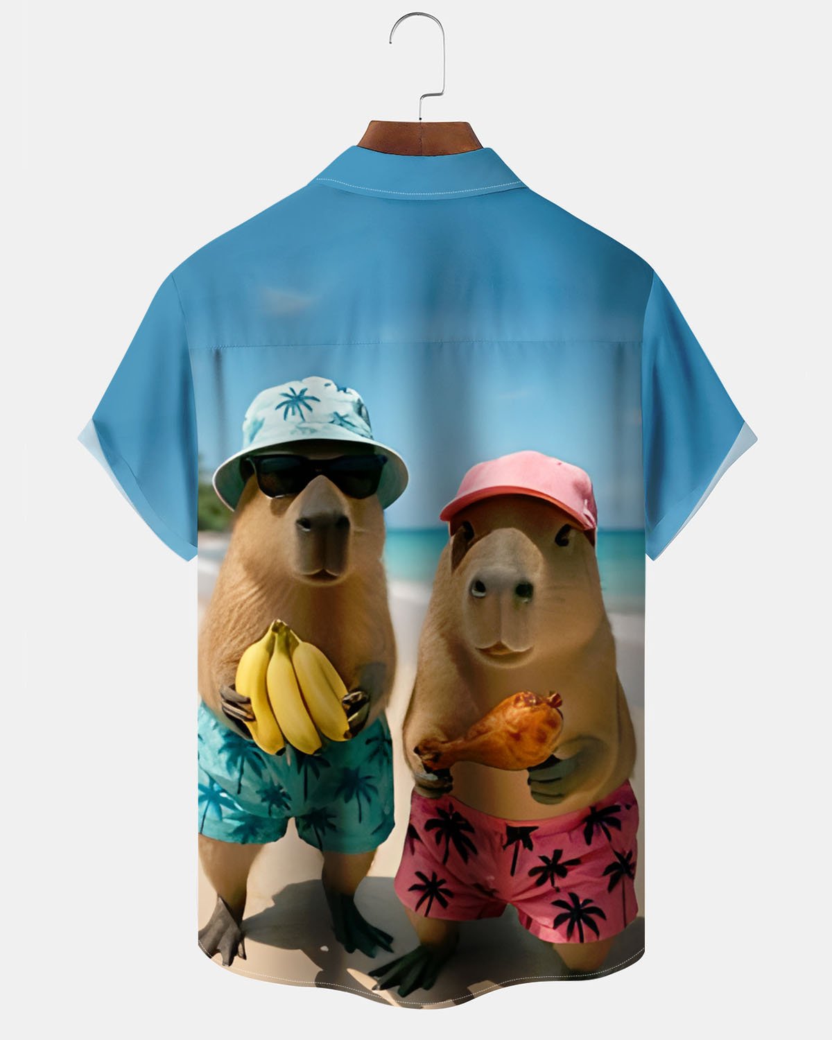 Alohadaddy® Casual Capybara Capybara Animal Print Art, Stretch, Pockets, Buttons, Men's Short-Sleeve Shirt, Big & Tall