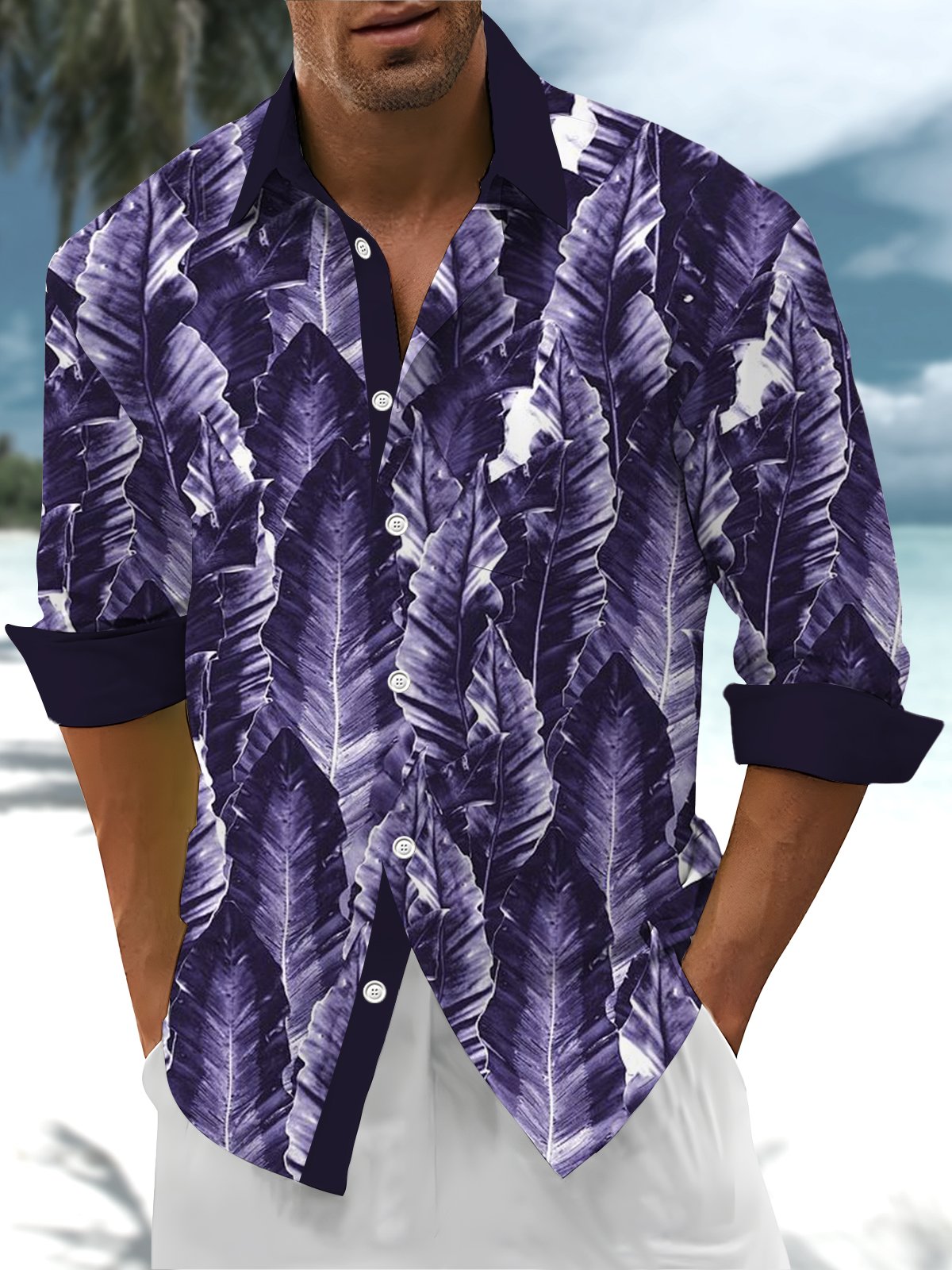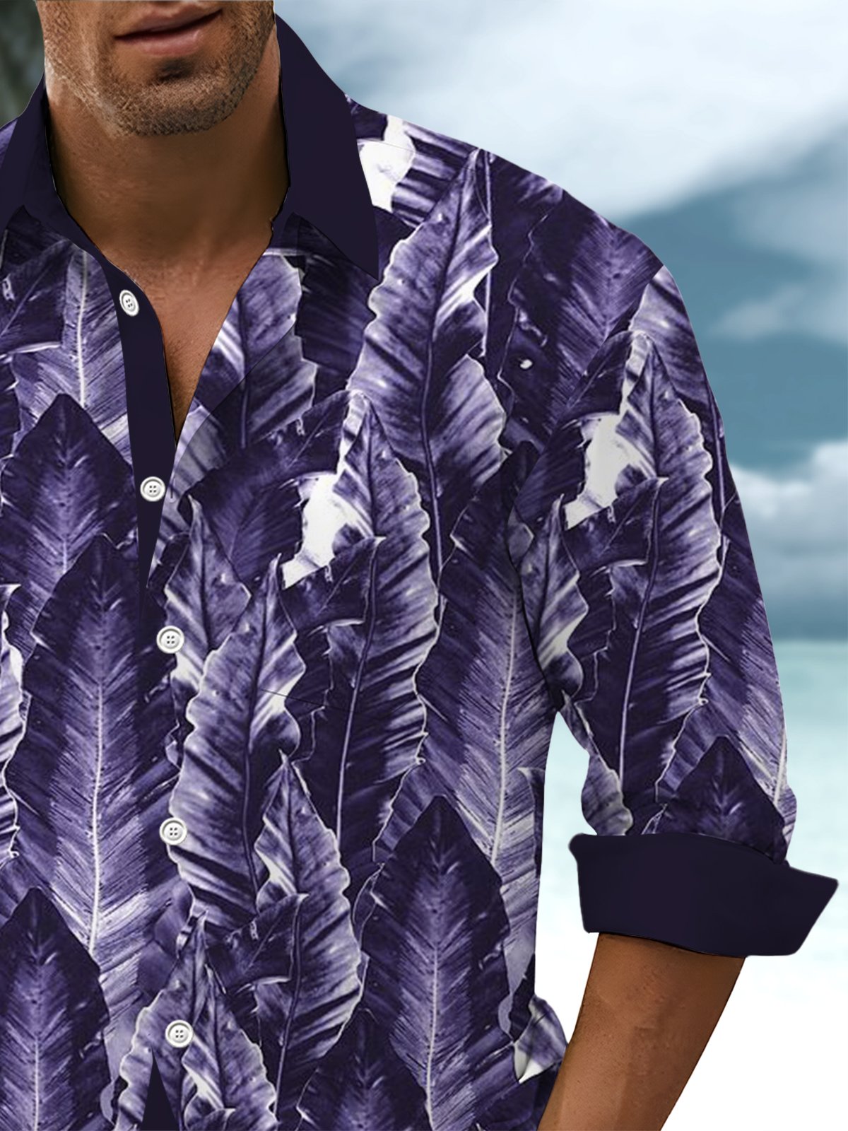 Alohadaddy® Casual Tropical Leaf Art Print Chest Pocket Stretch Men's Long Sleeve Shirt Big & Tall