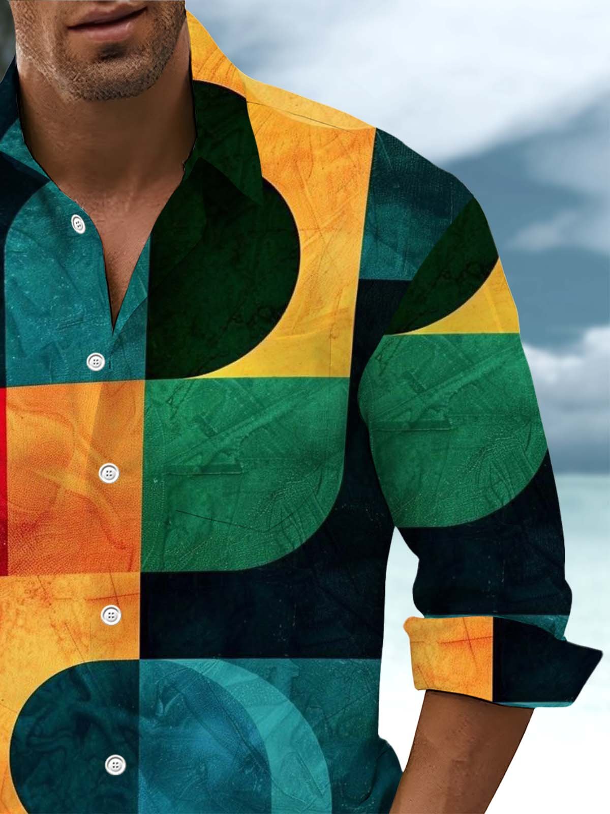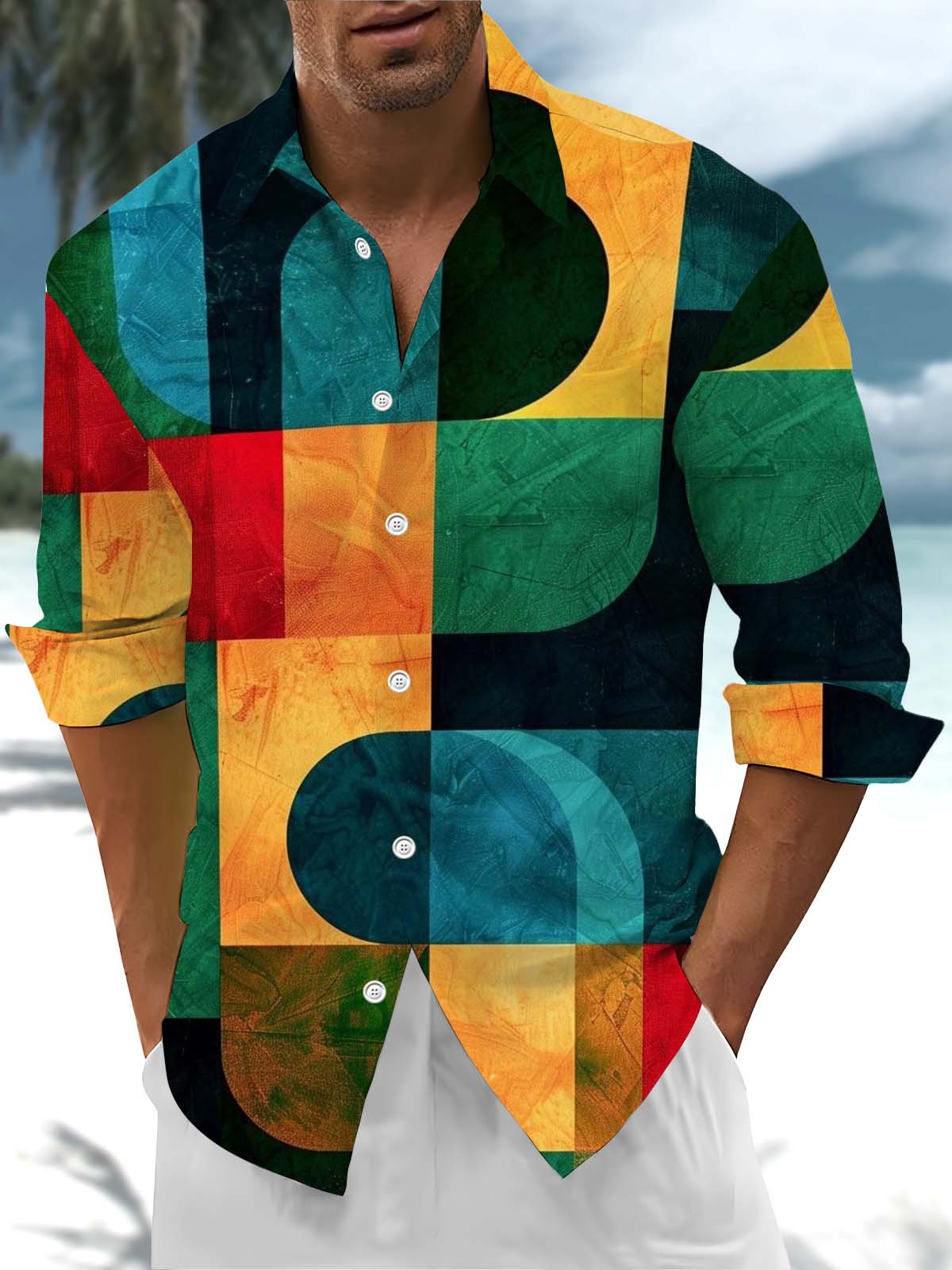 Alohadaddy® Retro Geometric Art Print Chest Pocket Stretch Men's Long Sleeve Shirt Big & Tall