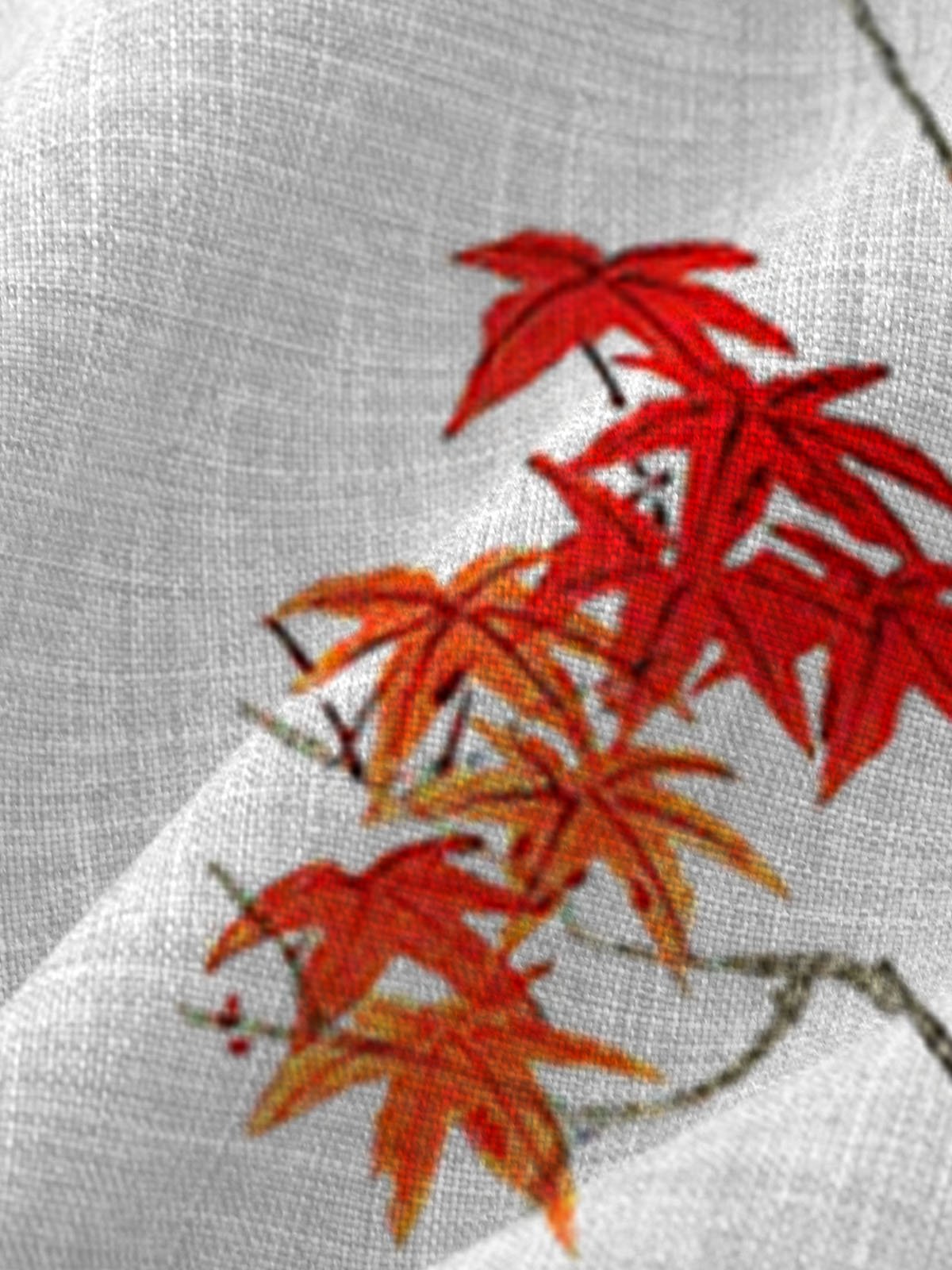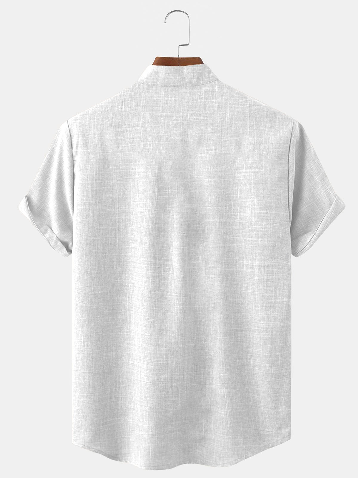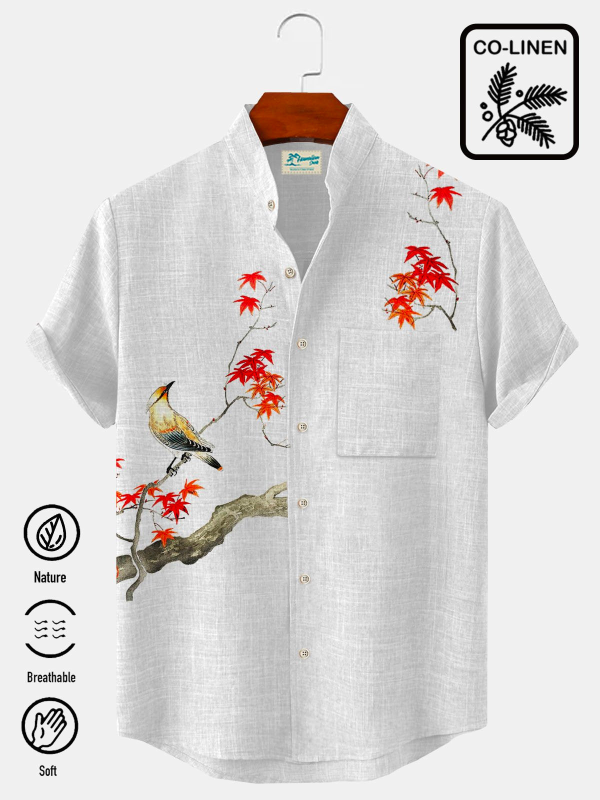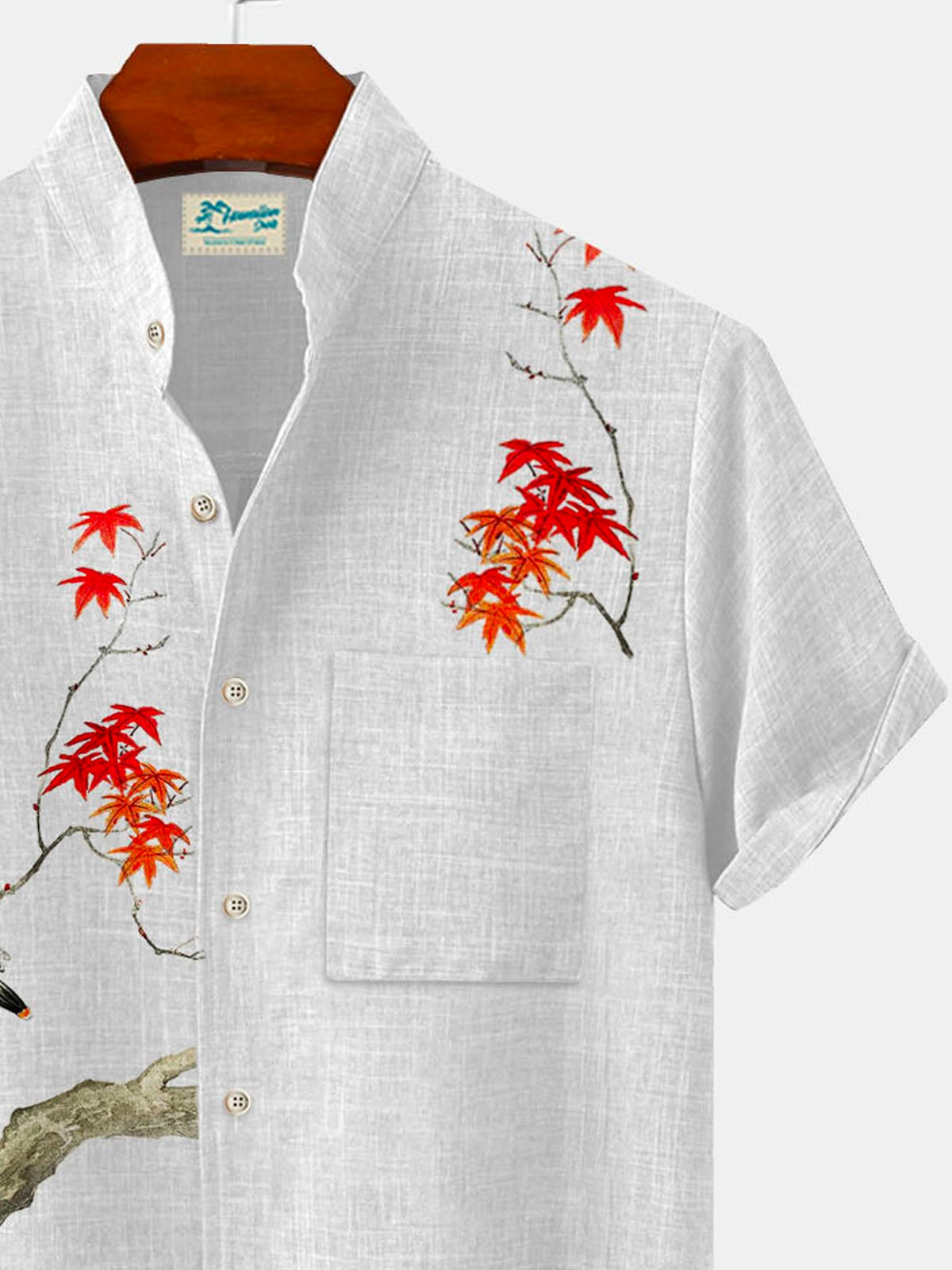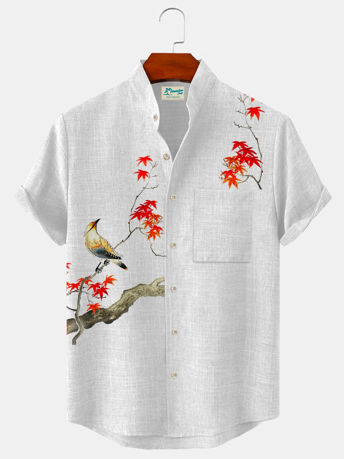 Alohadaddy Cotton Linen Stand Collar Parrot Floral Print Men's Button Pocket Short Sleeve Shirt
