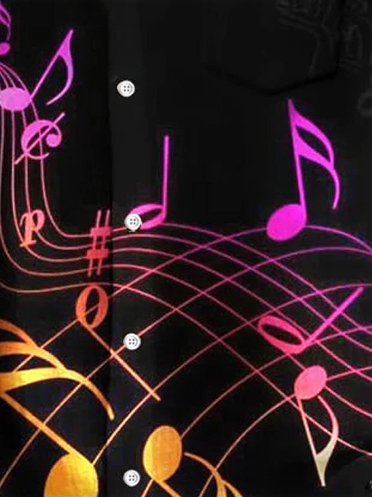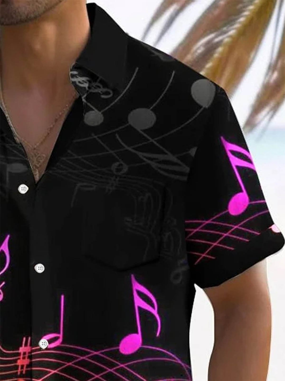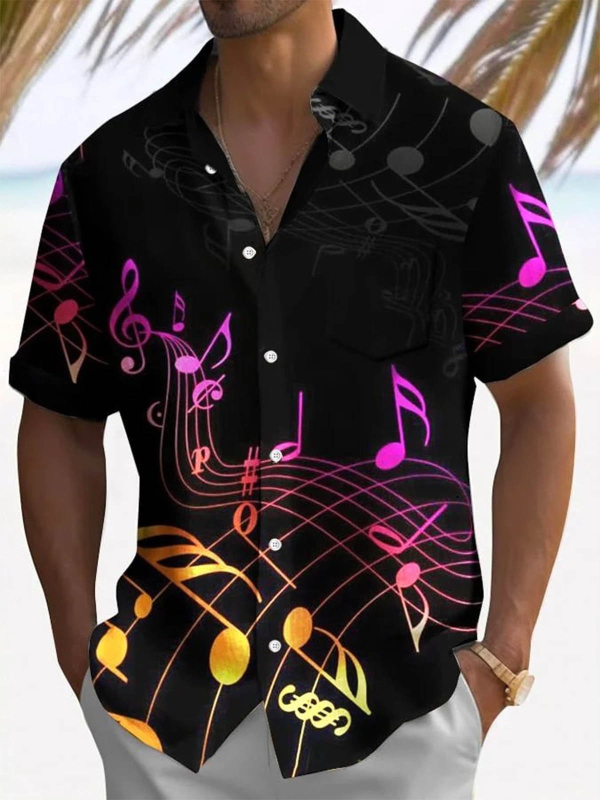 Alohadaddy® Retro Music Notes Printed Elastic Large Size Chest Pocket Men's Short Sleeve Shirt