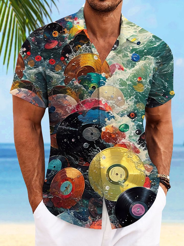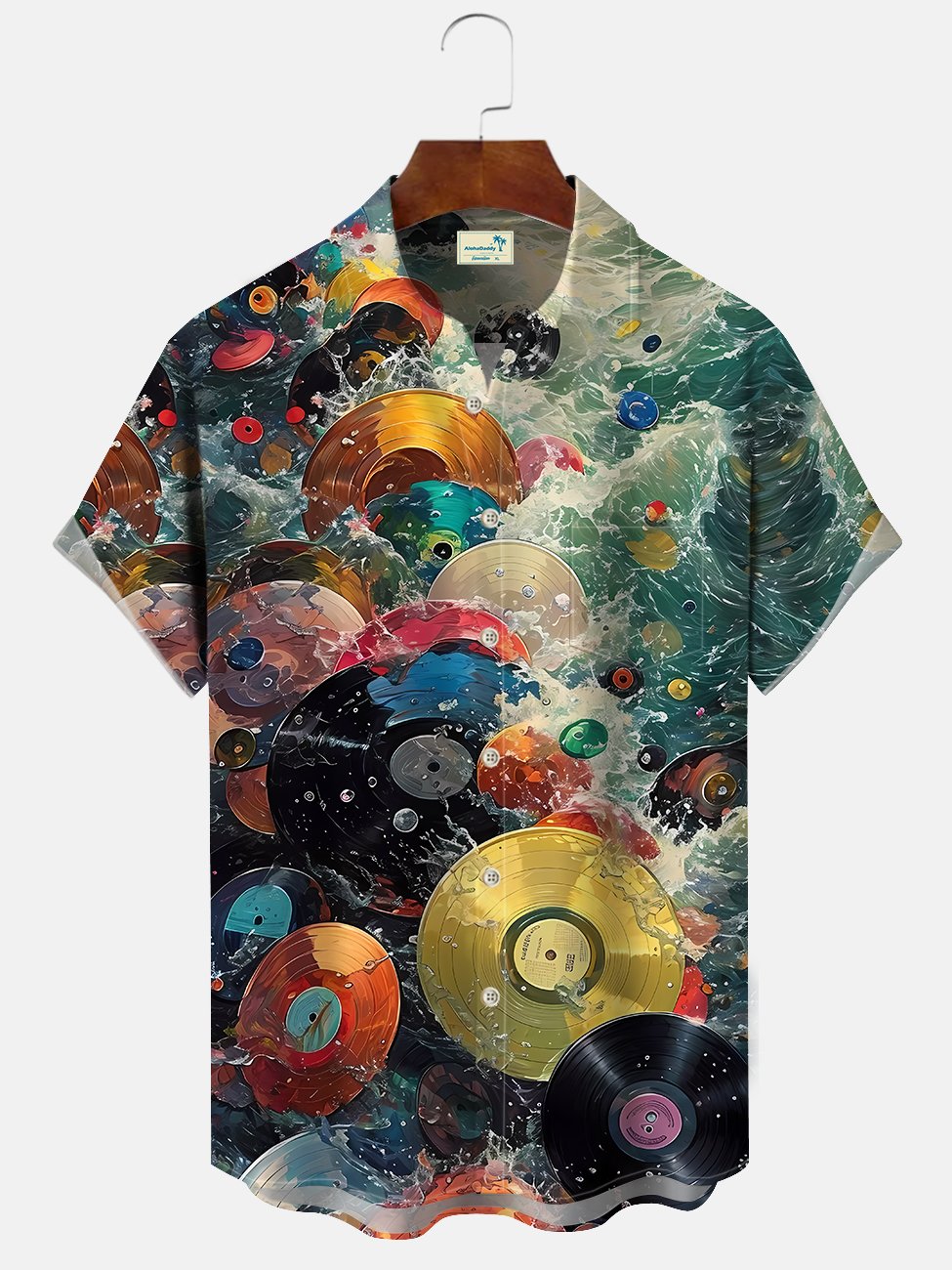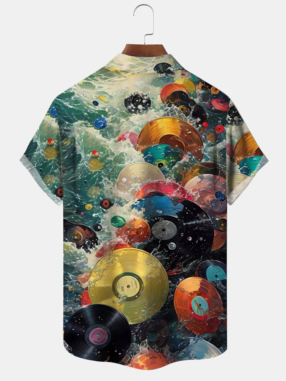 Alohadaddy Retro Vinyl Record Wave Pocket Button Casual Short Sleeve Shirt