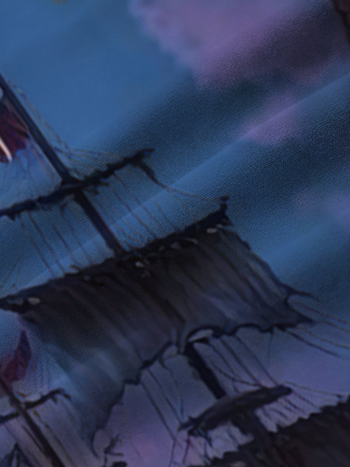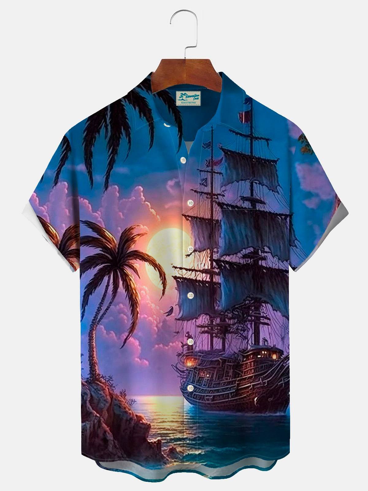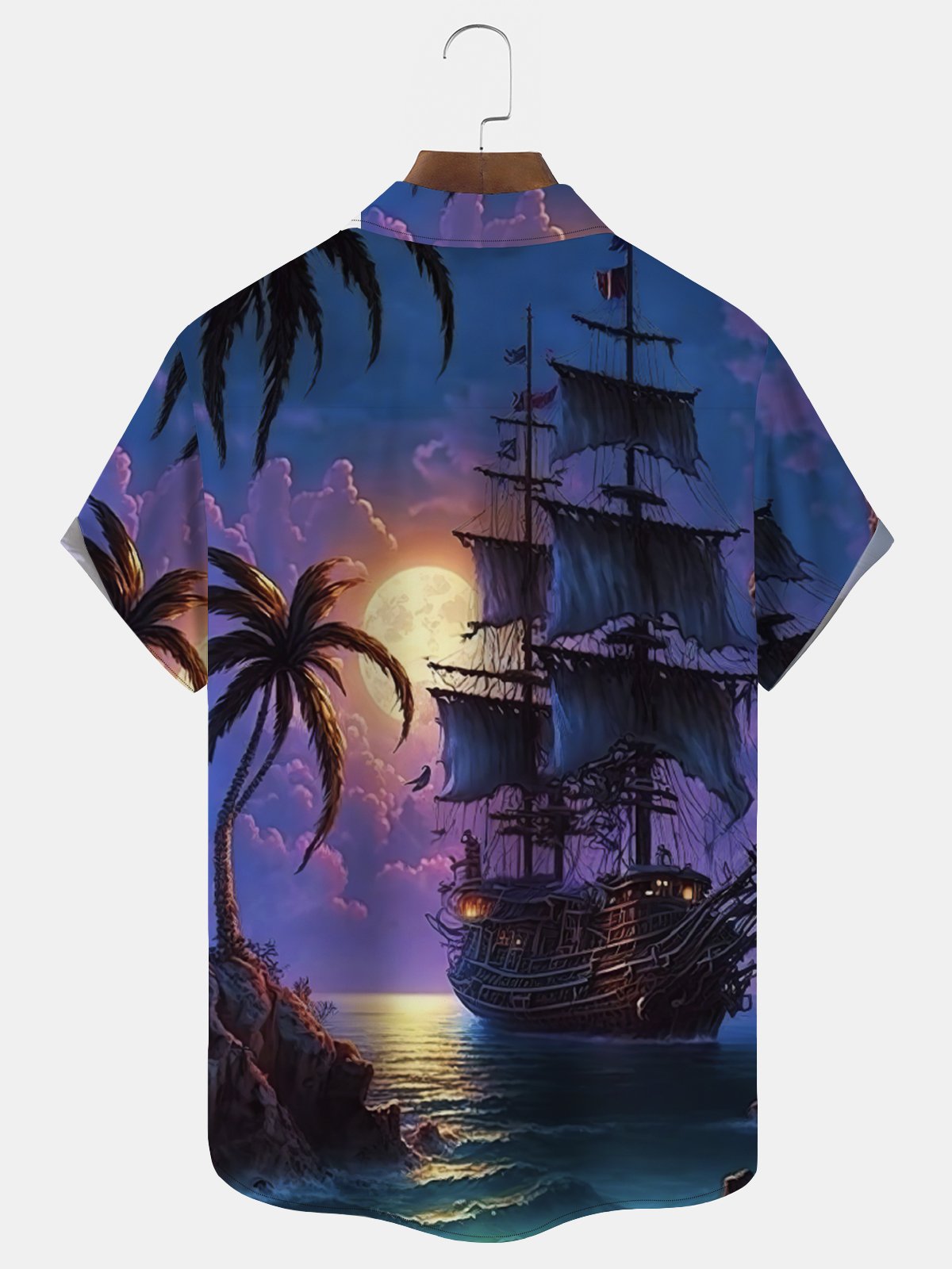 Alohadaddy Nautical Pirate Ship Print Men's Button Pocket Short Sleeve Shirt