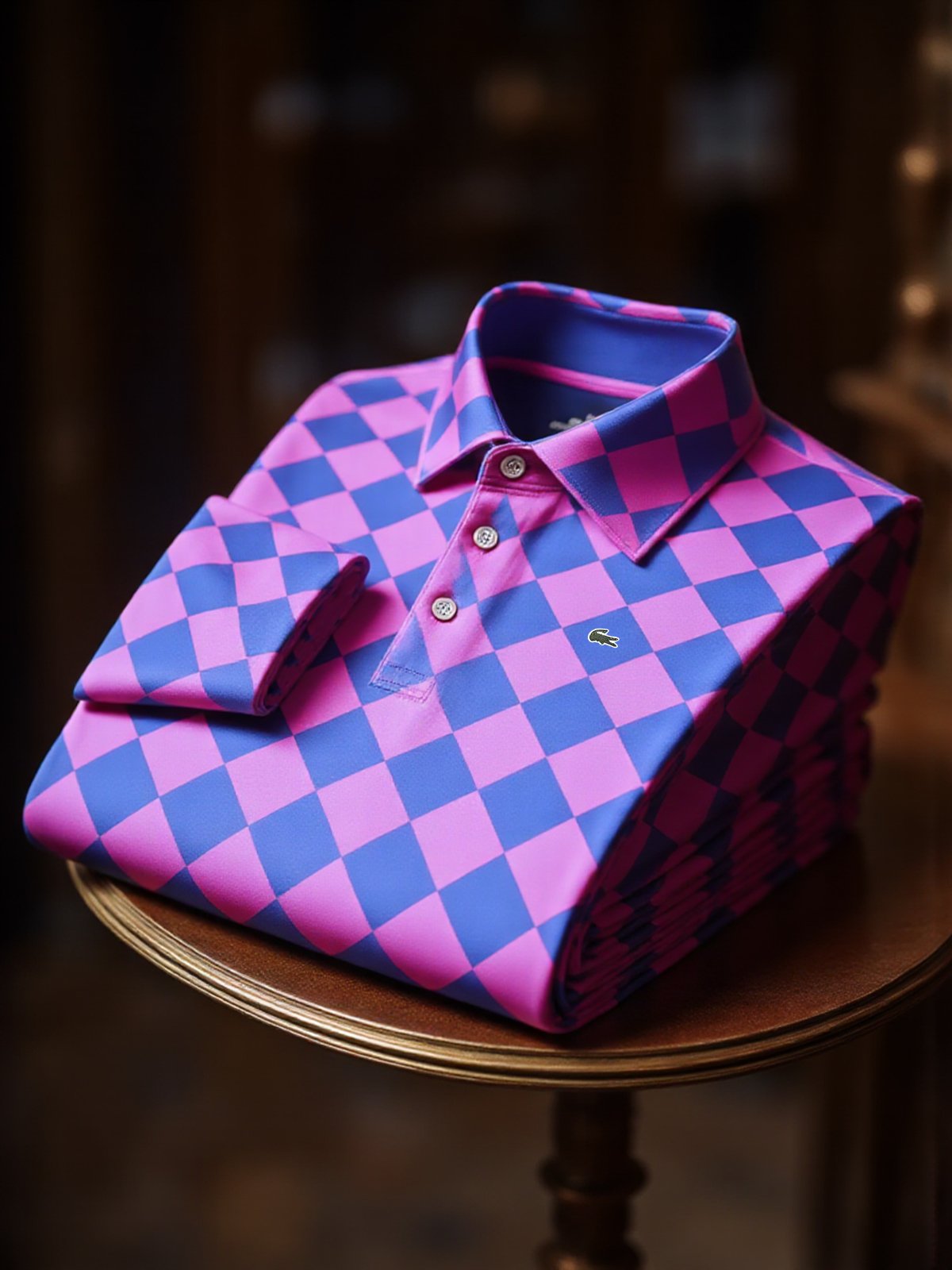 Alohadaddy® Business Casual Checkerboard Print Elastic Button Men's Long Sleeve Polo Big & Tall