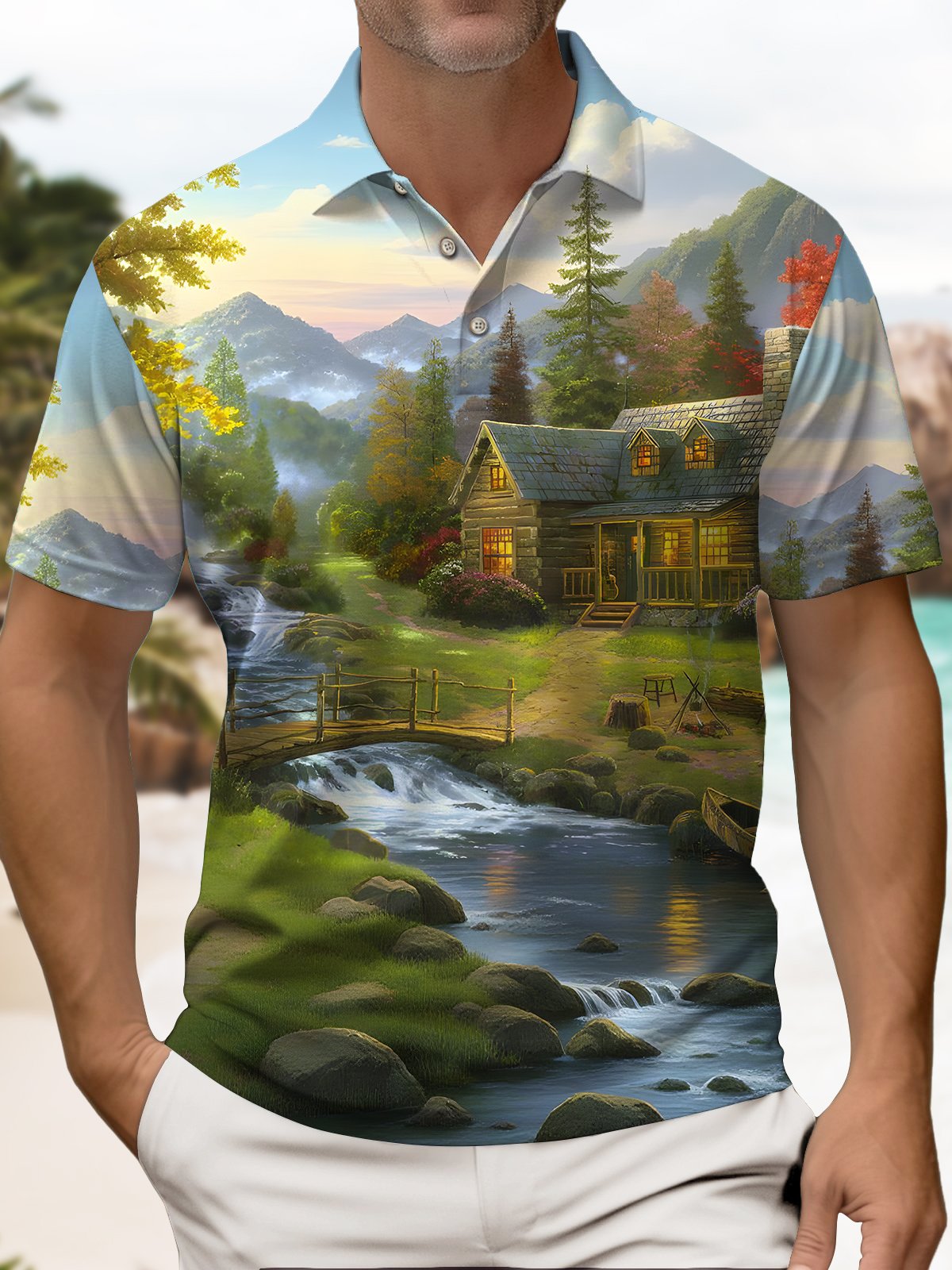 Alohadaddy® Retro Landscape River Cabin Grass Men's Polo Shirt