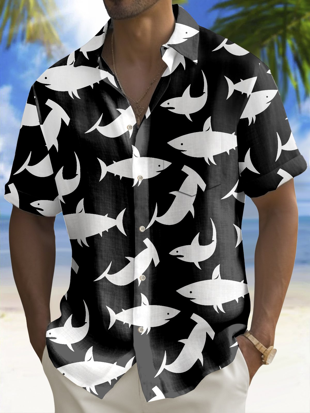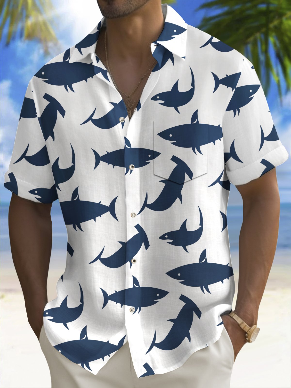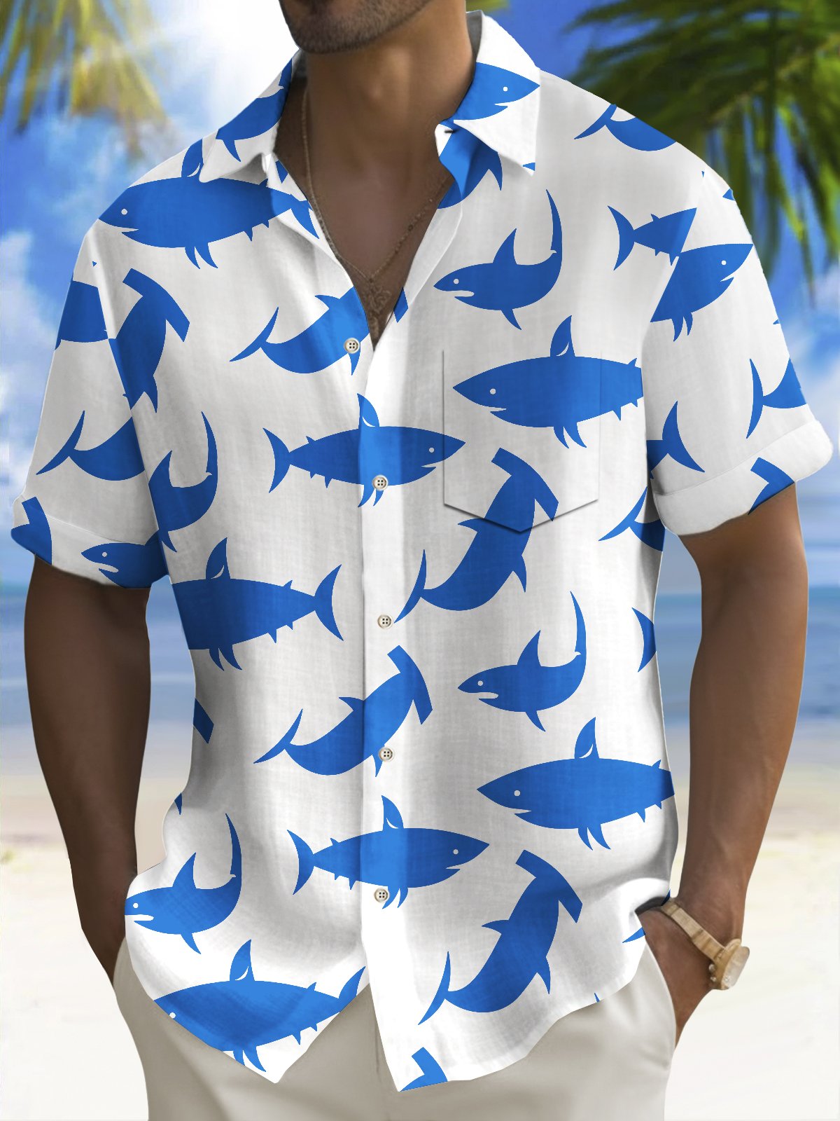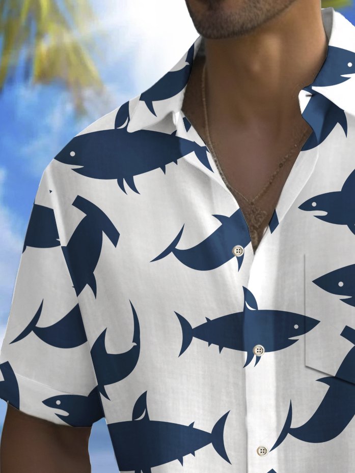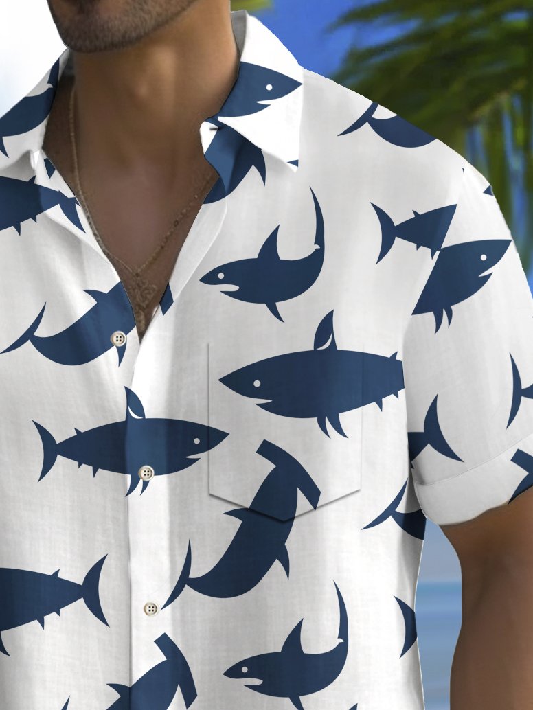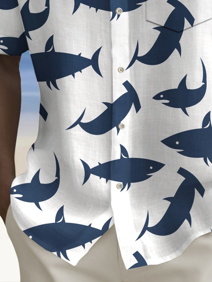 Alohadaddy Beach Vacation Men's Hawaiian Shirt Shark Print Pocket Camping Shirt Big Tall