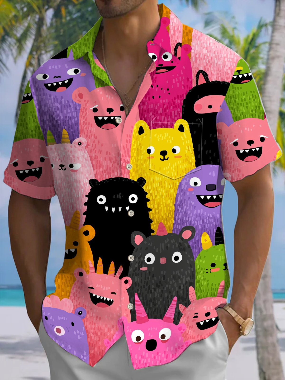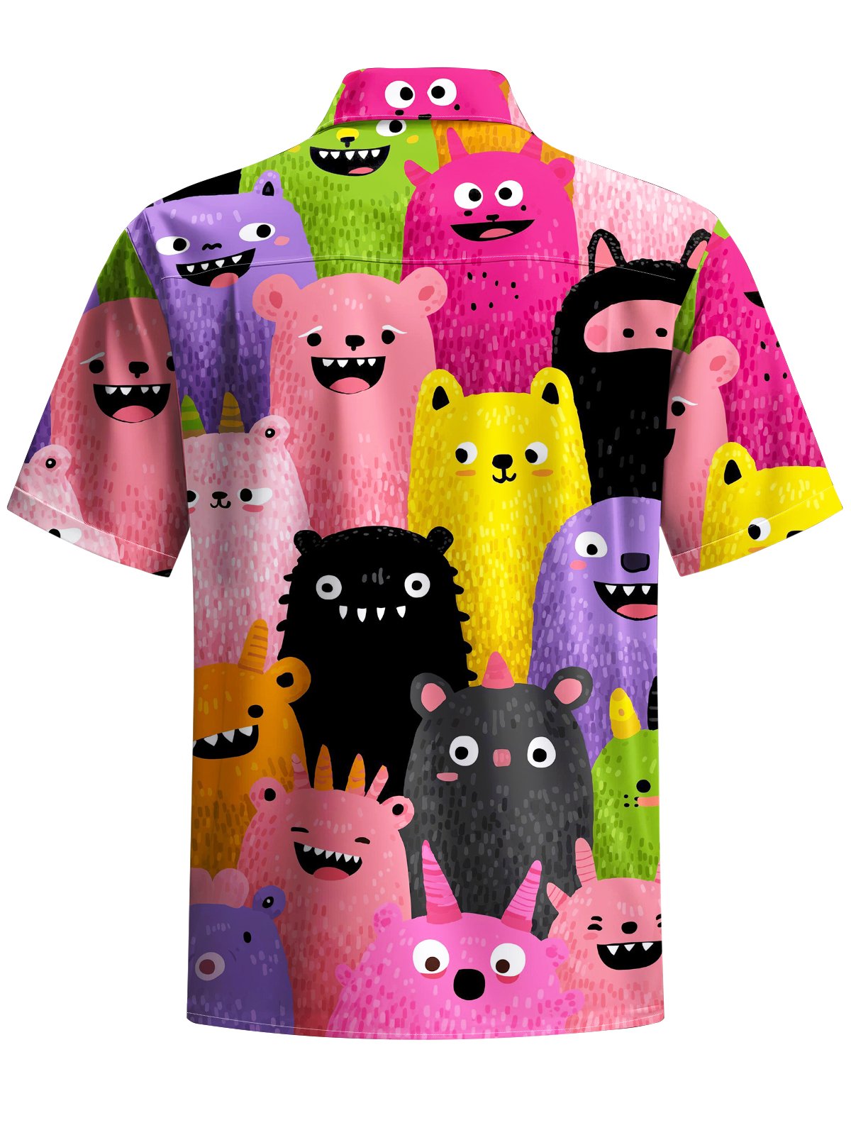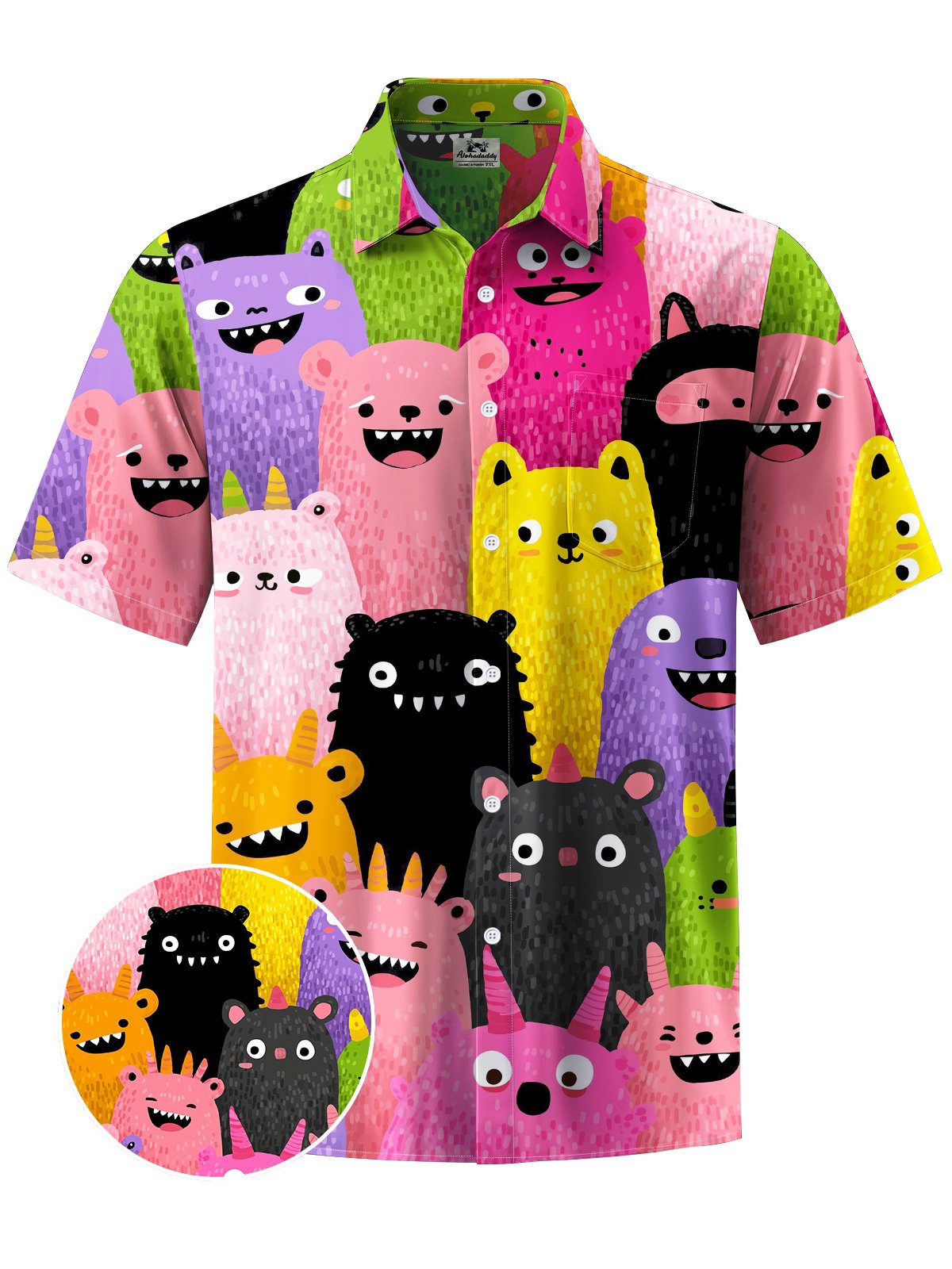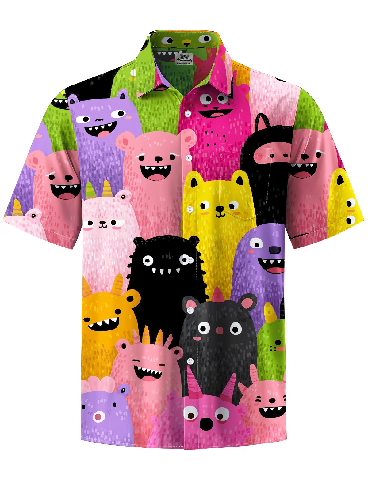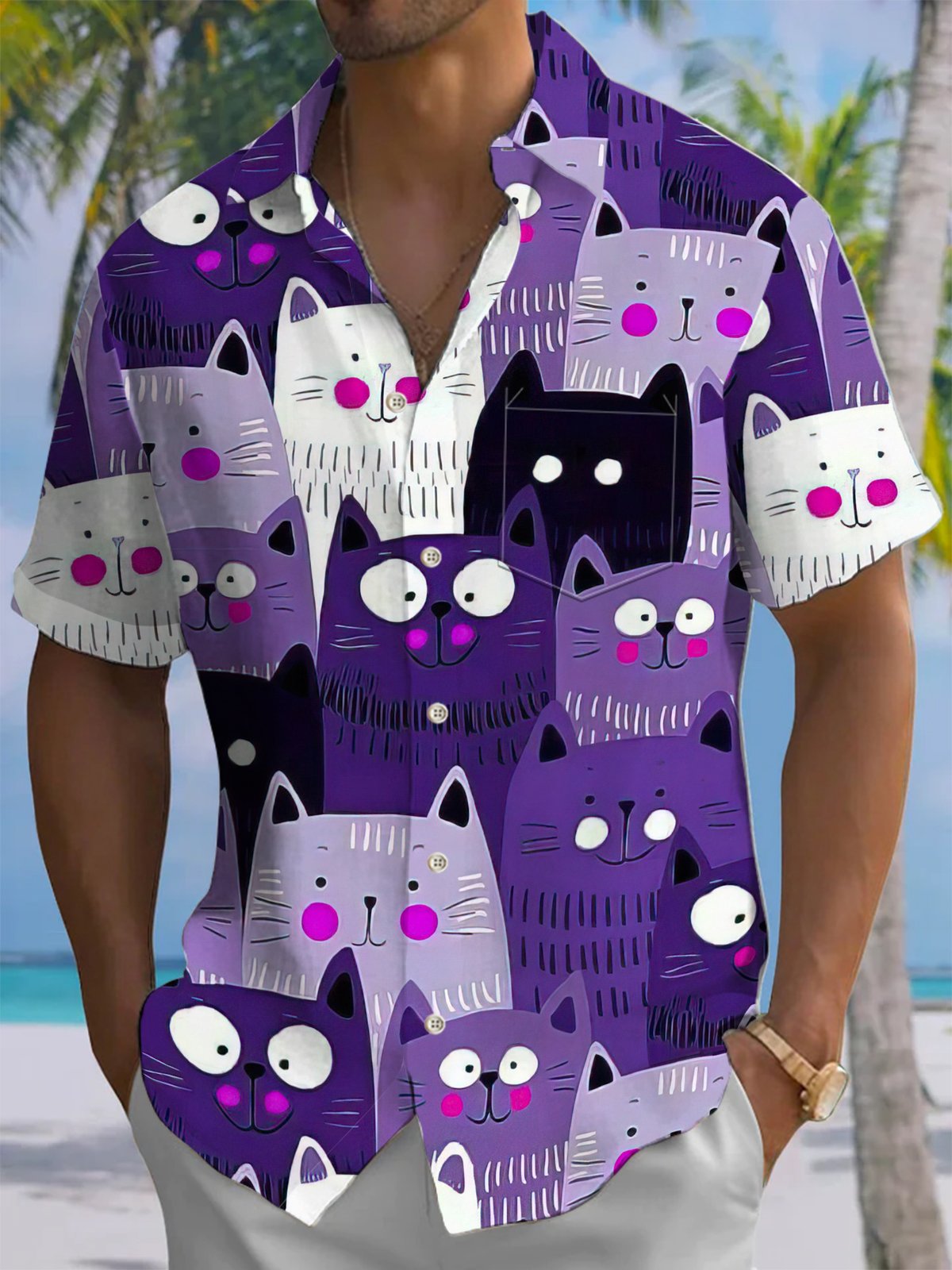 Alohadaddy® Casual Cartoon Cat Print Art Chest Pocket Men Short Sleeve Shirt Big & Tall