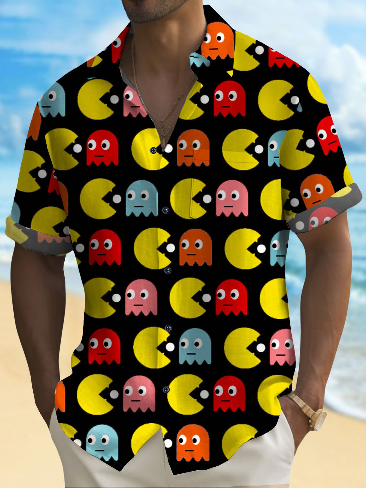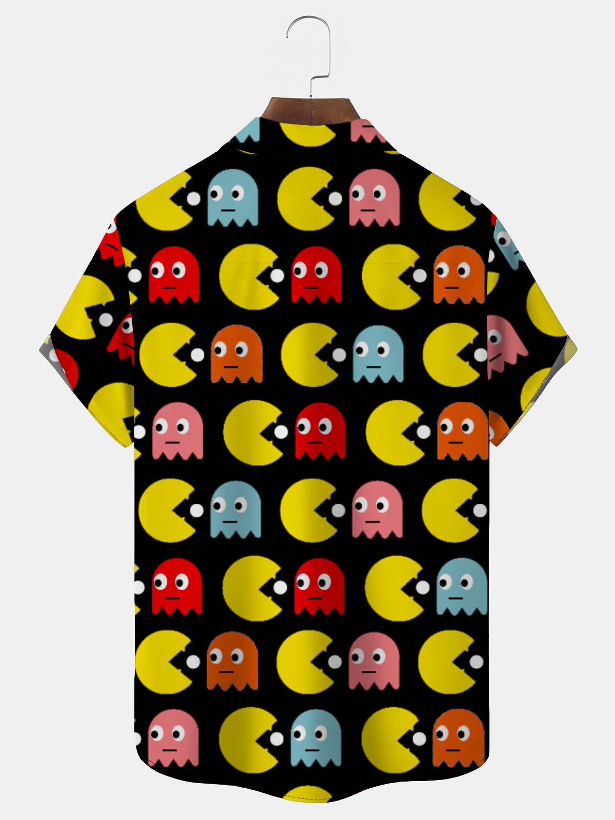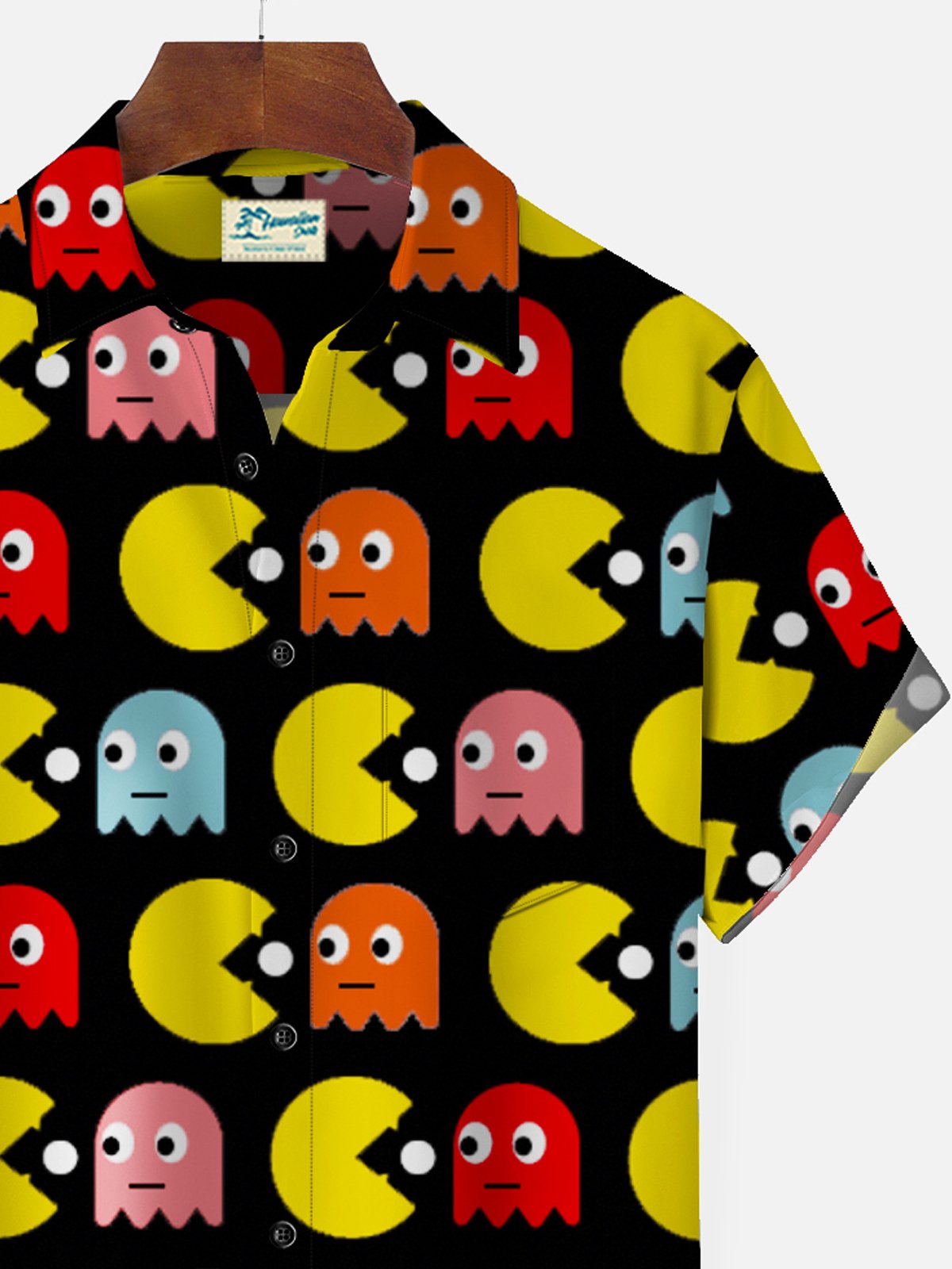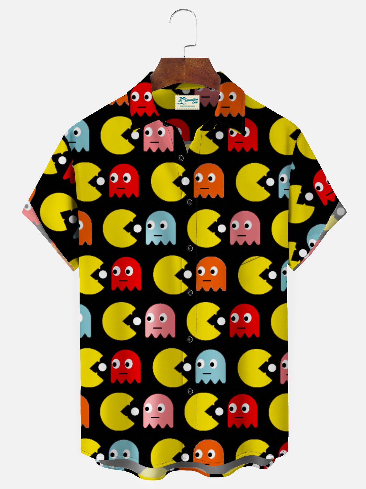 Alohadaddy 50's Retro Cartoon Black Men's Hawaiian Shirts Yellow Monster Stretch Oversized Aloha Button Camp Shirts