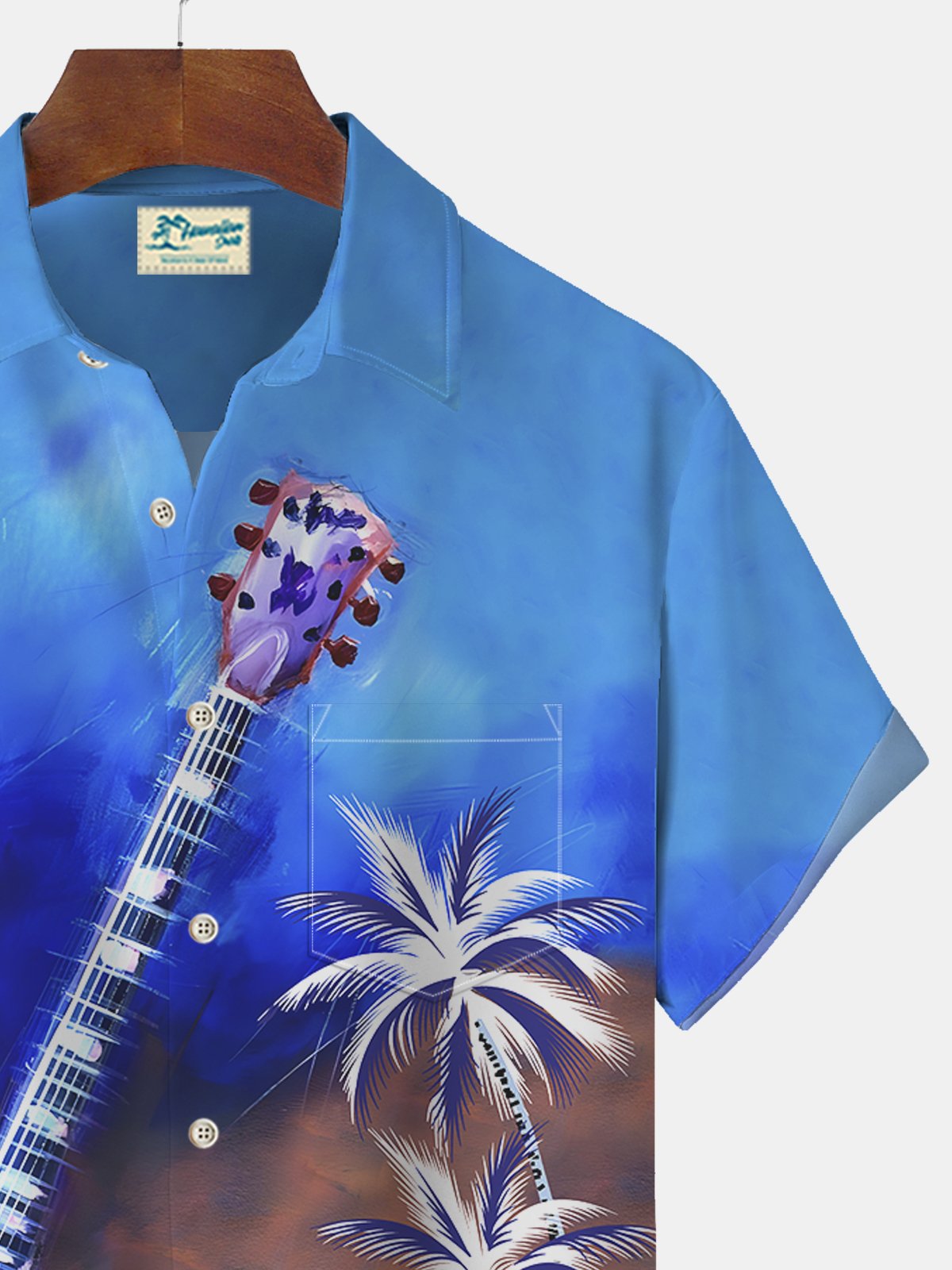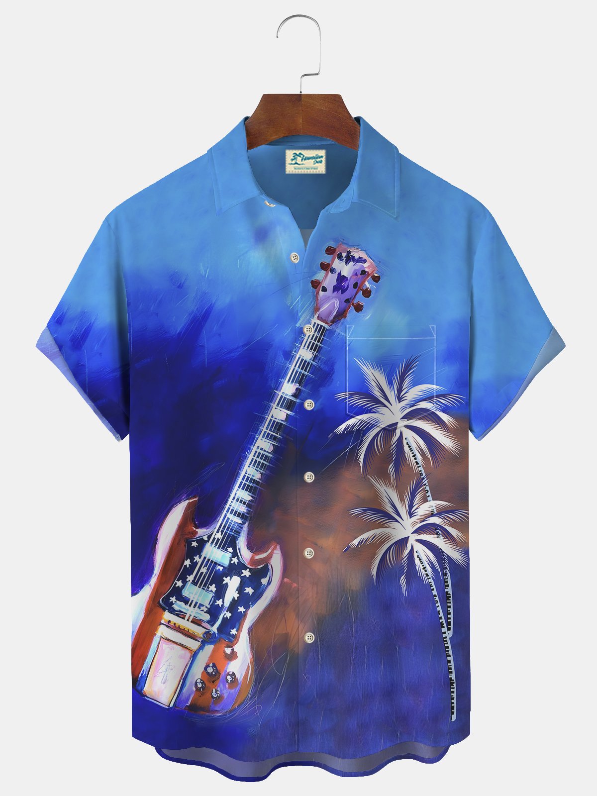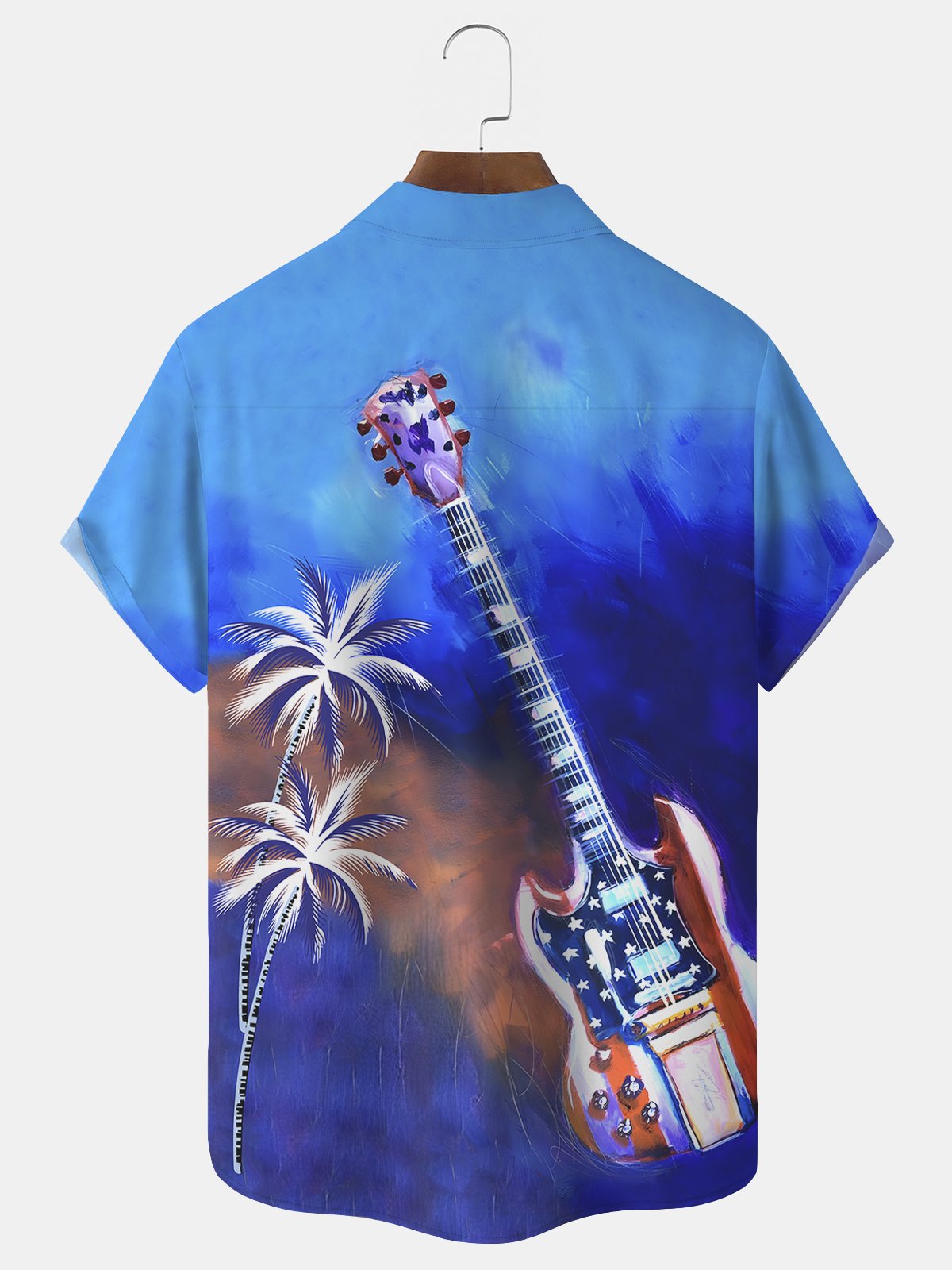 Alohadaddy Coconut Tree Flag Guitar Print Beach Men's Hawaiian Oversized Long Sleeve Shirt with Pockets
