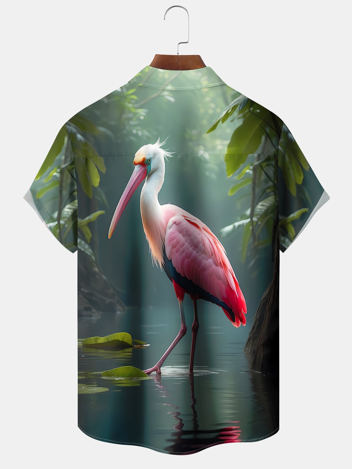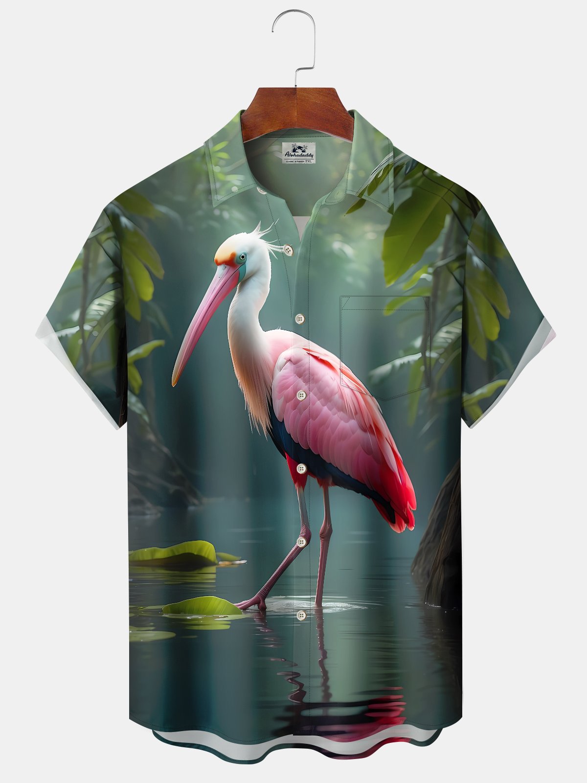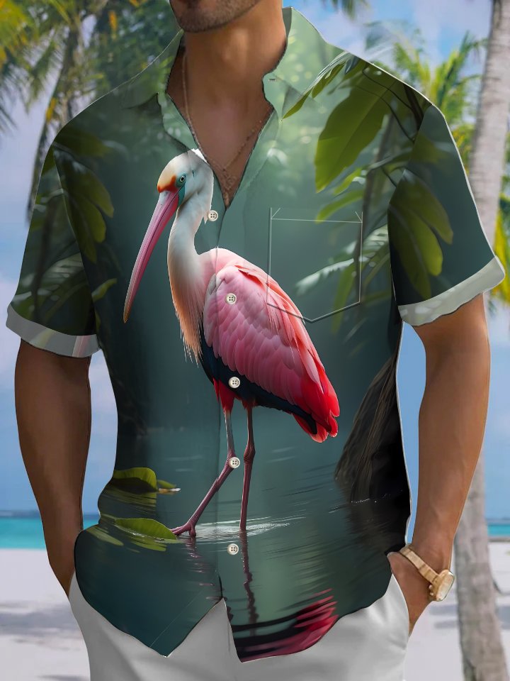 Alohadaddy Hawaii Vacation Tropical 3D Flamingo Print Art Pocket Button Short Sleeve Stretch Casual Shirt