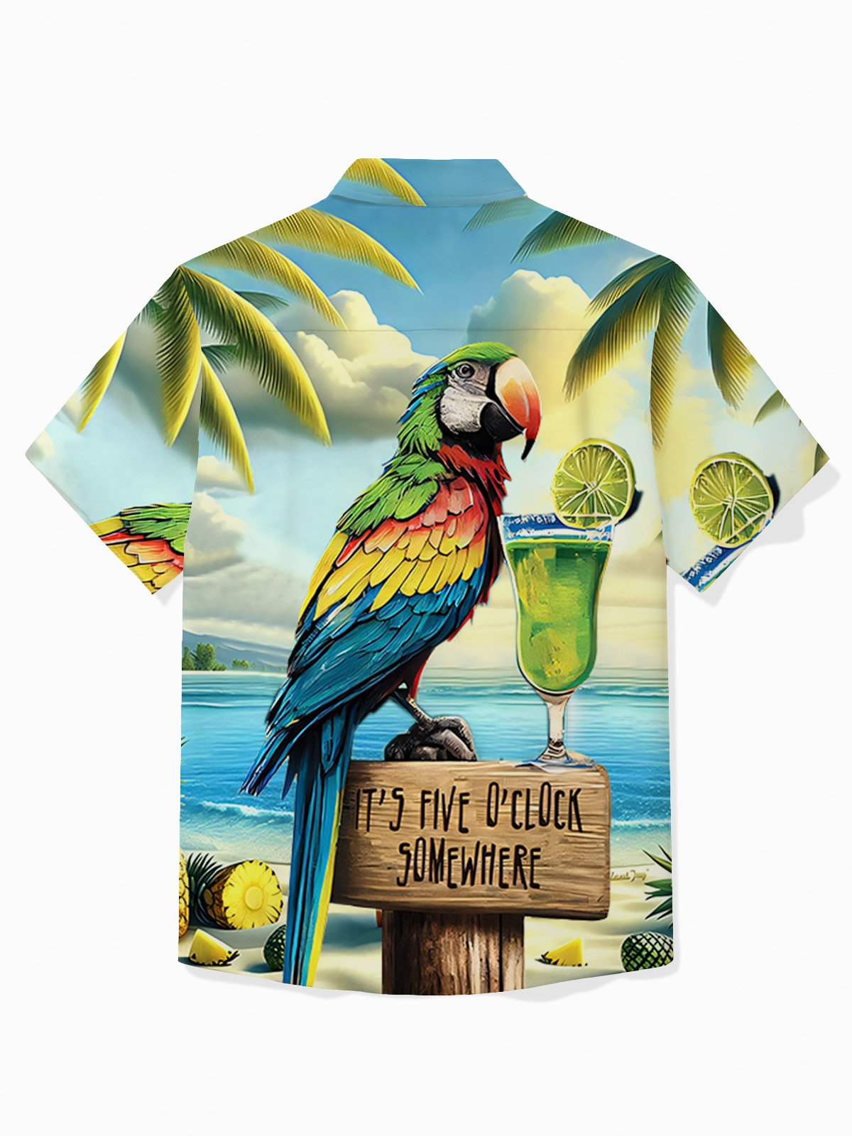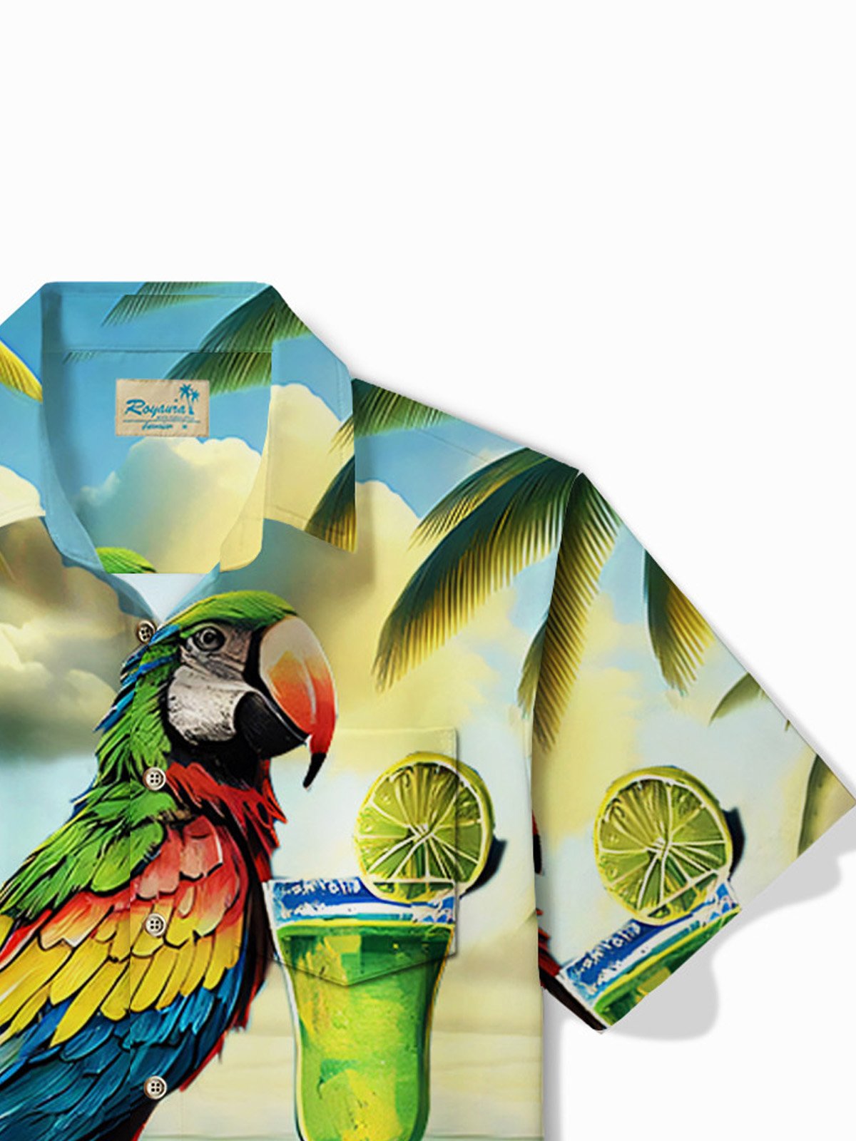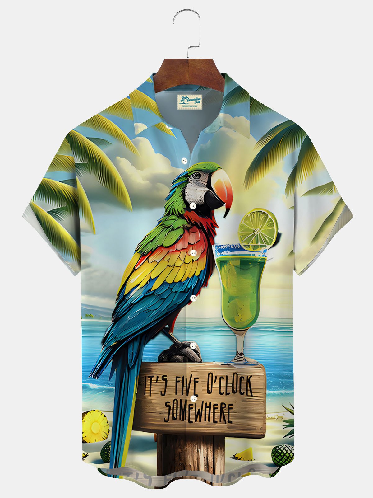 Alohadaddy Hawaiian Parrot Coconut Tree Print Men's Button Pocket Short Sleeve Shirt