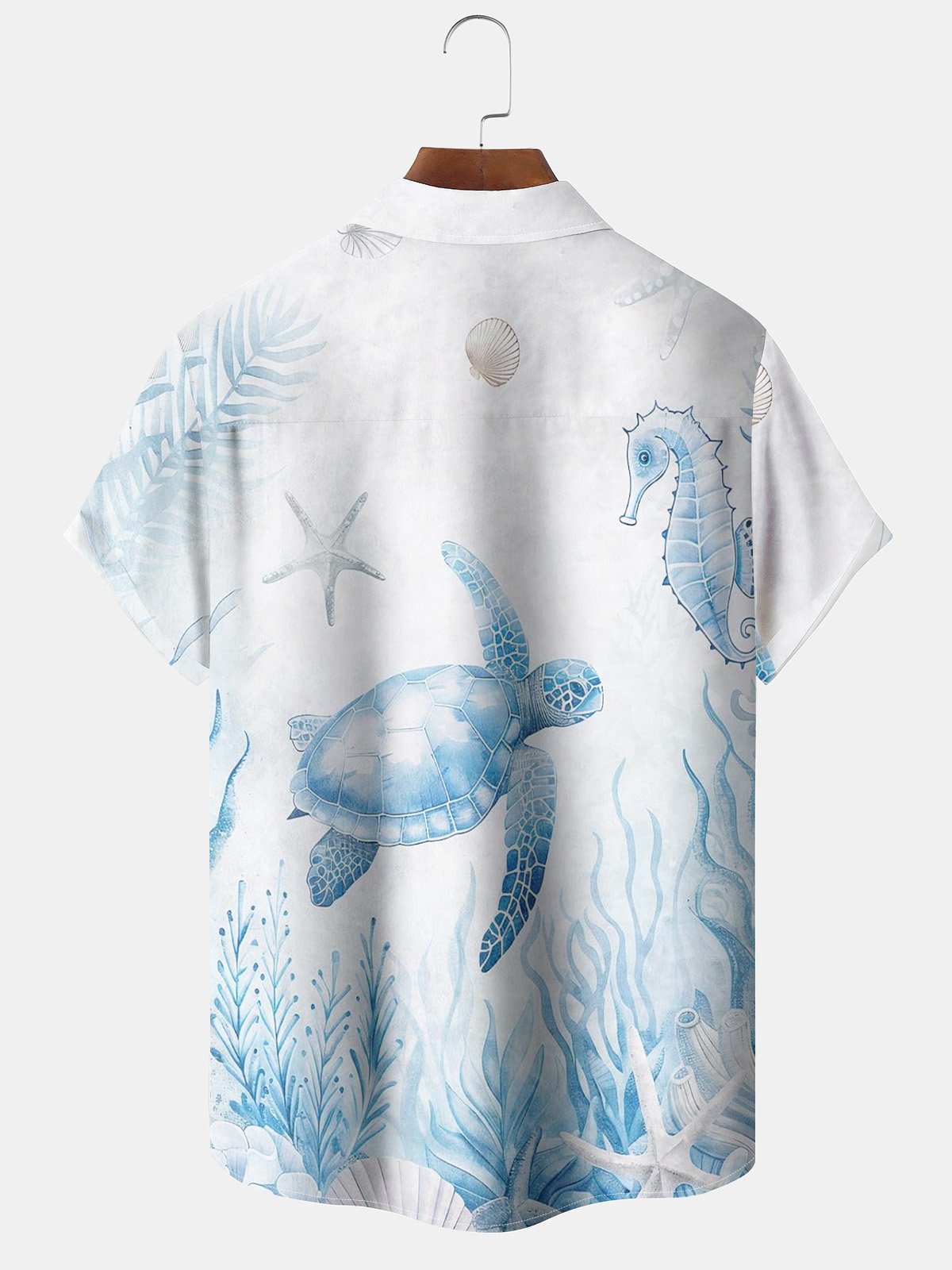 Alohadaddy Hawaiian Sea Turtle Seahorse Print Art Chest Pocket Stretch Short Sleeve Shirt