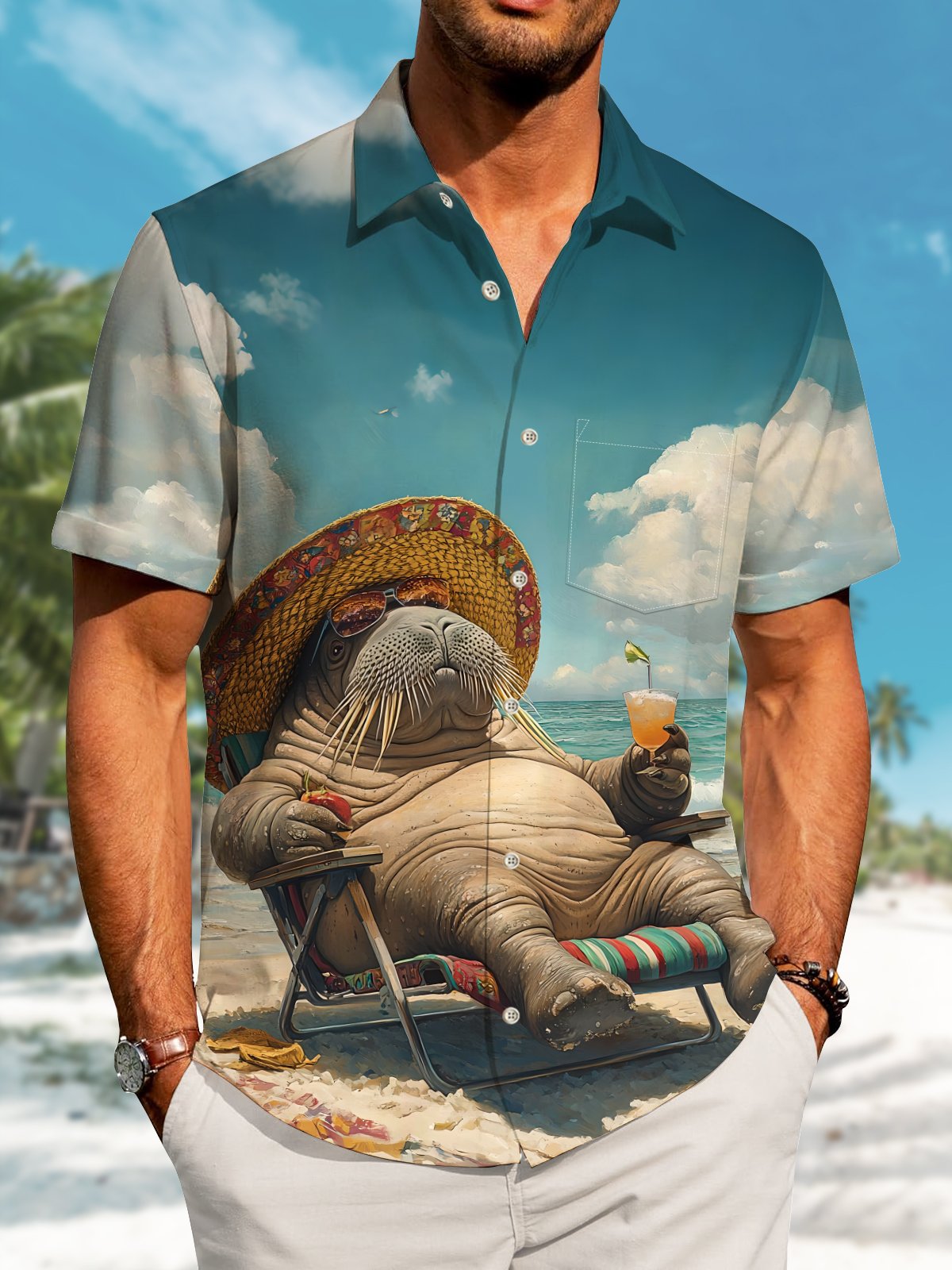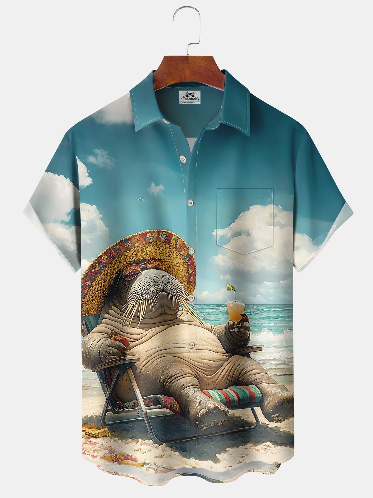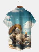 Alohadaddy Hawaiian Vacation Seal Print Art Loose Cardigan Button Pocket Stretch Long Large Size Short Sleeve Shirt