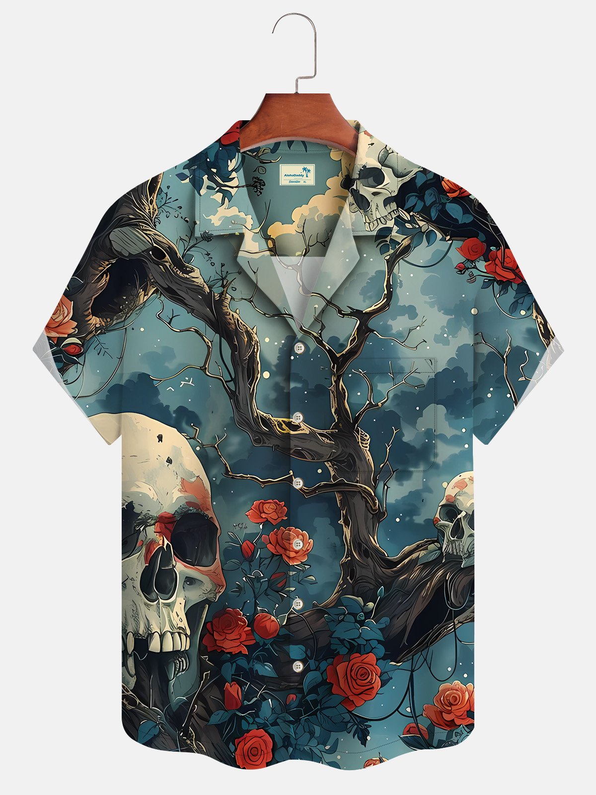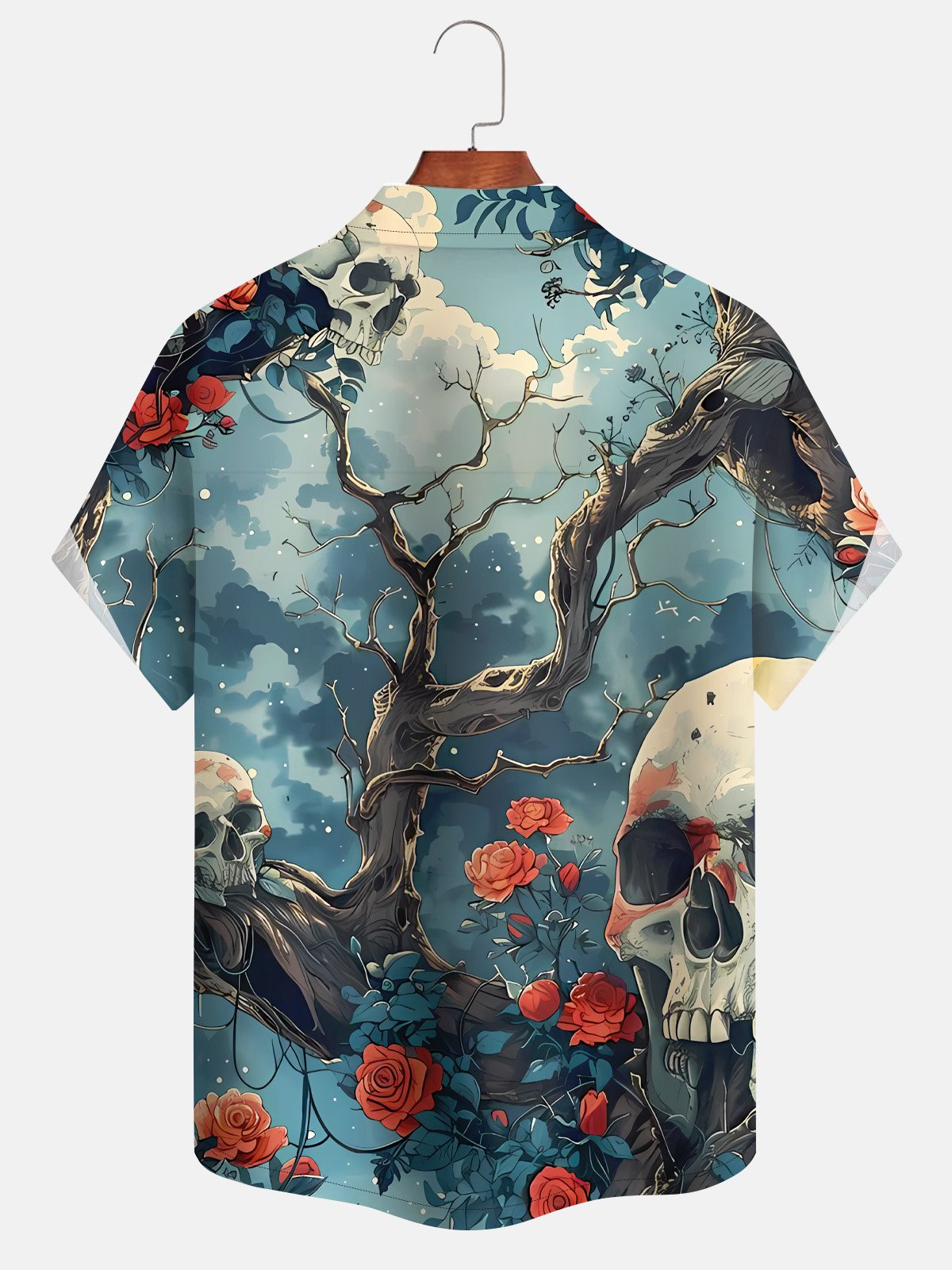 Alohadaddy Retro Plant Skull Flower Button Pocket Casual Short Sleeve Shirt