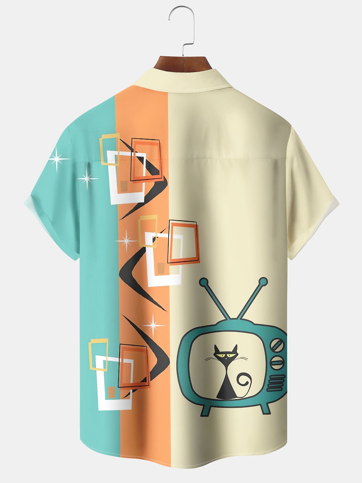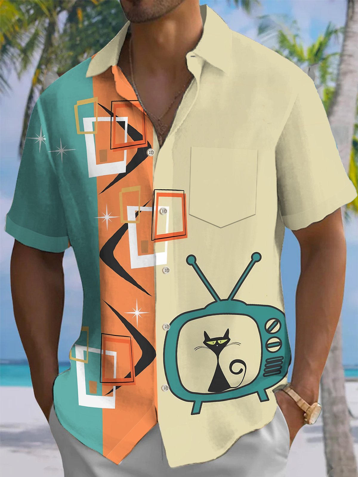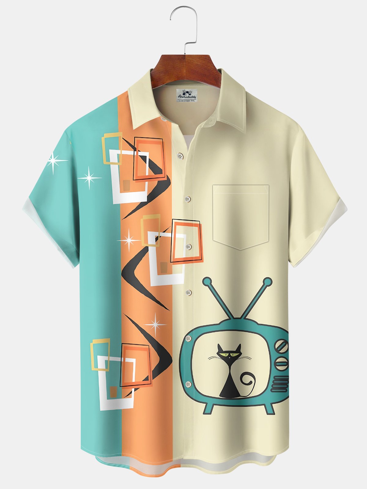 Alohadaddy® Retro Atomic Geometric Cat Print Pocket Elastic Button Men's Short Sleeve Shirt Big & Tall