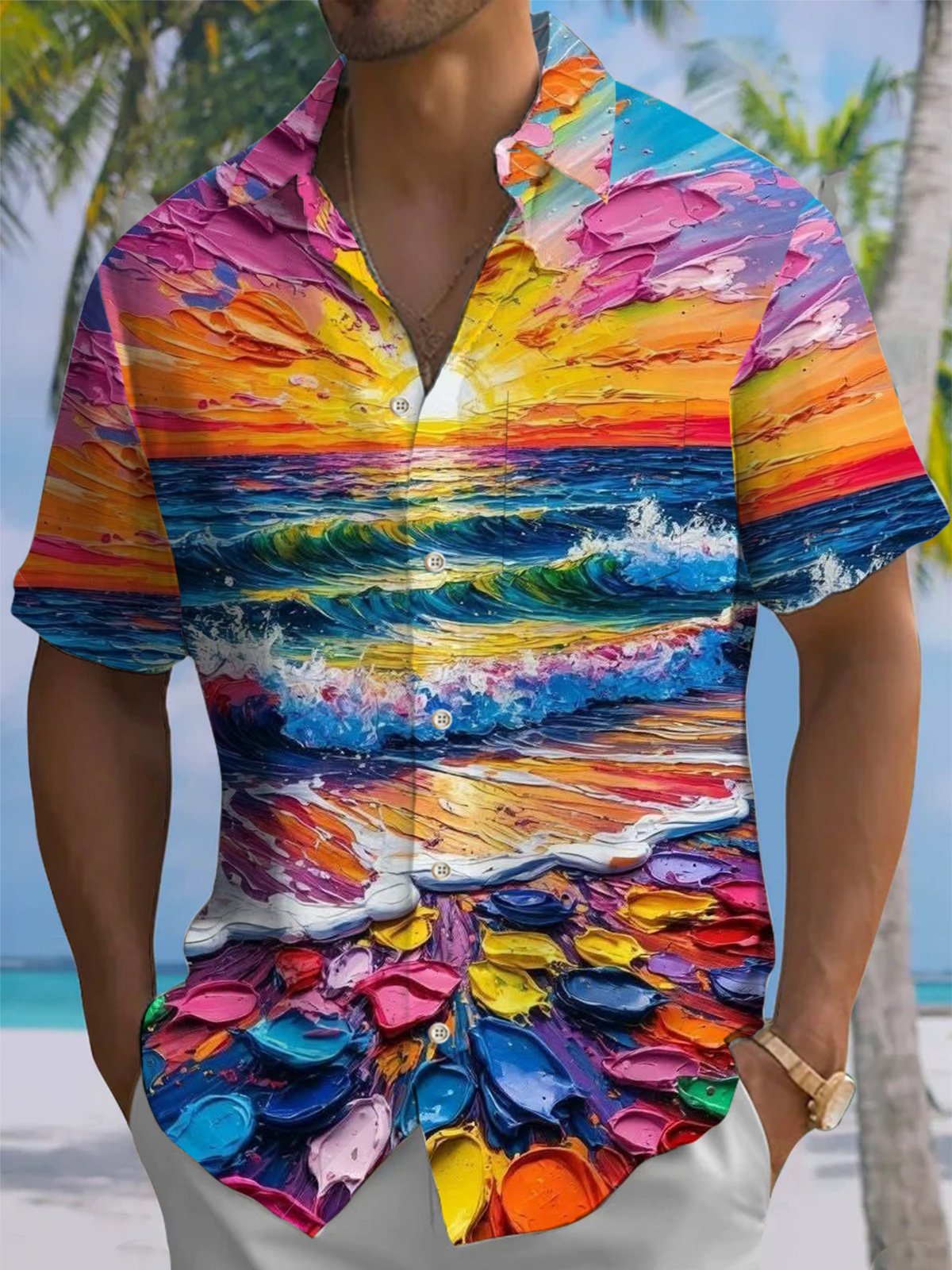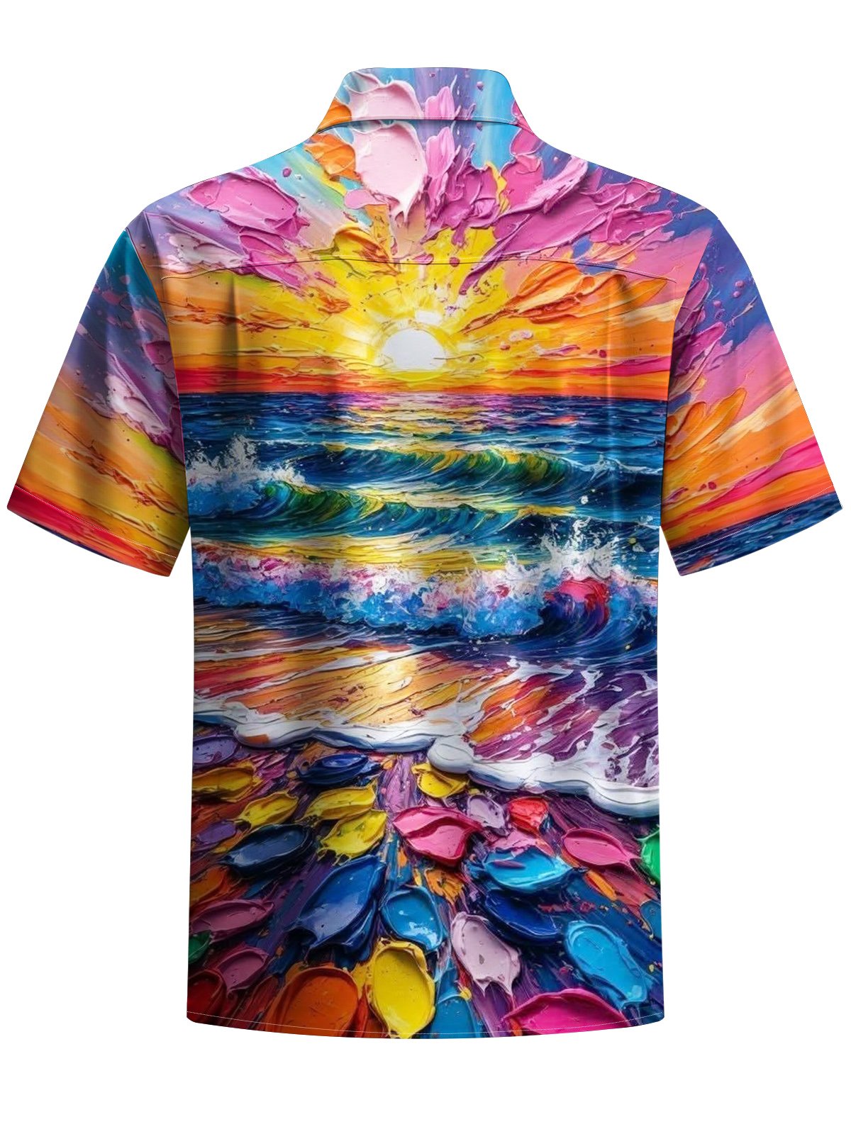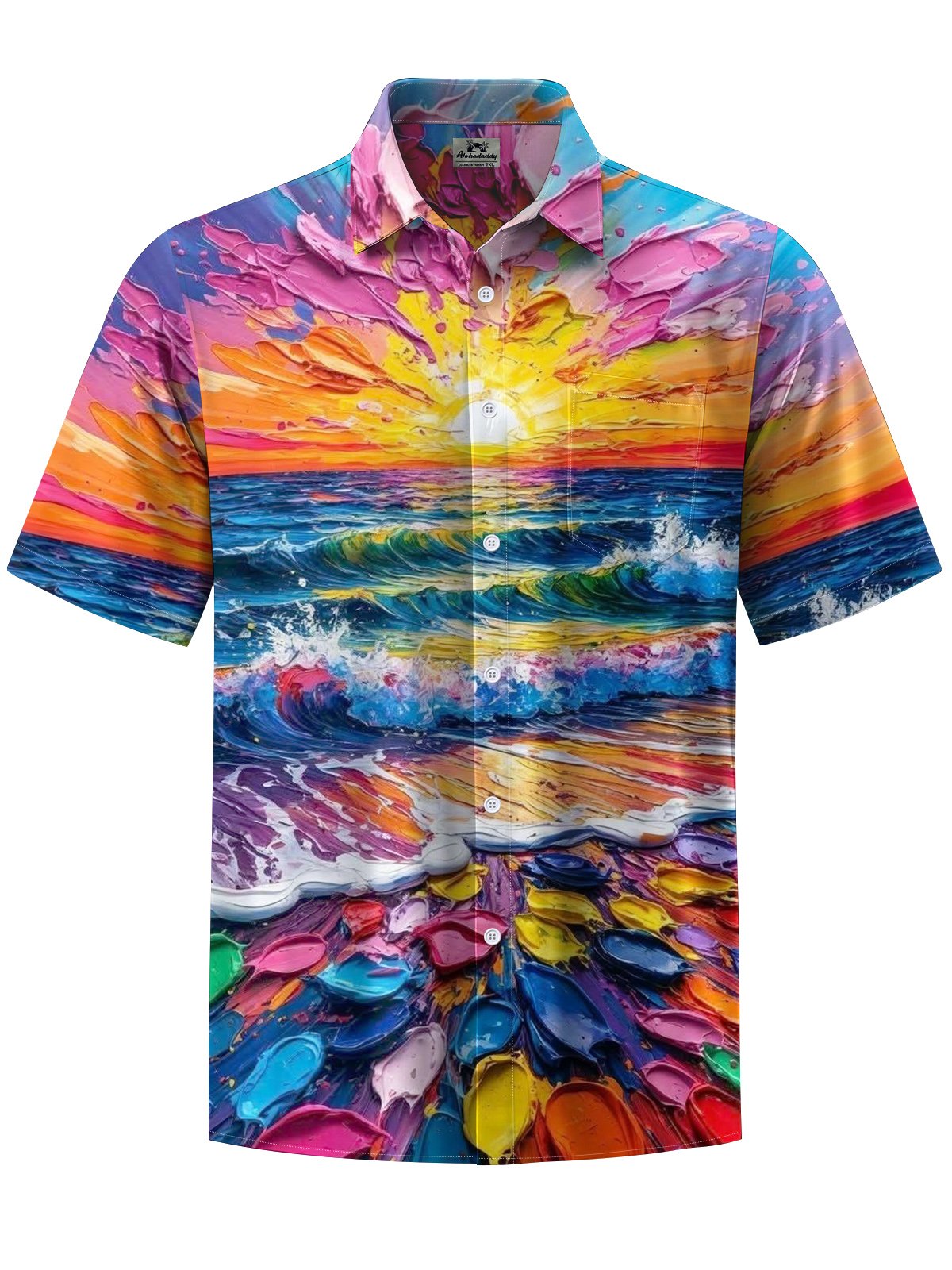 Alohadaddy® Acrylic Painting Beach Print Art Elastic Pocket Button Men's Short Sleeve Shirt Big & Tall