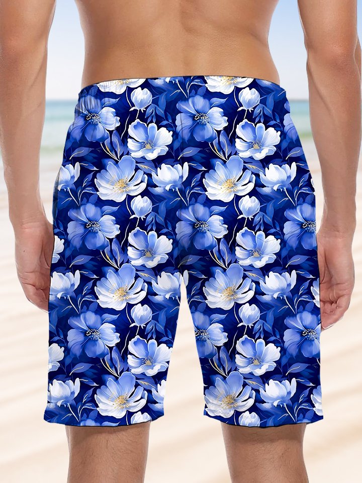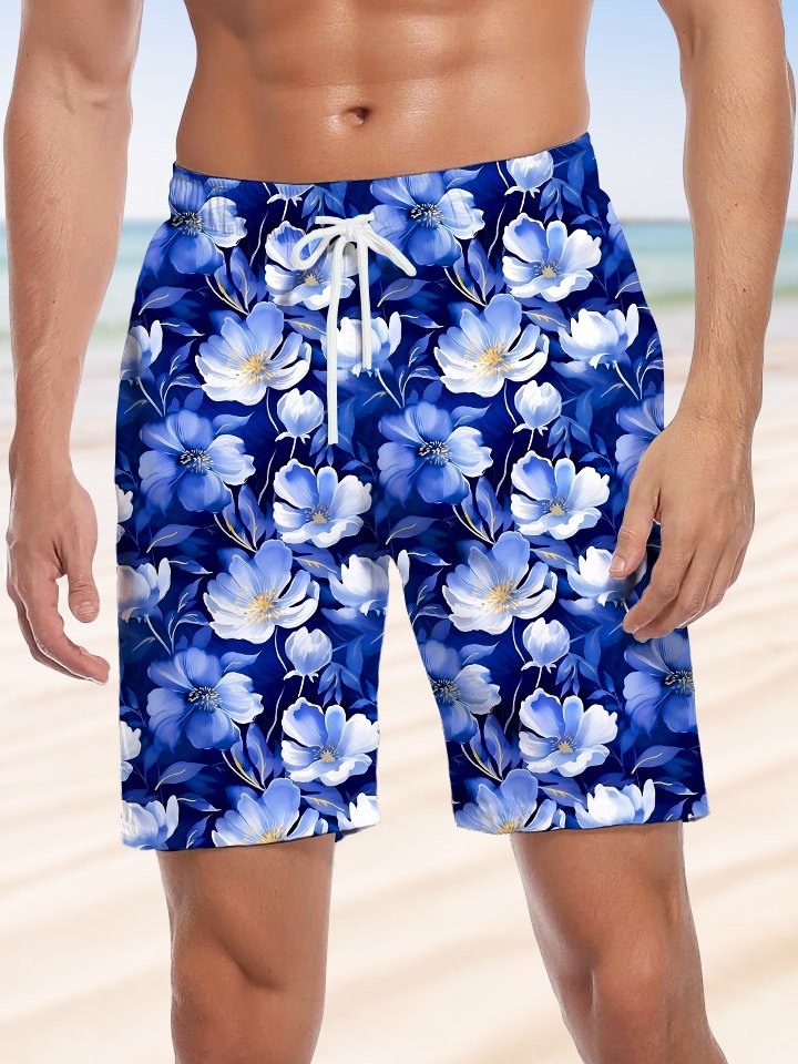 Alohadaddy® Hawaiian Flowers Art Print Drawstring Men's Beach Shorts Big & Tall