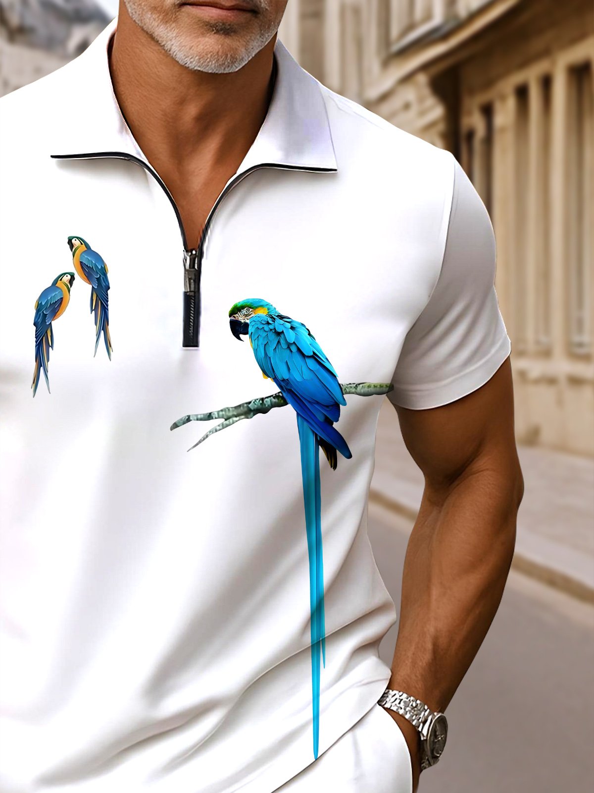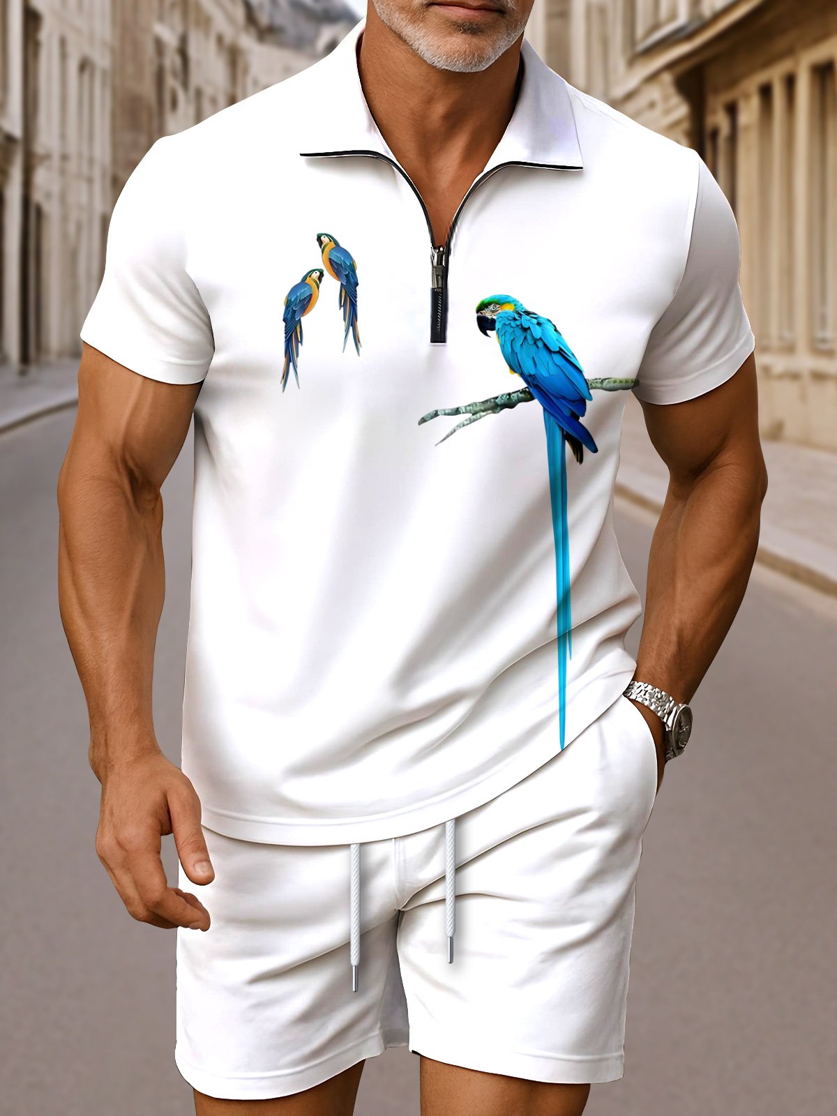 Casual Parrot Print Moisture Wicking Men's Short Sleeve Polo Shirt Set