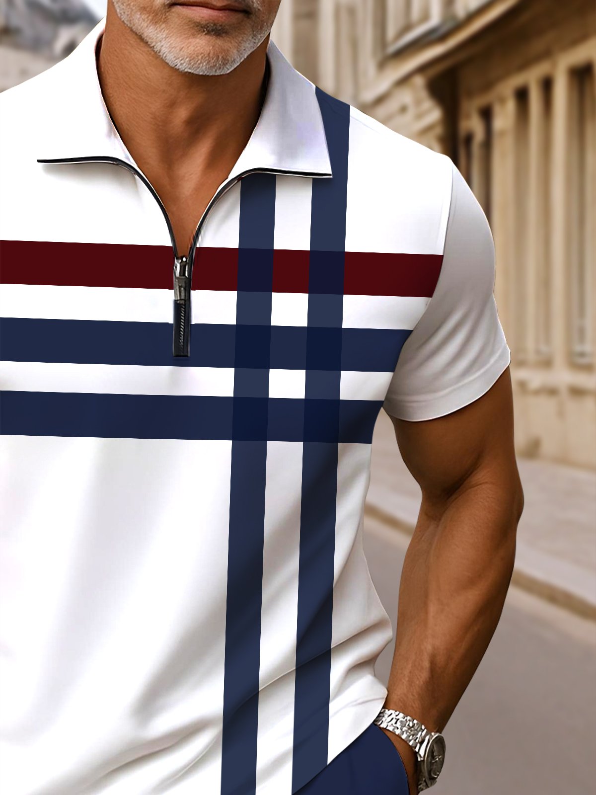 Alohadaddy® Casual Stripes Printed Moisture Wicking Zipper Men's Short Sleeve Polo Shirt Shorts Set