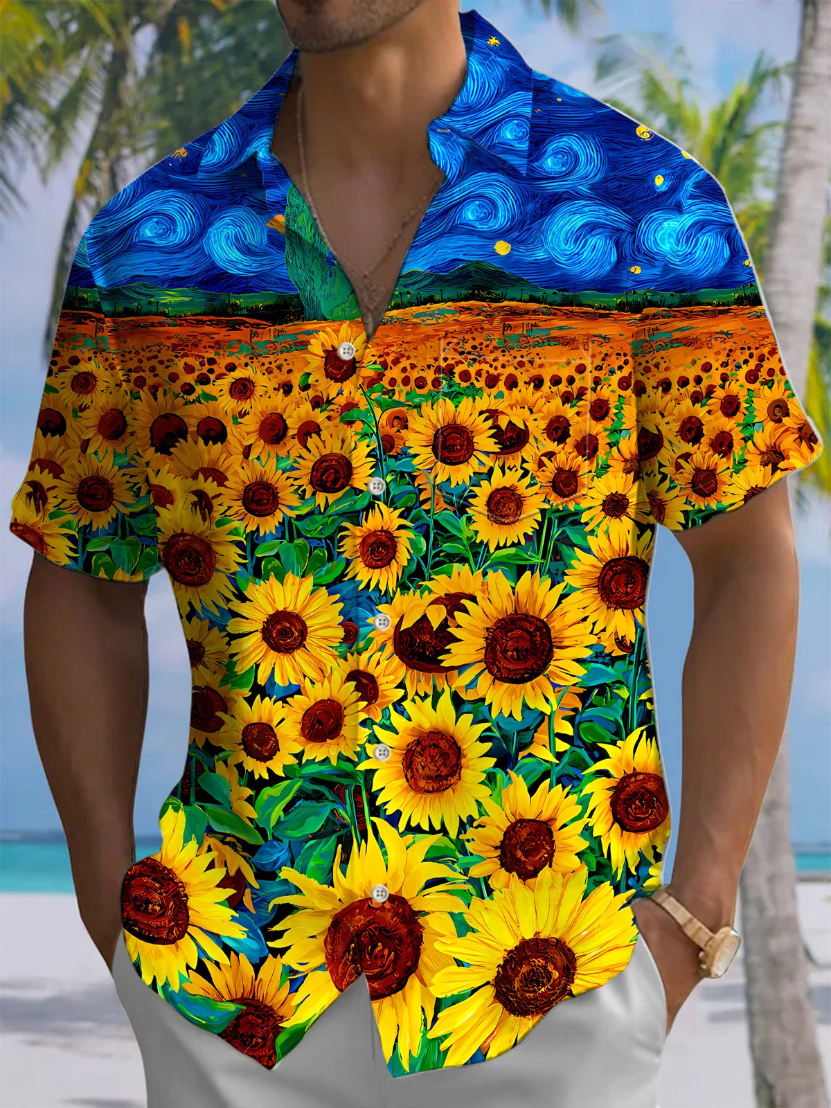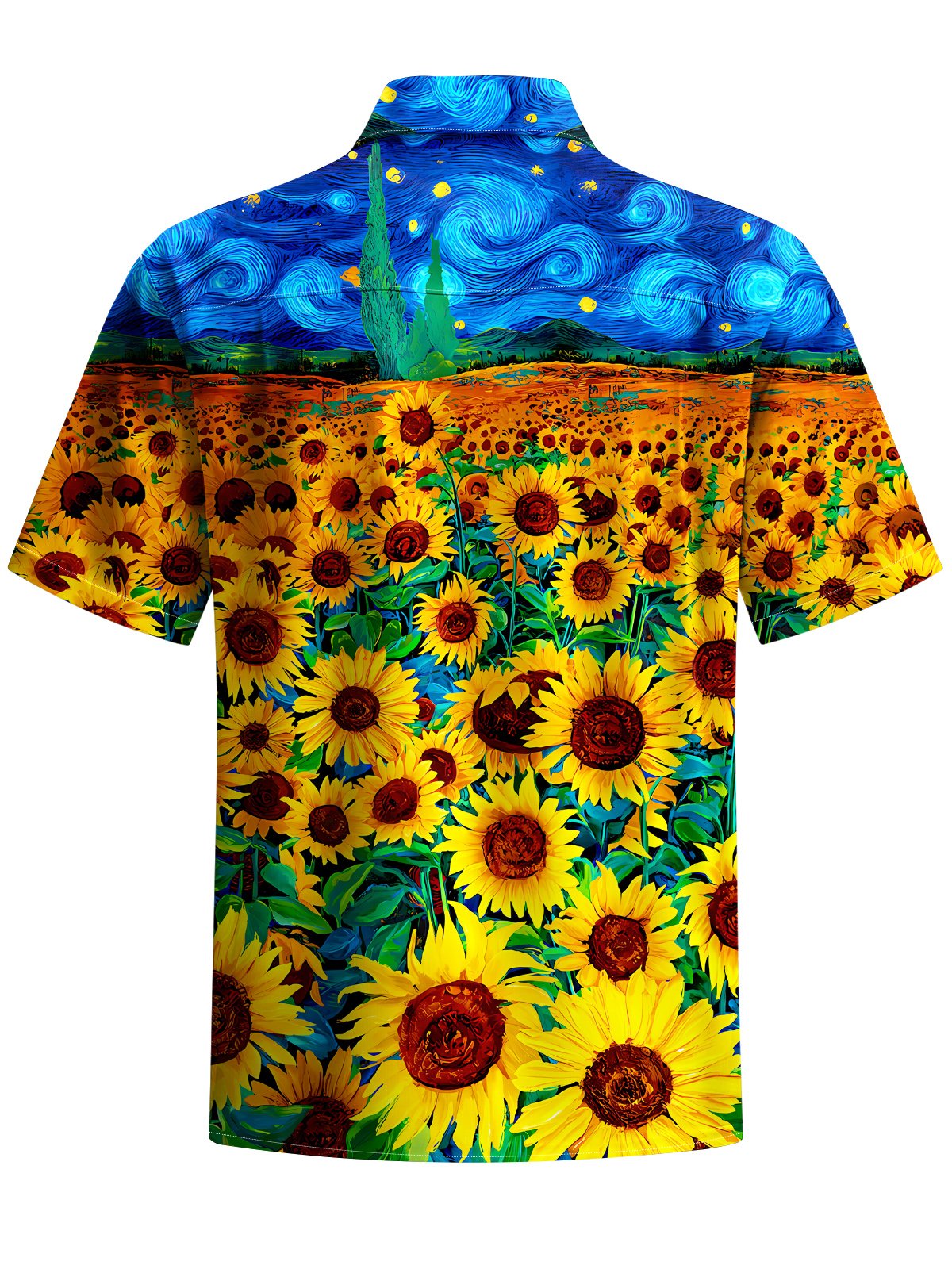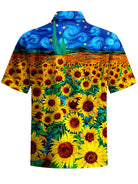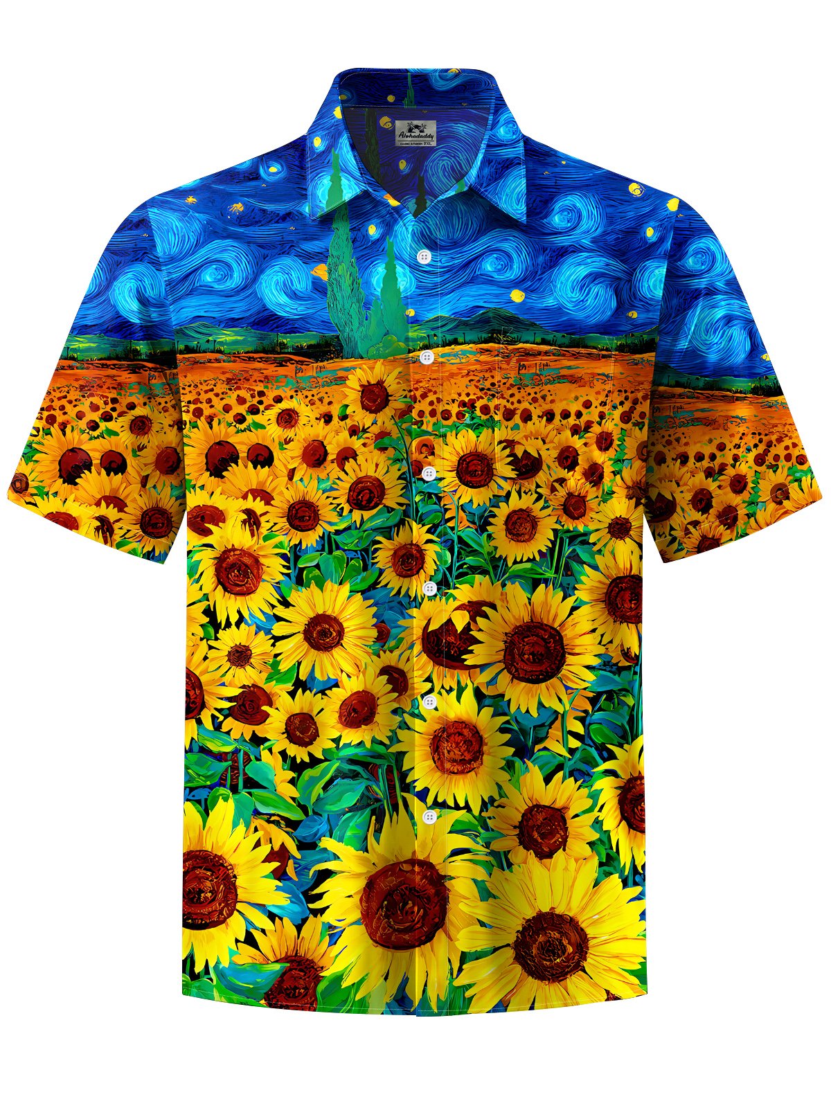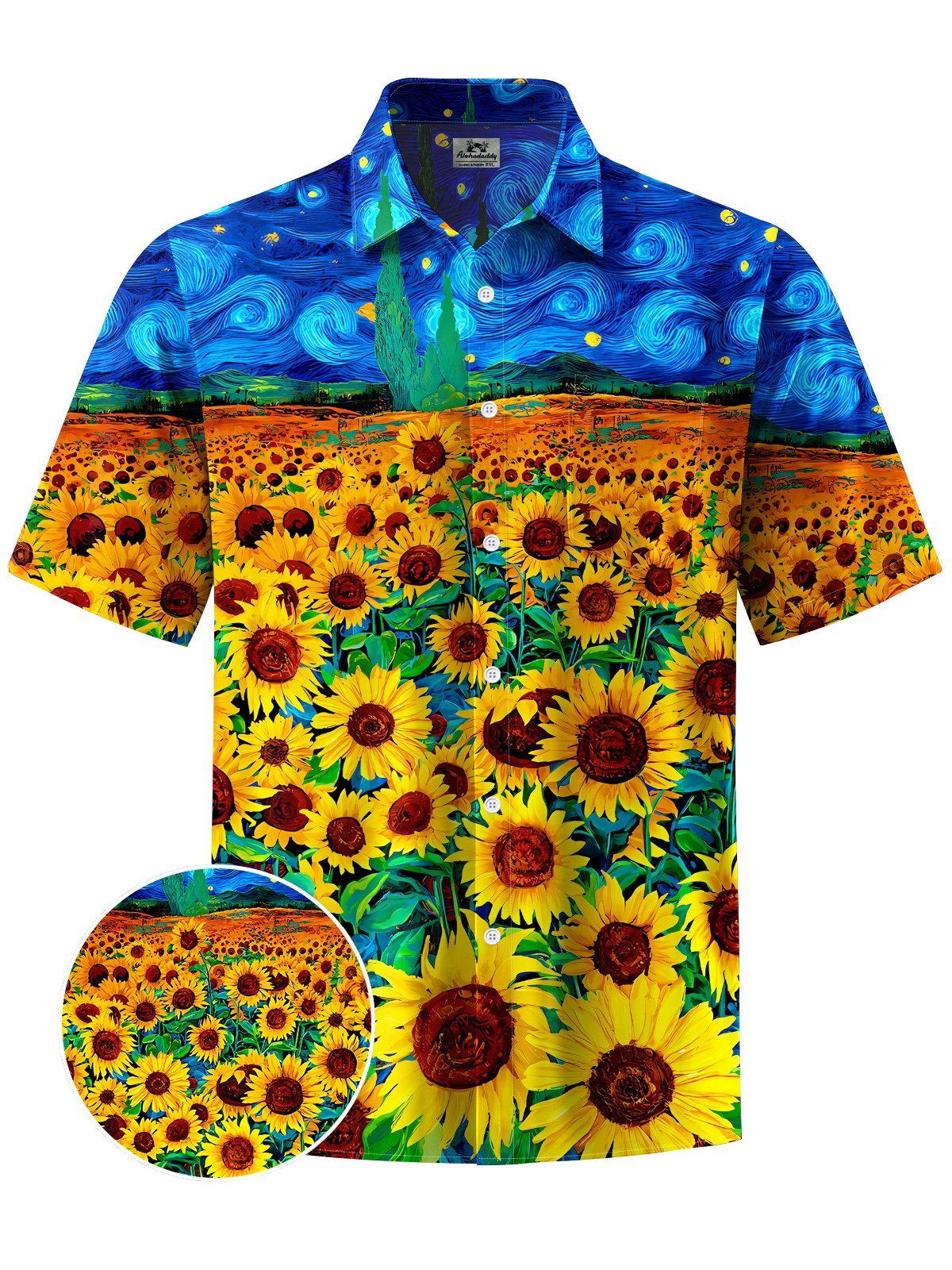 Alohadaddy® Hawaiian Sunflowers Oil Painting Print Chest Pocket Men's Short Sleeve Shirt Big & Tall