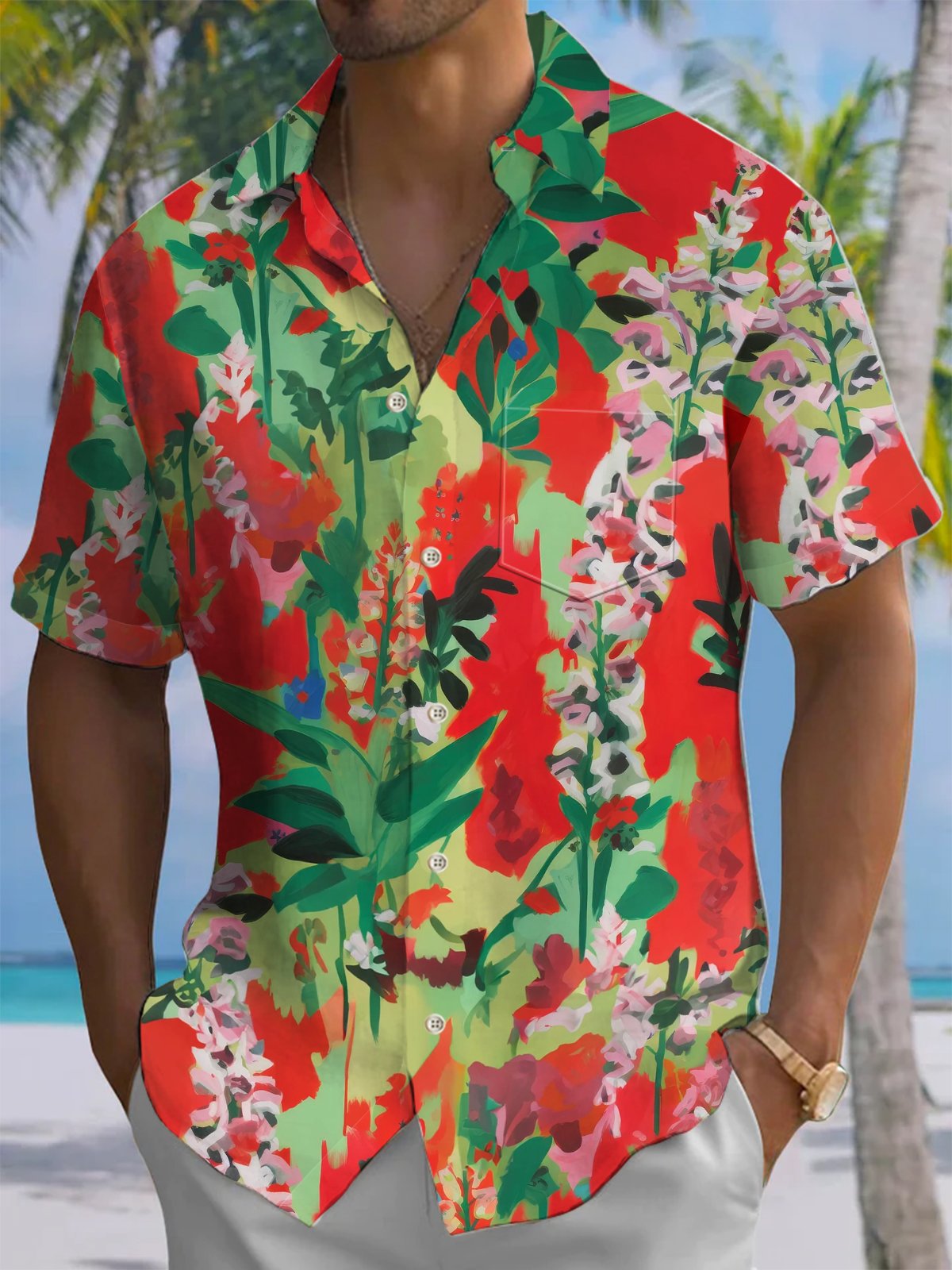 Alohadaddy® Hawaiian Tropical Flower Art Print with Chest Pocket and Elasticity for Men's Short Sleeve Shirt Big & Tall