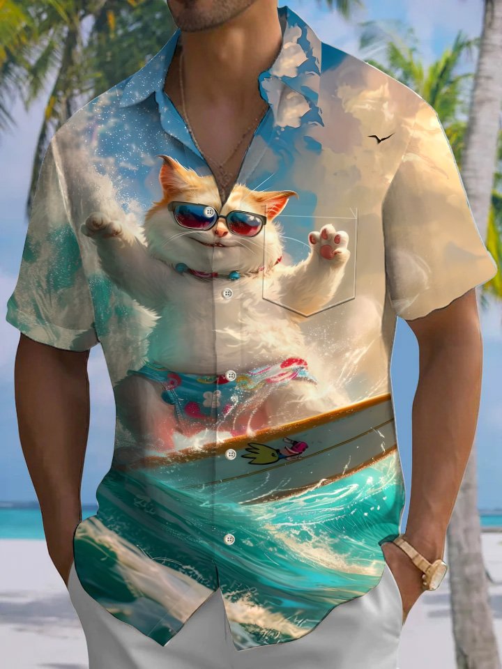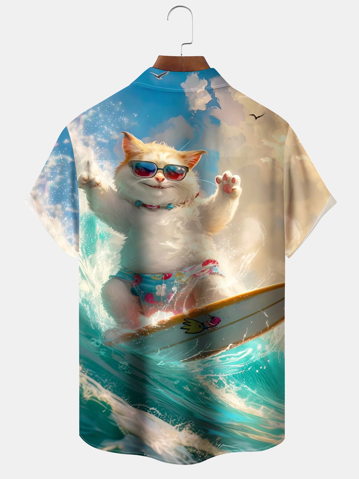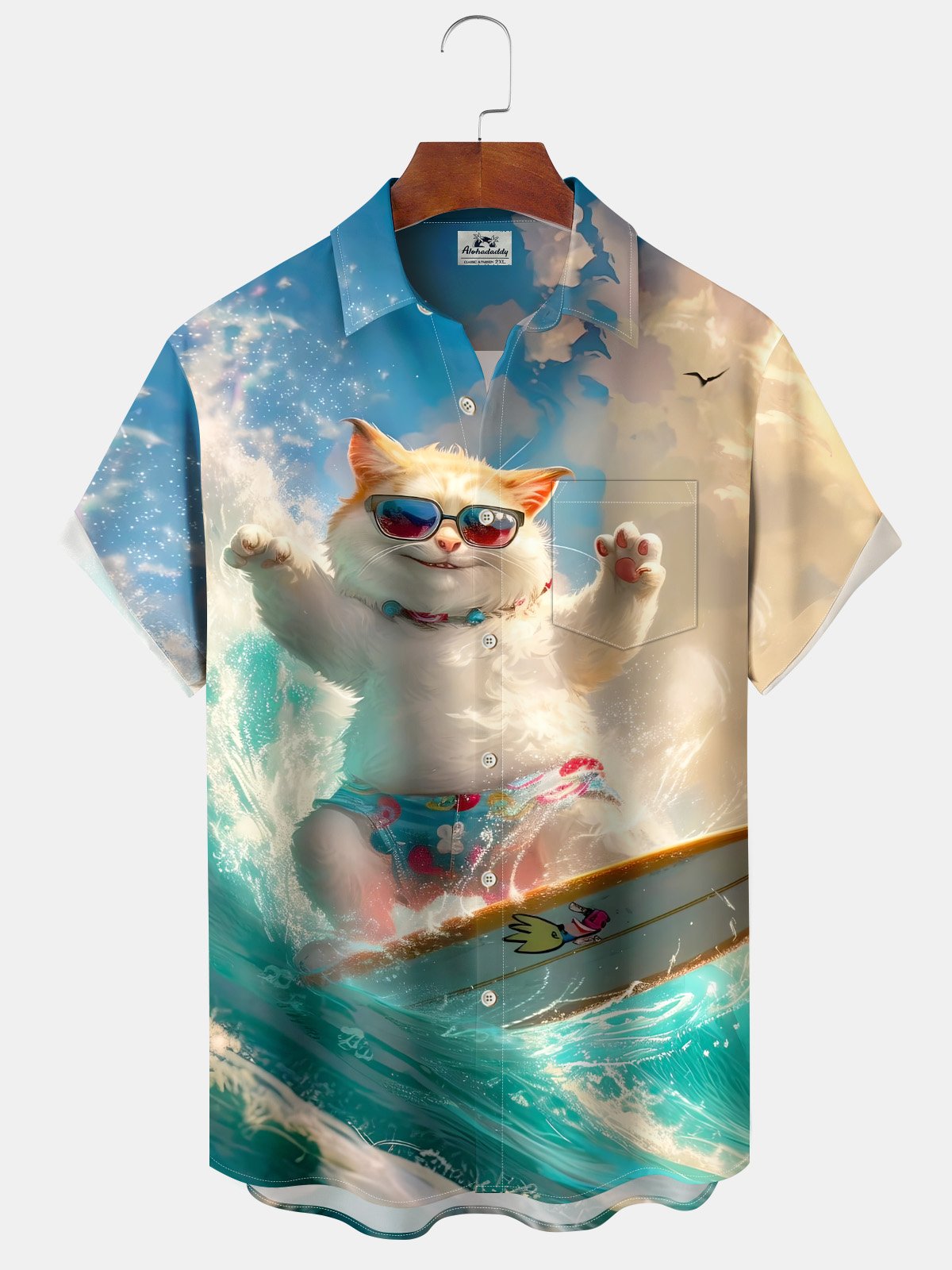 Alohadaddy Casual Surf Cat Art Print Moisture Wicking Chest Pocket Hawaiian Short Sleeve Shirt