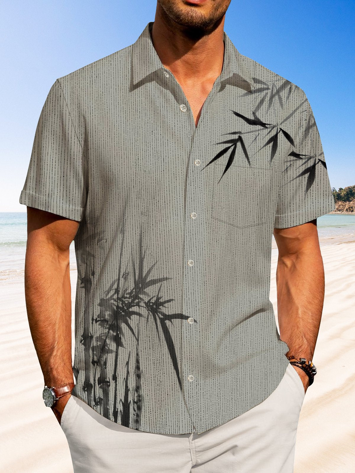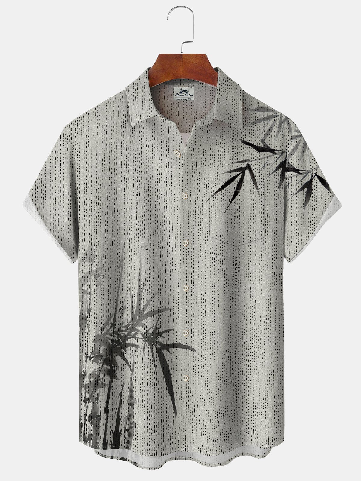 Alohadaddy Hawaiian Casual Ink Bamboo Print Art Pocket Button Cardigan Stretch Large Size Short Sleeve Shirt