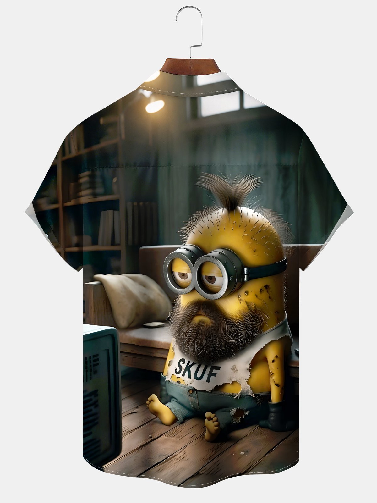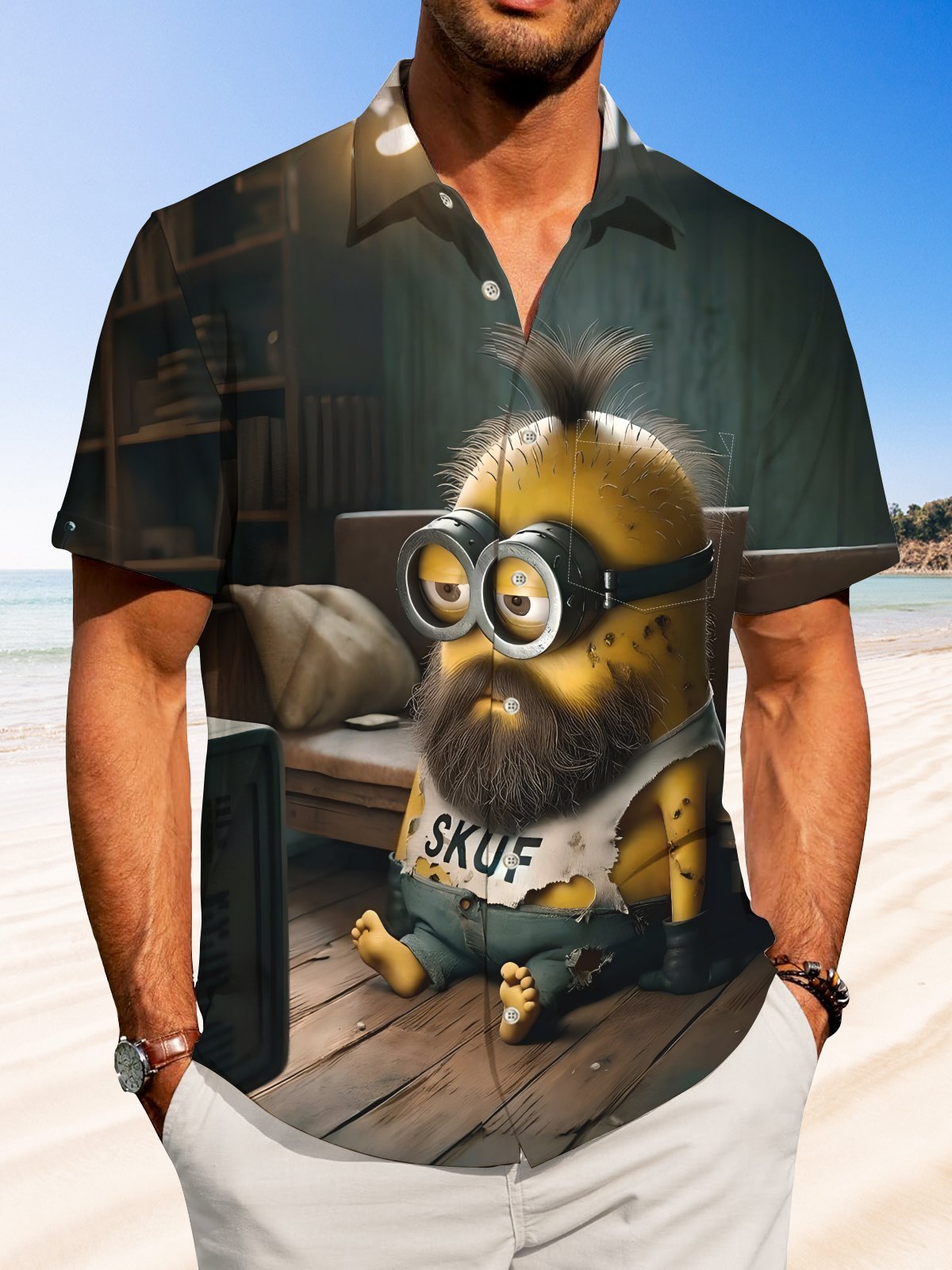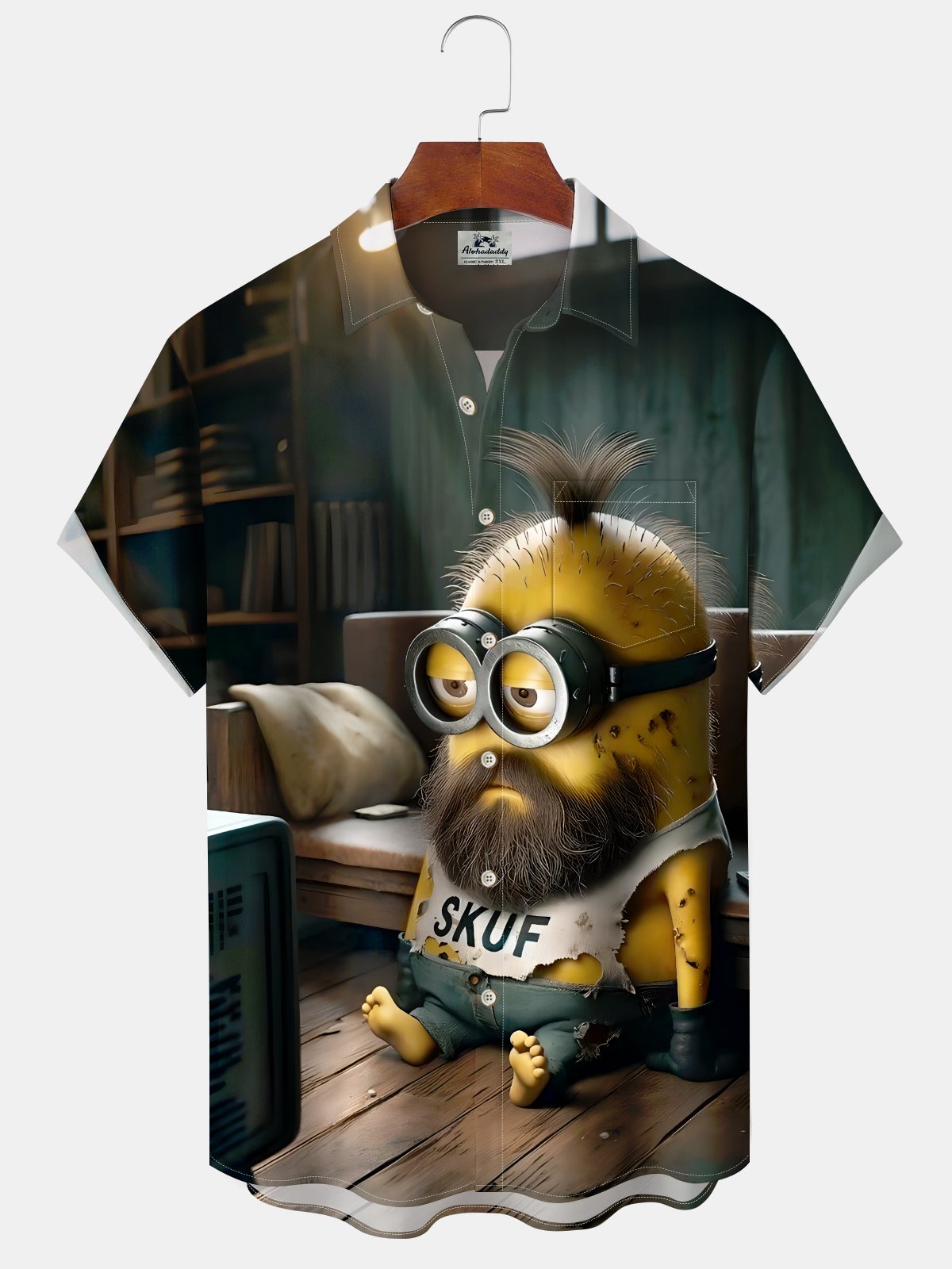 Alohadaddy Hawaiian Casual Minions Print Art Pocket Button Cardigan Stretch Large Size Short Sleeve Shirt