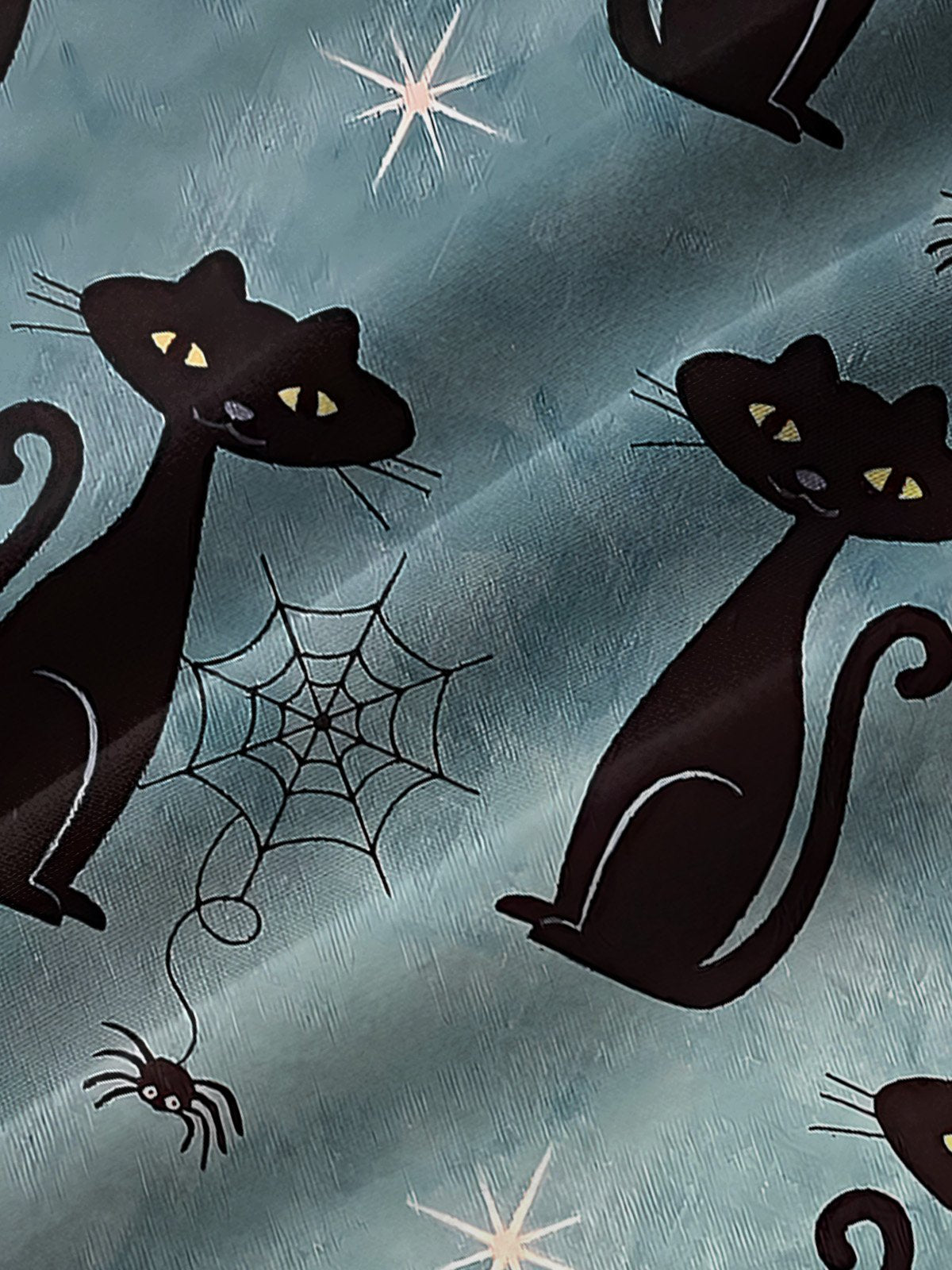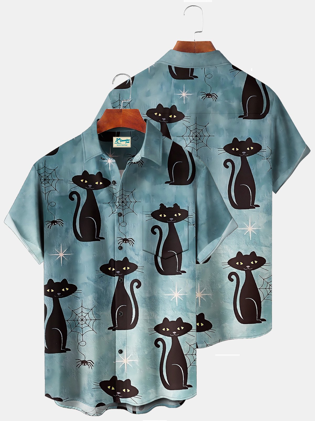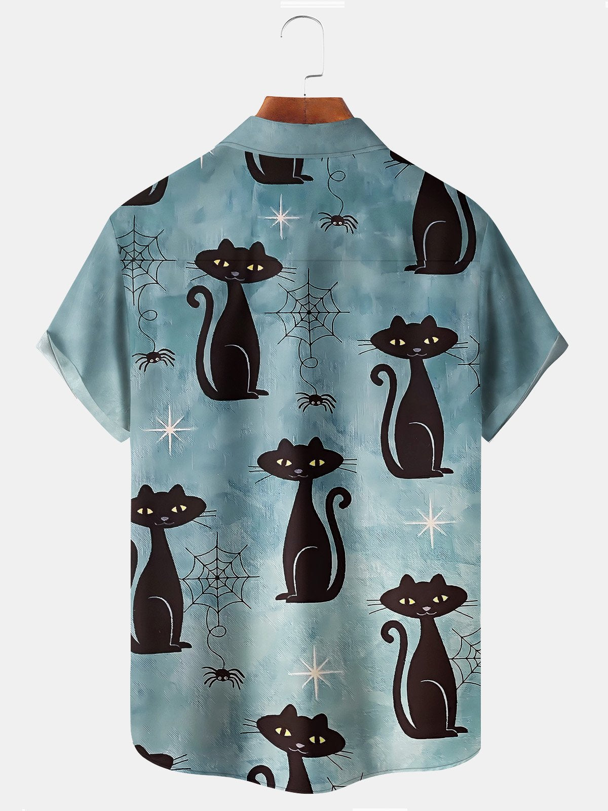 Camisas hawaianas para hombre con diseño de gato negro y azul claro de Halloween de Alohadaddy, camisas elásticas divertidas con botones de campamento Aloha con dibujos animados de telaraña