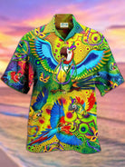Camisas hawaianas verdes para hombre con estampado de loro y arte divertido Alohadaddy Mardi Gras Holiday Camisas elásticas con bolsillos para campamento y botones Aloha Big Tall