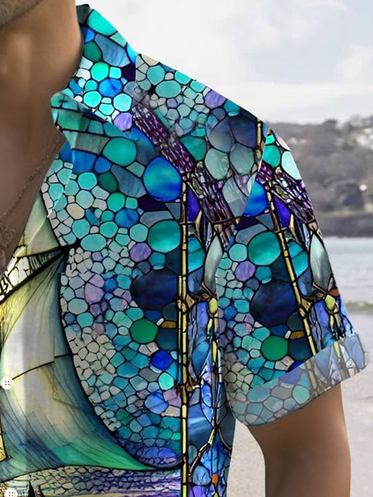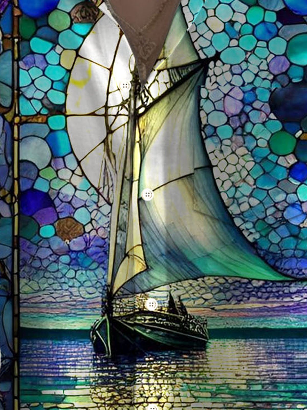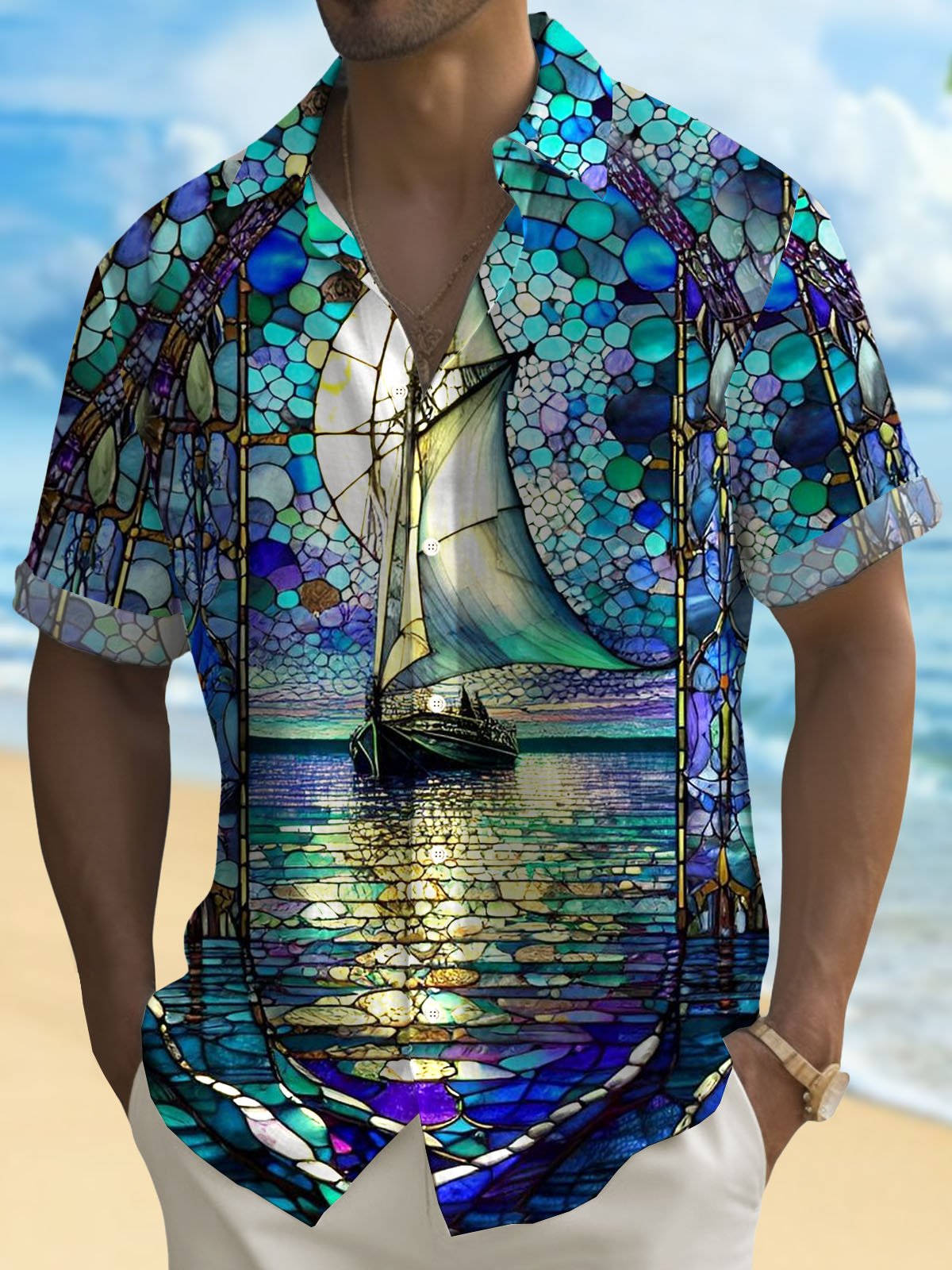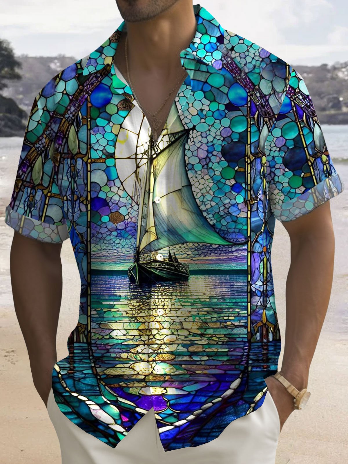 Camisa de manga corta con bolsillo abotonado para hombre con estampado de pintura al óleo y arte de navegación hawaiana de Alohadaddy