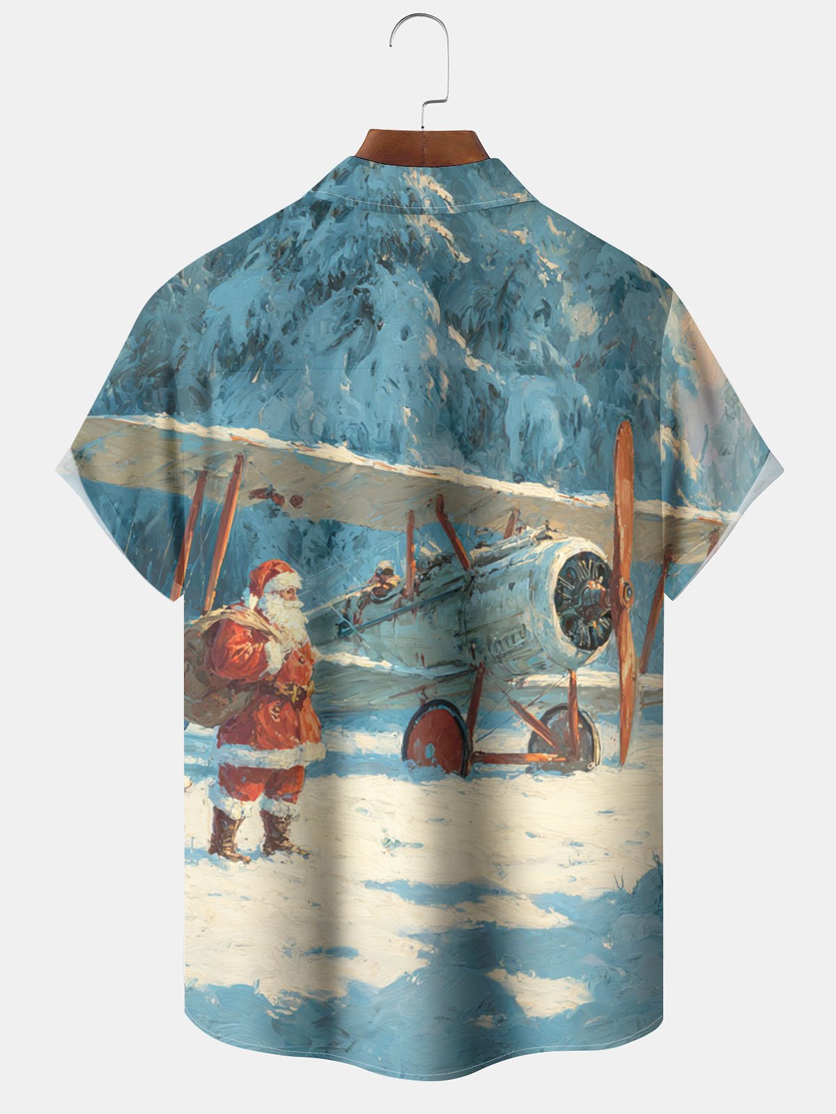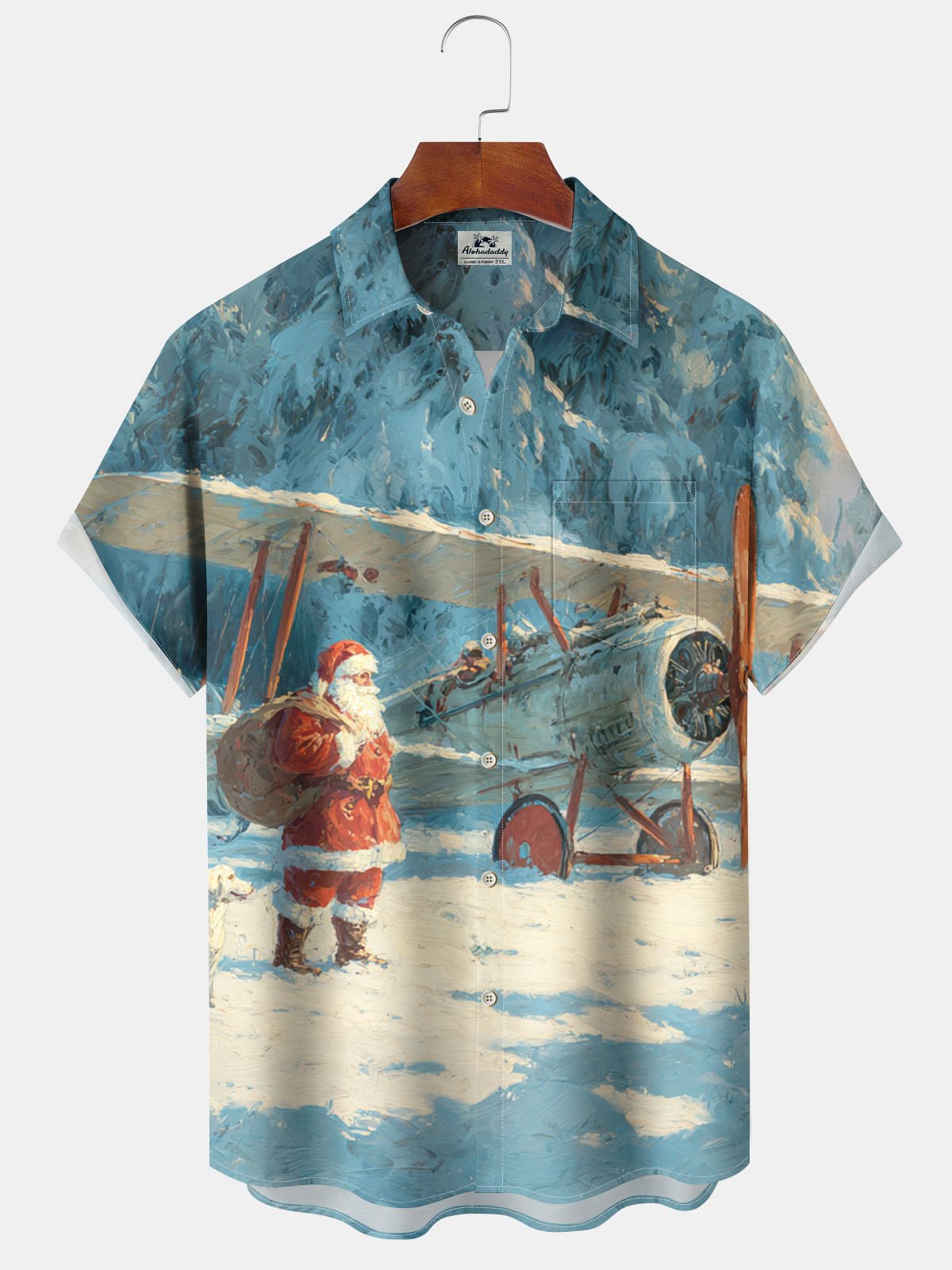 Alohadaddy® Christmas Biplane Santa Claus Printed Pocket Elastic Button Men's Short Sleeve Shirt Big & Tall