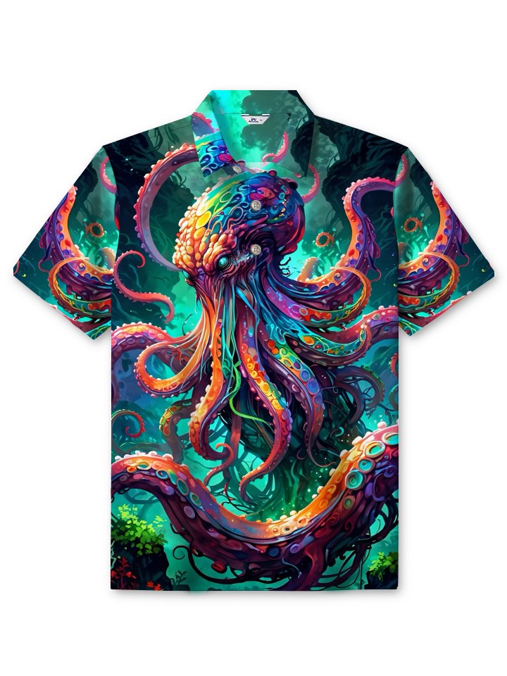 Alohadaddy® Hawaiian Octopus Print Button Lapel Elastic Large Size Short Sleeve Polo Shirt