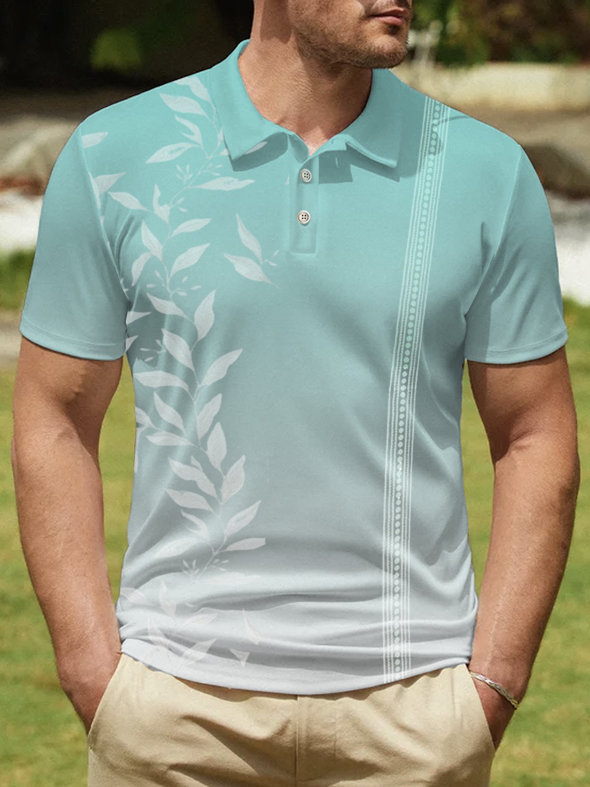 Polo de golf hawaiano de playa con estampado básico de hojas tropicales en degradado Alohadaddy para tallas grandes y altas
