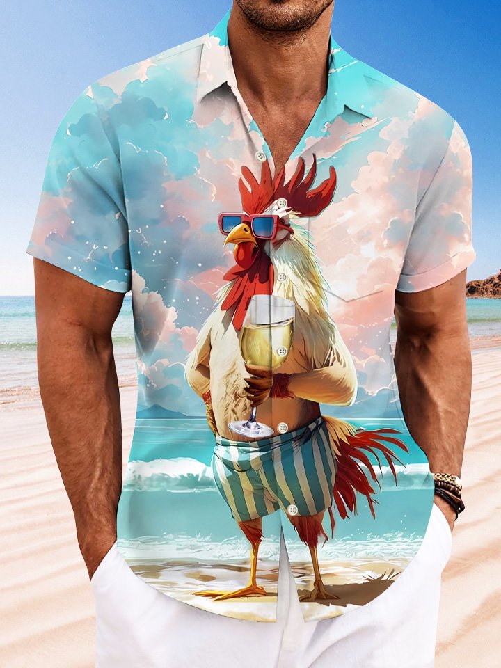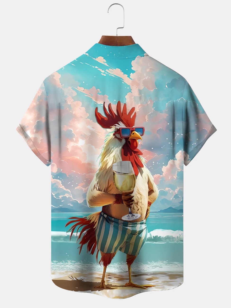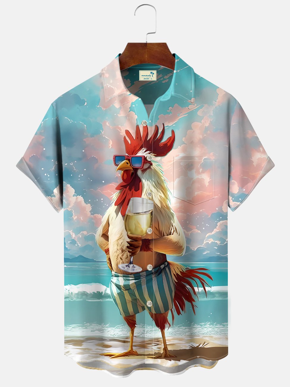 Camisa de manga corta de poliéster para hombre, informal, con botones y bolsillo, diseño divertido de gallo y playa de verano de Alohadaddy