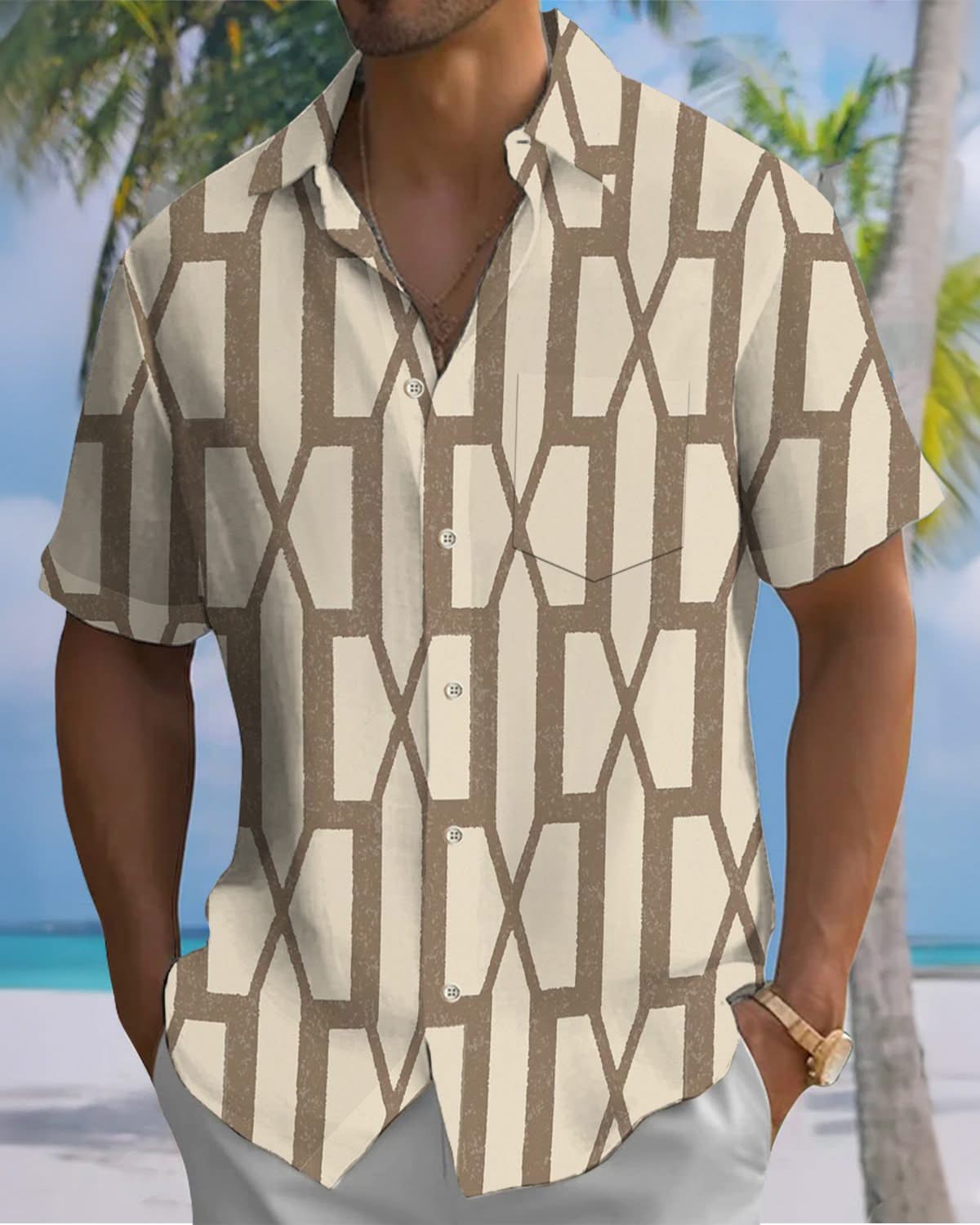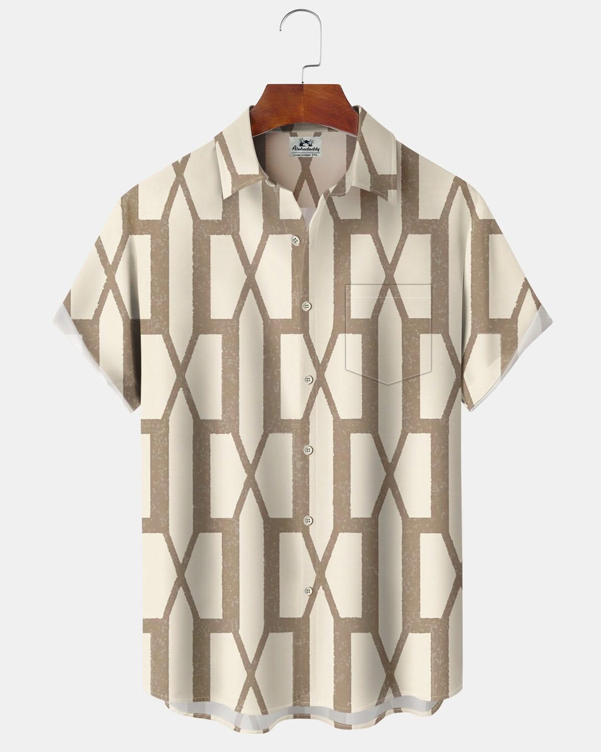 Alohadaddy® Retro Geometric Print Art Pocket Button Stretch Men's Short Sleeve Shirt Big & Tall
