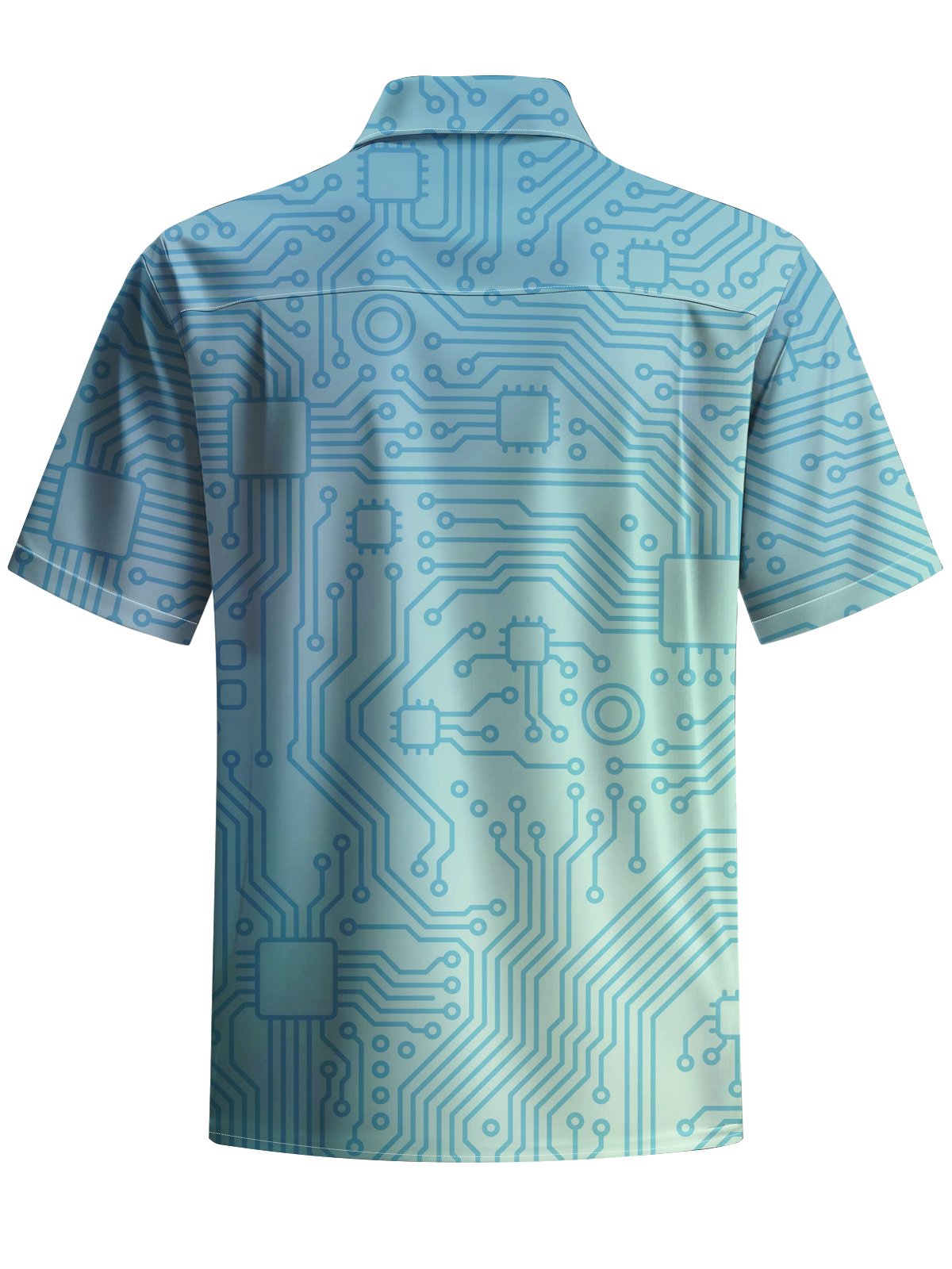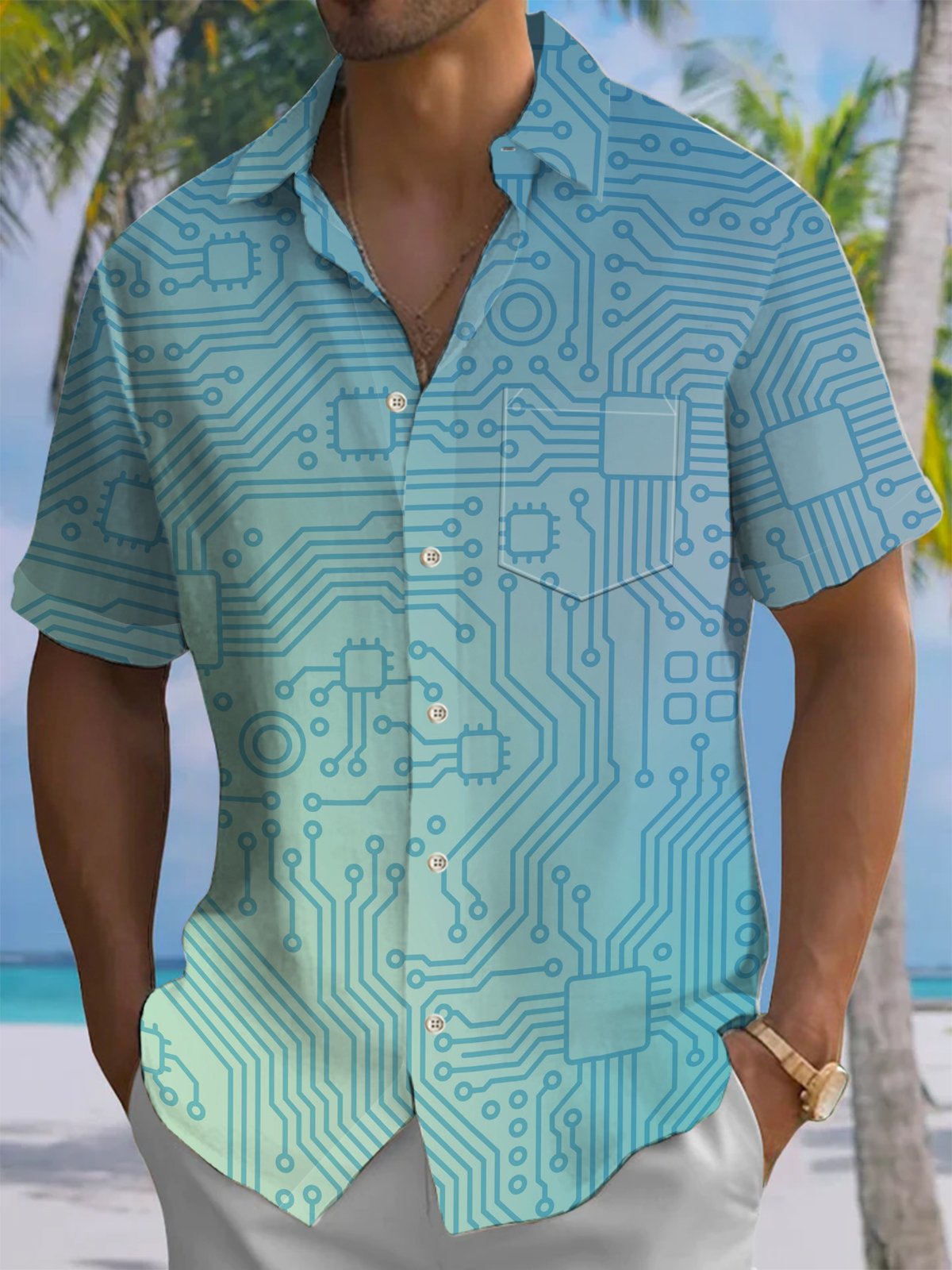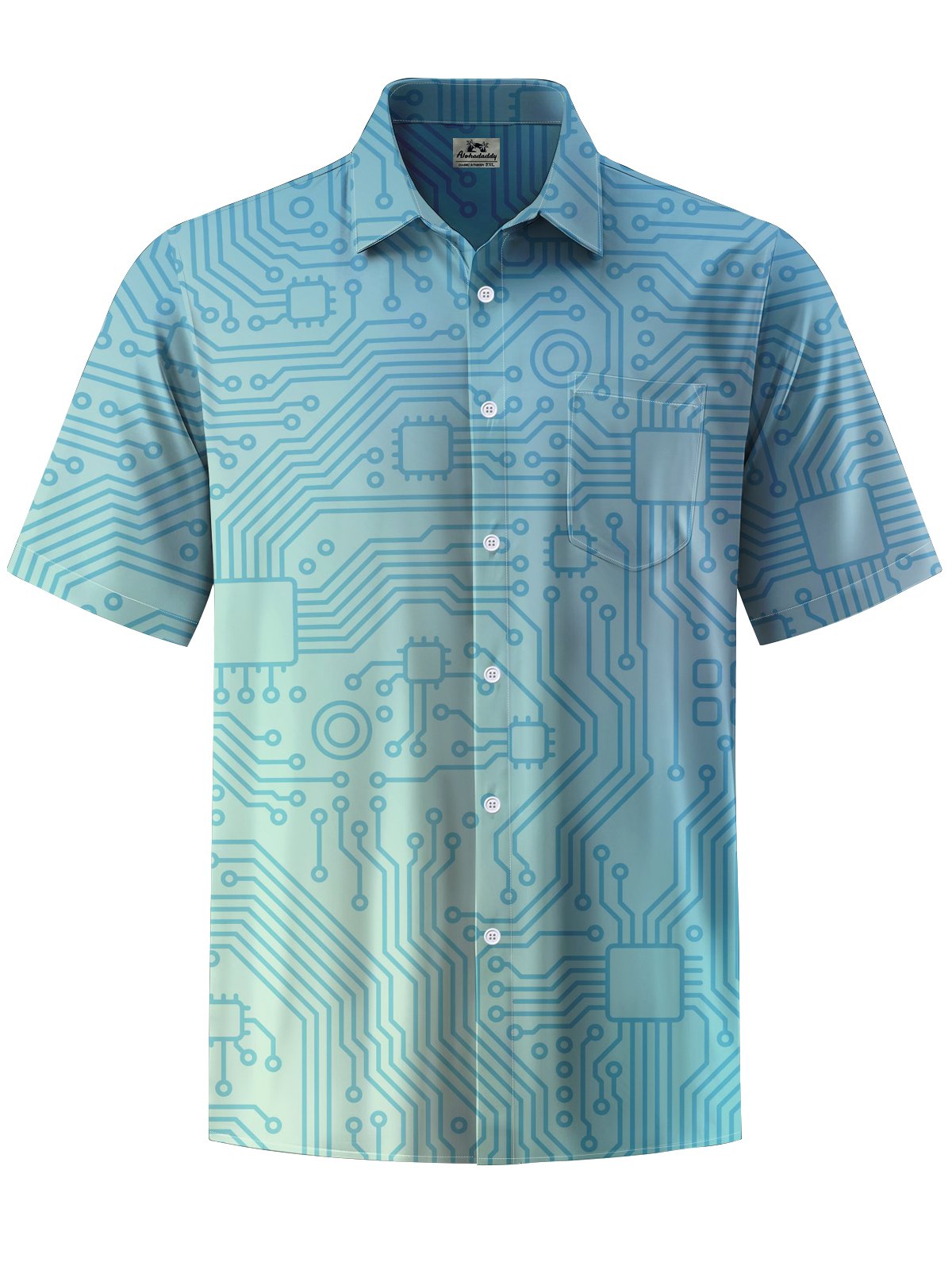 Alohadaddy® Casual Geometric Circuit Board Print Chest Pocket Men's Stretch Short Sleeve Ripped Shirt Big & Tall