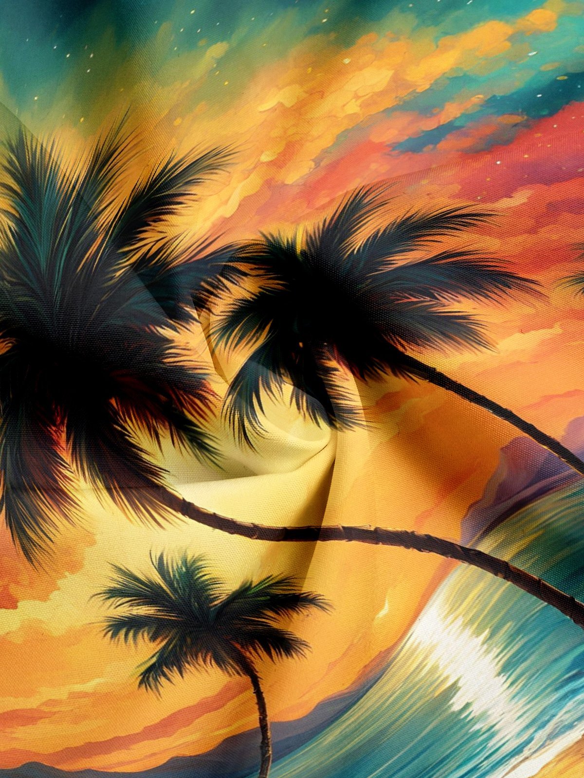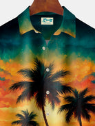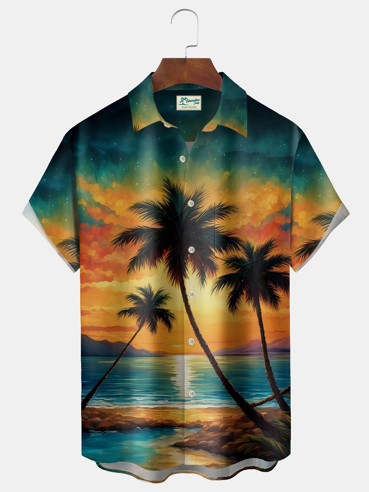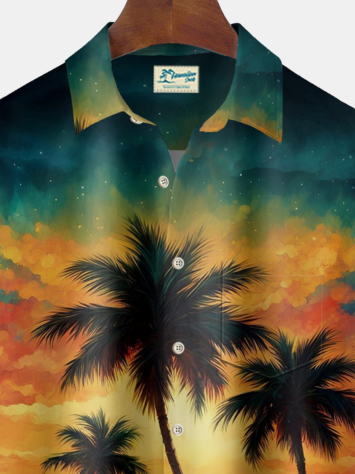 Camisa de manga corta con bolsillo abotonado para hombre con estampado digital 3D de paisaje al atardecer y cocoteros hawaianos de Alohadaddy, talla grande y alta