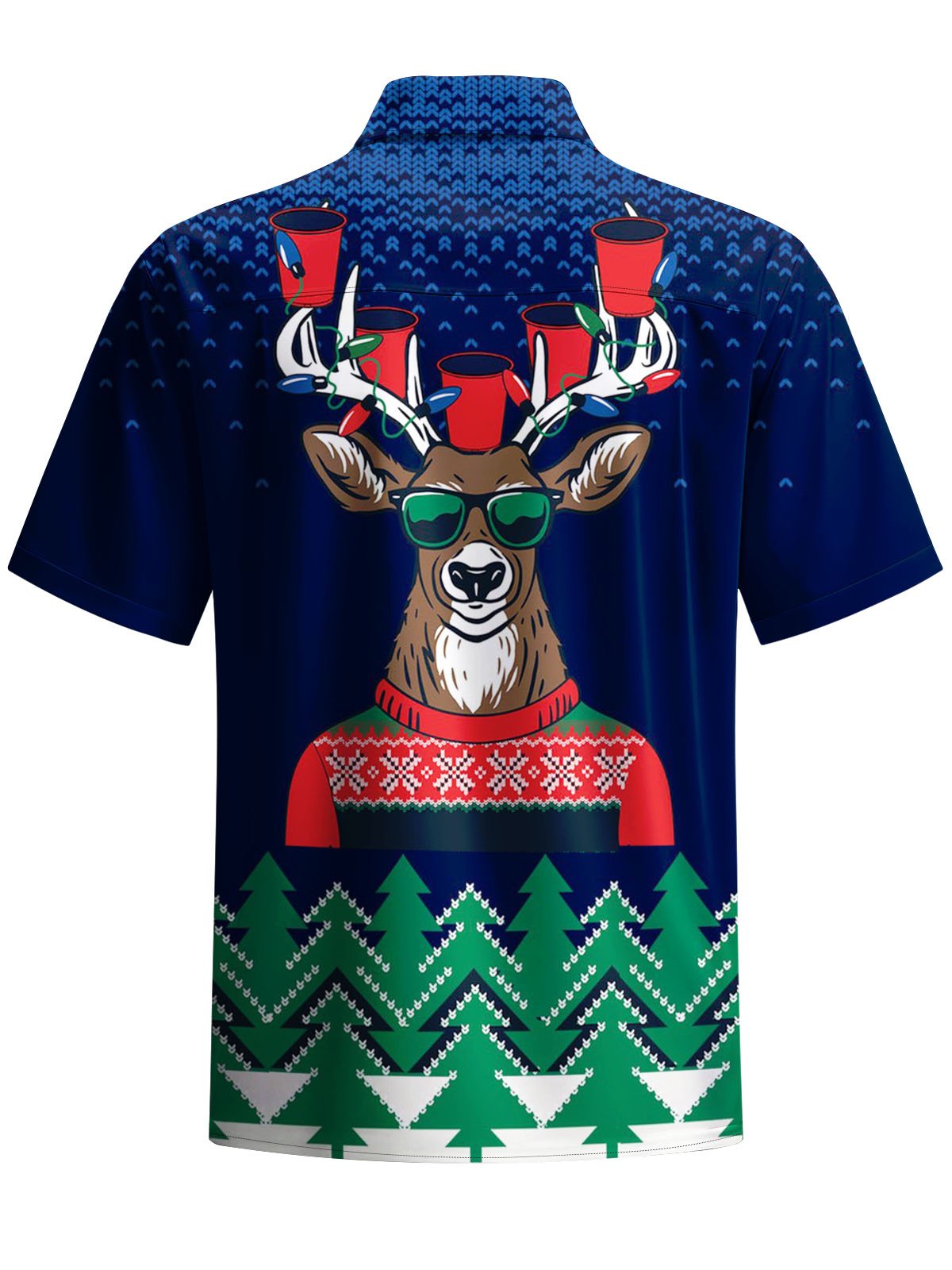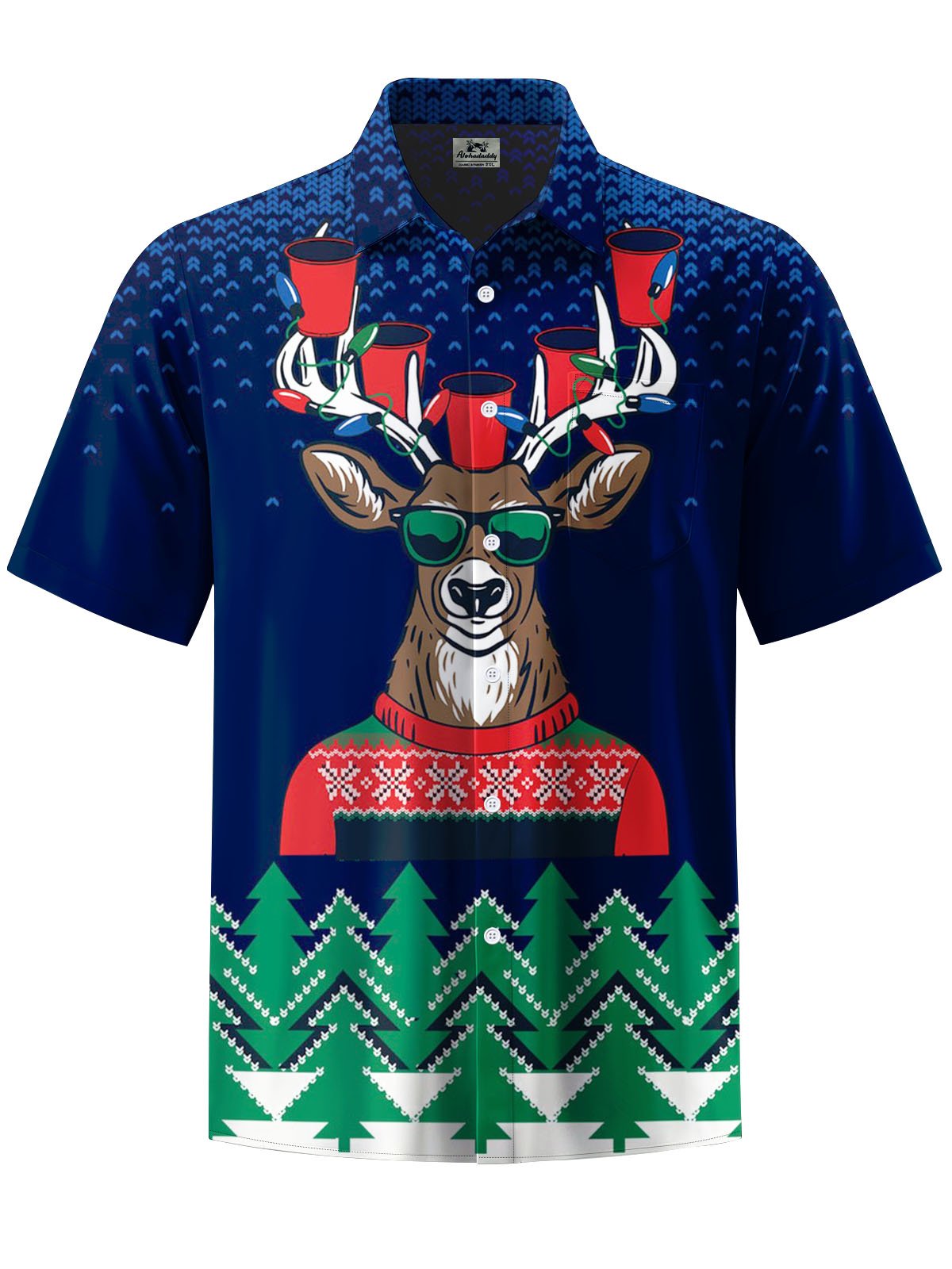 Alohadaddy® Holiday Christmas Elk Print Art Pocket Stretch Men's Short Sleeve Shirt Big & Tall