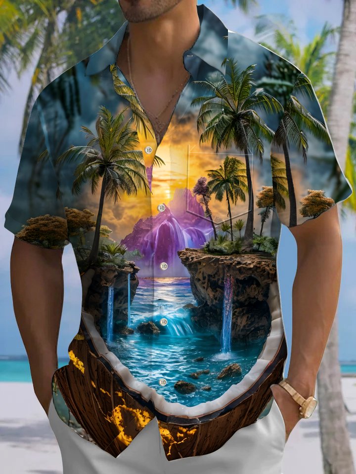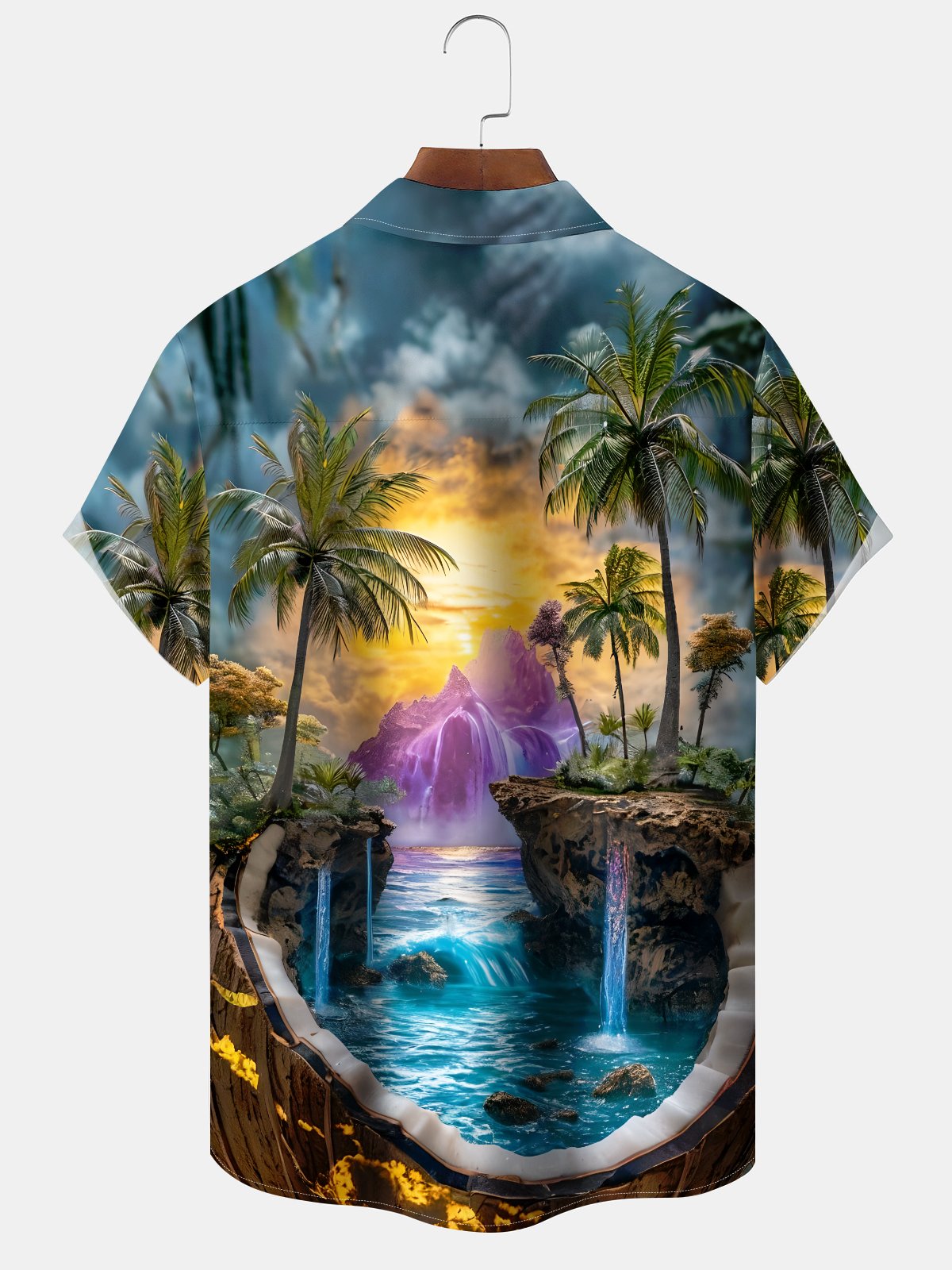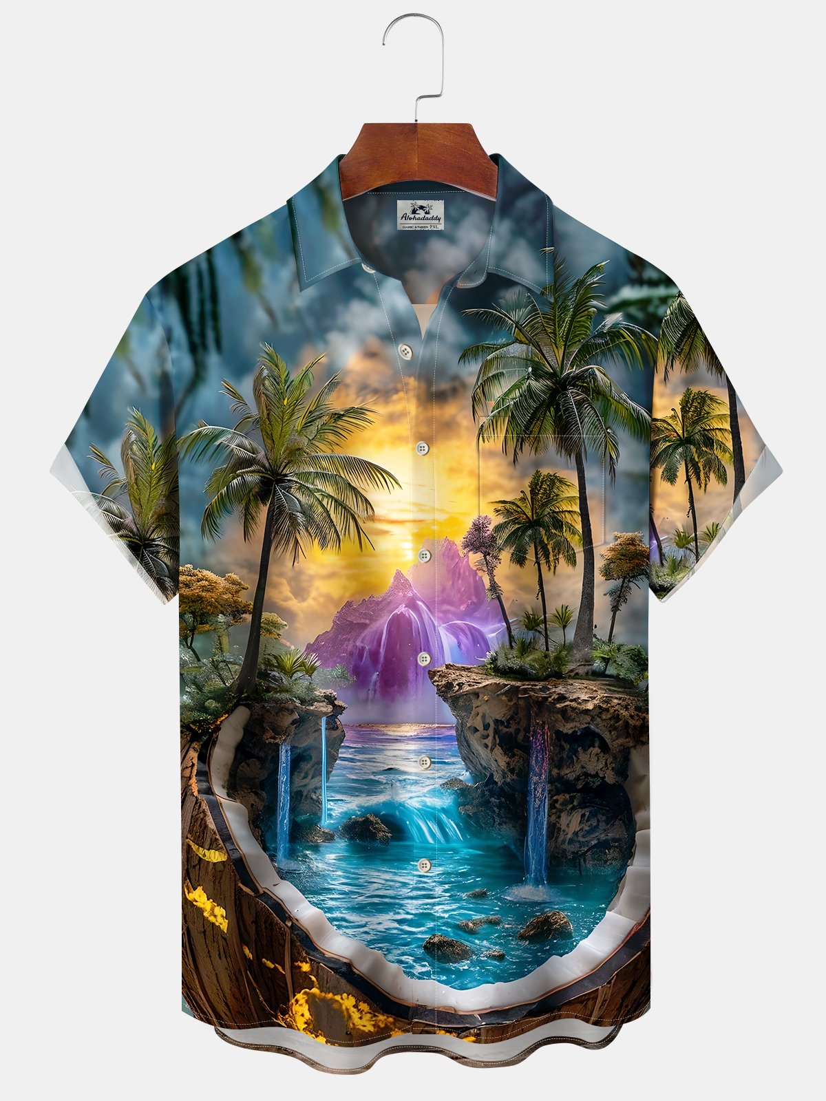 Alohadaddy® Casual Coconut Trees Beautiful Scenery Printed Art Chest Pocket Elastic Oversized Hawaiian Shirt
